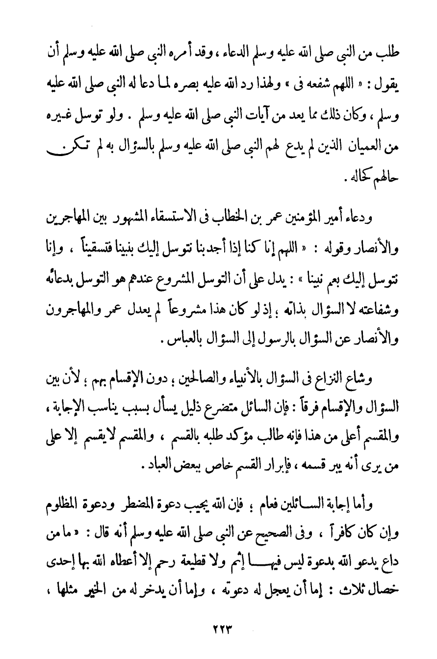 طَلَبٌ مِنْ النَّبِيِّ صَلَّى اللَّهُ عَلَيْهِ وَسَلَّمَ الدُّعَاءَ وَقَدْ أَمَرَهُ النَّبِيُّ صَلَّى اللَّهُ عَلَيْهِ وَسَلَّمَ أَنْ يَقُولَ: {اللَّهُمَّ شَفِّعْهُ فِيَّ} وَلِهَذَا رَدَّ اللَّهُ عَلَيْهِ بَصَرَهُ لَمَّا دَعَا لَهُ النَّبِيُّ صَلَّى اللَّهُ عَلَيْهِ وَسَلَّمَ وَكَانَ ذَلِكَ مِمَّا يُعَدُّ مِنْ آيَاتِ النَّبِيِّ صَلَّى اللَّهُ عَلَيْهِ وَسَلَّمَ. وَلَوْ تَوَسَّلَ غَيْرُهُ مِنْ الْعُمْيَانِ الَّذِينَ لَمْ يَدْعُ لَهُمْ النَّبِيُّ صَلَّى اللَّهُ عَلَيْهِ وَسَلَّمَ بِالسُّؤَالِ بِهِ لَمْ تَكُنْ حَالُهُمْ كَحَالِهِ. وَدُعَاءُ أَمِيرِ الْمُؤْمِنِينَ عُمَرَ بْنِ الْخَطَّابِ فِي الِاسْتِسْقَاءِ الْمَشْهُورِ بَيْنَ الْمُهَاجِرِينَ وَالْأَنْصَارِ وَقَوْلُهُ: " اللَّهُمَّ إنَّا كُنَّا إذَا أَجْدَبْنَا نَتَوَسَّلُ إلَيْك بِنَبِيِّنَا فَتَسْقِينَا وَإِنَّا نَتَوَسَّلُ إلَيْك بِعَمِّ نَبِيِّنَا ": يَدُلُّ عَلَى أَنَّ التَّوَسُّلَ الْمَشْرُوعَ عِنْدَهُمْ هُوَ التَّوَسُّلُ بِدُعَائِهِ وَشَفَاعَتِهِ لَا السُّؤَالُ بِذَاتِهِ؛ إذْ لَوْ كَانَ هَذَا مَشْرُوعًا لَمْ يَعْدِلْ عُمَرُ وَالْمُهَاجِرُونَ وَالْأَنْصَارُ عَنْ السُّؤَالِ بِالرَّسُولِ إلَى السُّؤَالِ بِالْعَبَّاسِ. وَشَاعَ النِّزَاعُ فِي السُّؤَالِ بِالْأَنْبِيَاءِ وَالصَّالِحِينَ؛ دُونَ الْإِقْسَامِ بِهِمْ؛ لِأَنَّ بَيْنَ السُّؤَالِ وَالْإِقْسَامِ فَرْقًا: فَإِنَّ السَّائِلَ مُتَضَرِّعٌ ذَلِيلٌ يَسْأَلُ بِسَبَبِ يُنَاسِبُ الْإِجَابَةَ وَالْمُقْسِمُ أَعْلَى مِنْ هَذَا فَإِنَّهُ طَالِبٌ مُؤَكِّدٌ طَلَبَهُ بِالْقَسَمِ وَالْمُقْسِمُ لَا يُقْسِمُ إلَّا عَلَى مَنْ يَرَى أَنَّهُ يُبِرُّ قَسَمَهُ فَإِبْرَارُ الْقَسَمِ خَاصٌّ بِبَعْضِ الْعِبَادِ. وَأَمَّا إجَابَةُ السَّائِلِينَ فَعَامٌّ؛ فَإِنَّ اللَّهَ يُجِيبُ دَعْوَةَ الْمُضْطَرِّ وَدَعْوَةَ الْمَظْلُومِ وَإِنْ كَانَ كَافِرًا وَفِي الصَّحِيحِ عَنْ النَّبِيِّ أَنَّهُ قَالَ: {مَا مِنْ دَاعٍ يَدْعُو اللَّهَ بِدَعْوَةِ لَيْسَ فِيهَا إثْمٌ وَلَا قَطِيعَةُ رَحِمٍ إلَّا أَعْطَاهُ اللَّهُ بِهَا إحْدَى خِصَالٍ ثَلَاثٍ: إمَّا أَنْ يُعَجِّلَ لَهُ دَعْوَتَهُ وَإِمَّا أَنْ يَدَّخِرَ لَهُ مِنْ الْخَيْرِ مِثْلَهَا