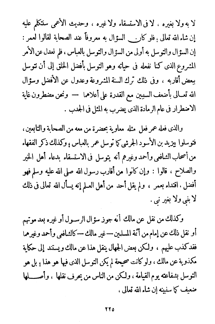 لَا بِهِ وَلَا بِغَيْرِهِ لَا فِي الِاسْتِسْقَاءِ وَلَا غَيْرِهِ وَحَدِيثُ الْأَعْمَى سَنَتَكَلَّمُ عَلَيْهِ إنْ شَاءَ اللَّهُ تَعَالَى؛ فَلَوْ كَانَ السُّؤَالُ بِهِ مَعْرُوفًا عِنْدَ الصَّحَابَةِ لَقَالُوا لِعُمَرِ: إنَّ السُّؤَالَ وَالتَّوَسُّلَ بِهِ أَوْلَى مِنْ السُّؤَالِ وَالتَّوَسُّلِ بِالْعَبَّاسِ فَلَمْ نَعْدِلْ عَنْ الْأَمْرِ الْمَشْرُوعِ الَّذِي كُنَّا نَفْعَلُهُ فِي حَيَاتِهِ وَهُوَ التَّوَسُّلُ بِأَفْضَلِ الْخَلْقِ إلَى أَنْ نَتَوَسَّلَ بِبَعْضِ أَقَارِبِهِ وَفِي ذَلِكَ تَرْكُ السُّنَّةِ الْمَشْرُوعَةِ وَعُدُولٌ عَنْ الْأَفْضَلِ وَسُؤَالُ اللَّهِ تَعَالَى بِأَضْعَفِ السَّبَبَيْنِ مَعَ الْقُدْرَةِ عَلَى أَعْلَاهُمَا - وَنَحْنُ مُضْطَرُّونَ غَايَةَ الِاضْطِرَارِ فِي عَامِ الرَّمَادَةِ الَّذِي يُضْرَبُ بِهِ الْمَثَلُ فِي الْجَدْبِ. وَاَلَّذِي فَعَلَهُ عُمَرُ فَعَلَ مِثْلَهُ مُعَاوِيَةُ بِحَضْرَةِ مَنْ مَعَهُ مِنْ الصَّحَابَةِ وَالتَّابِعِينَ فَتَوَسَّلُوا بيزيد بْنِ الْأَسْوَدِ الجرشي كَمَا تَوَسَّلَ عُمَرُ بِالْعَبَّاسِ؛ وَكَذَلِكَ ذَكَرَ الْفُقَهَاءُ مِنْ أَصْحَابِ الشَّافِعِيِّ وَأَحْمَدَ وَغَيْرِهِمْ أَنَّهُ يُتَوَسَّلُ فِي الِاسْتِسْقَاءِ بِدُعَاءِ أَهْلِ الْخَيْرِ وَالصَّلَاحِ قَالُوا: وَإِنْ كَانُوا مِنْ أَقَارِبِ رَسُولِ اللَّهِ صَلَّى اللَّهُ عَلَيْهِ وَسَلَّمَ فَهُوَ أَفْضَلُ اقْتِدَاءً بِعُمَرِ وَلَمْ يَقُلْ أَحَدٌ مِنْ أَهْلِ الْعِلْمِ إنَّهُ يُسْأَلُ اللَّهُ تَعَالَى فِي ذَلِكَ لَا بِنَبِيِّ وَلَا بِغَيْرِ نَبِيٍّ.