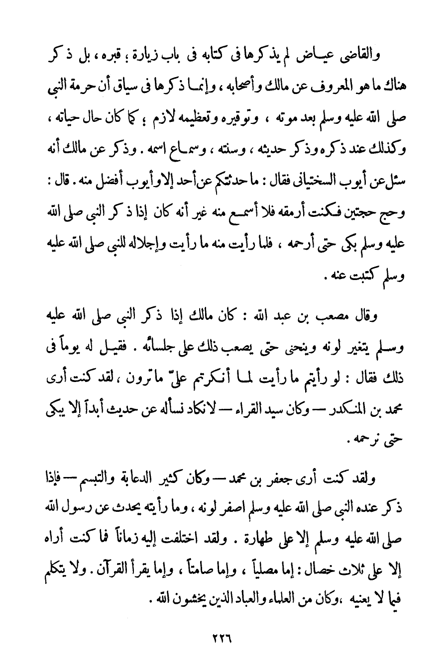 وَالْقَاضِي عِيَاضٌ لَمْ يَذْكُرْهَا فِي كِتَابِهِ فِي بَابِ زِيَارَةِ؛ قَبْرِهِ بَلْ ذَكَرَ هُنَاكَ مَا هُوَ الْمَعْرُوفُ عَنْ مَالِكٍ وَأَصْحَابِهِ وَإِنَّمَا ذَكَرَهَا فِي سِيَاقِ أَنَّ حُرْمَةَ النَّبِيِّ صَلَّى اللَّهُ عَلَيْهِ وَسَلَّمَ بَعْدَ مَوْتِهِ وَتَوْقِيرَهُ وَتَعْظِيمَهُ لَازِمٌ؛ كَمَا كَانَ حَالَ حَيَاتِهِ وَكَذَلِكَ عِنْدَ ذِكْرِهِ وَذِكْرِ حَدِيثِهِ وَسُنَّتِهِ وَسَمَاعِ اسْمِهِ. وَذُكِرَ عَنْ مَالِكٍ أَنَّهُ سُئِلَ عَنْ أَيُّوبَ السختياني فَقَالَ: مَا حَدَّثْتُكُمْ عَنْ أَحَدٍ إلَّا وَأَيُّوبُ أَفْضَلُ مِنْهُ. قَالَ: وَحَجَّ حَجَّتَيْنِ فَكُنْت أَرْمُقُهُ فَلَا أَسْمَعُ مِنْهُ غَيْرَ أَنَّهُ كَانَ إذَا ذُكِرَ النَّبِيُّ صَلَّى اللَّهُ عَلَيْهِ وَسَلَّمَ بَكَى حَتَّى أَرْحَمَهُ فَلَمَّا رَأَيْت مِنْهُ مَا رَأَيْت وَإِجْلَالَهُ لِلنَّبِيِّ صَلَّى اللَّهُ عَلَيْهِ وَسَلَّمَ كَتَبْت عَنْهُ. وَقَالَ مُصْعَبُ بْنُ عَبْدِ اللَّهِ: كَانَ مَالِكٌ إذَا ذُكِرَ النَّبِيُّ صَلَّى اللَّهُ عَلَيْهِ وَسَلَّمَ يَتَغَيَّرُ لَوْنُهُ وَيَنْحَنِي حَتَّى يَصْعُبَ ذَلِكَ عَلَى جُلَسَائِهِ. فَقِيلَ لَهُ يَوْمًا فِي ذَلِكَ فَقَالَ: لَوْ رَأَيْتُمْ مَا رَأَيْت لَمَا أَنْكَرْتُمْ عَلَيَّ مَا تَرَوْنَ لَقَدْ كُنْت أَرَى مُحَمَّدَ بْنَ الْمُنْكَدِرِ - وَكَانَ سَيِّدَ الْقُرَّاءِ - لَا نَكَادُ نَسْأَلُهُ عَنْ حَدِيثٍ أَبَدًا إلَّا يَبْكِي حَتَّى نَرْحَمَهُ. وَلَقَدْ كُنْت أَرَى جَعْفَرَ بْنَ مُحَمَّدٍ - وَكَانَ كَثِيرَ الدُّعَابَةِ وَالتَّبَسُّمِ - فَإِذَا ذُكِرَ عِنْدَهُ النَّبِيُّ صَلَّى اللَّهُ عَلَيْهِ وَسَلَّمَ اصْفَرَّ لَوْنُهُ وَمَا رَأَيْته يُحَدِّثُ عَنْ رَسُولِ اللَّهِ صَلَّى اللَّهُ عَلَيْهِ وَسَلَّمَ إلَّا عَلَى طَهَارَةٍ. وَلَقَدْ اخْتَلَفْت إلَيْهِ زَمَانًا فَمَا كُنْت أَرَاهُ إلَّا عَلَى ثَلَاثِ خِصَالٍ: إمَّا مُصَلِّيًا وَإِمَّا صَامِتًا وَإِمَّا يَقْرَأُ الْقُرْآنَ. وَلَا يَتَكَلَّمُ فِيمَا لَا يَعْنِيهِ وَكَانَ مِنْ الْعُلَمَاءِ وَالْعُبَّادِ الَّذِينَ يَخْشَوْنَ اللَّهَ.