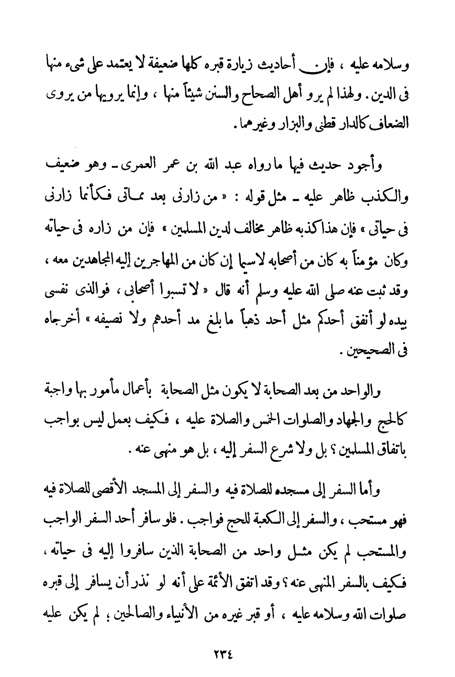 وَسَلَامُهُ عَلَيْهِ فَإِنَّ أَحَادِيثَ زِيَارَةِ قَبْرِهِ كُلُّهَا ضَعِيفَةٌ لَا يُعْتَمَدُ عَلَى شَيْءٍ مِنْهَا فِي الدِّينِ. وَلِهَذَا لَمْ يَرْوِ أَهْلُ الصِّحَاحِ وَالسُّنَنِ شَيْئًا مِنْهَا وَإِنَّمَا يَرْوِيهَا مَنْ يَرْوِي الضِّعَافَ كالدارقطني وَالْبَزَّارِ وَغَيْرِهِمَا. [وَأَجْوَدُ حَدِيثٍ فِيهَا مَا رَوَاهُ عَبْدُ اللَّهِ بْنُ عُمَرَ الْعُمَرِيُّ - وَهُوَ ضَعِيفٌ وَالْكَذِبُ ظَاهِرٌ عَلَيْهِ - مِثْلُ قَوْلِهِ: {مَنْ زَارَنِي بَعْدَ مَمَاتِي فَكَأَنَّمَا زَارَنِي فِي حَيَاتِي} فَإِنَّ هَذَا كَذِبُهُ ظَاهِرٌ مُخَالِفٌ لِدِينِ الْمُسْلِمِينَ] (*) فَإِنَّ مَنْ زَارَهُ فِي حَيَاتِهِ وَكَانَ مُؤْمِنًا بِهِ كَانَ مِنْ أَصْحَابِهِ لَا سِيَّمَا إنْ كَانَ مِنْ الْمُهَاجِرِينَ إلَيْهِ الْمُجَاهِدِينَ مَعَهُ وَقَدْ ثَبَتَ عَنْهُ صَلَّى اللَّهُ عَلَيْهِ وَسَلَّمَ أَنَّهُ قَالَ {لَا تَسُبُّوا أَصْحَابِي فَوَاَلَّذِي نَفْسِي بِيَدِهِ لَوْ أَنْفَقَ أَحَدُكُمْ مِثْلَ أُحُدٍ ذَهَبًا مَا بَلَغَ مُدَّ أَحَدِهِمْ وَلَا نَصِيفَهُ} أَخْرَجَاهُ فِي الصَّحِيحَيْنِ. وَالْوَاحِدُ مِنْ بَعْدِ الصَّحَابَةِ لَا يَكُونُ مِثْلَ الصَّحَابَةِ بِأَعْمَالِ مَأْمُورٍ بِهَا وَاجِبَةٍ كَالْحَجِّ وَالْجِهَادِ وَالصَّلَوَاتِ الْخَمْسِ وَالصَّلَاةِ عَلَيْهِ فَكَيْفَ بِعَمَلِ لَيْسَ بِوَاجِبِ بِاتِّفَاقِ الْمُسْلِمِينَ؟ بَلْ وَلَا شُرِعَ السَّفَرُ إلَيْهِ بَلْ هُوَ مَنْهِيٌّ عَنْهُ. وَأَمَّا السَّفَرُ إلَى مَسْجِدِهِ لِلصَّلَاةِ فِيهِ وَالسَّفَرِ إلَى الْمَسْجِدِ الْأَقْصَى لِلصَّلَاةِ فِيهِ فَهُوَ مُسْتَحَبٌّ وَالسَّفَرِ إلَى الْكَعْبَةِ لِلْحَجِّ فَوَاجِبٌ. فَلَوْ سَافَرَ أَحَدٌ السَّفَرَ الْوَاجِبَ وَالْمُسْتَحَبَّ لَمْ يَكُنْ مِثْلَ وَاحِدٍ مِنْ الصَّحَابَةِ الَّذِينَ سَافَرُوا إلَيْهِ فِي حَيَاتِهِ فَكَيْفَ بِالسَّفَرِ الْمَنْهِيِّ عَنْهُ وَقَدْ اتَّفَقَ الْأَئِمَّةُ عَلَى أَنَّهُ لَوْ نَذَرَ أَنْ يُسَافِرَ إلَى قَبْرِهِ صَلَوَاتُ اللَّهِ وَسَلَامُهُ عَلَيْهِ أَوْ قَبْرِ غَيْرِهِ مِنْ الْأَنْبِيَاءِ وَالصَّالِحِينَ؛ لَمْ يَكُنْ عَلَيْهِ