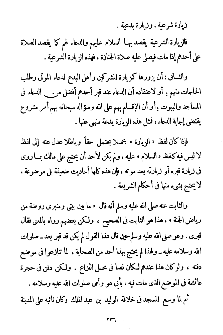 فَالزِّيَارَةُ الشَّرْعِيَّةُ يُقْصَدُ بِهَا السَّلَامُ عَلَيْهِمْ وَالدُّعَاءُ لَهُمْ كَمَا يُقْصَدُ الصَّلَاةُ عَلَى أَحَدِهِمْ إذَا مَاتَ فَيُصَلَّى عَلَيْهِ صَلَاةَ الْجِنَازَةِ فَهَذِهِ الزِّيَارَةُ الشَّرْعِيَّةُ. وَالثَّانِي: أَنْ يَزُورَهَا كَزِيَارَةِ الْمُشْرِكِينَ وَأَهْلِ الْبِدَعِ لِدُعَاءِ الْمَوْتَى وَطَلَبِ الْحَاجَاتِ مِنْهُمْ؛ أَوْ لِاعْتِقَادِهِ أَنَّ الدُّعَاءَ عِنْدَ قَبْرِ أَحَدِهِمْ أَفْضَلُ مِنْ الدُّعَاءِ فِي الْمَسَاجِدِ وَالْبُيُوتِ؛ أَوْ أَنَّ الْإِقْسَامَ بِهِمْ عَلَى اللَّهِ وَسُؤَالَهُ سُبْحَانَهُ بِهِمْ أَمْرٌ مَشْرُوعٌ يَقْتَضِي إجَابَةَ الدُّعَاءِ فَمِثْلُ هَذِهِ الزِّيَارَةِ بِدْعَةٌ مَنْهِيٌّ عَنْهَا. فَإِذَا كَانَ لَفْظُ " الزِّيَارَةِ " مُجْمَلًا يَحْتَمِلُ حَقًّا وَبَاطِلًا عُدِلَ عَنْهُ إلَى لَفْظٍ. لَا لَبْسَ فِيهِ كَلَفْظِ " السَّلَامِ " عَلَيْهِ وَلَمْ يَكُنْ لِأَحَدِ أَنْ يَحْتَجَّ عَلَى مَالِكٍ بِمَا رُوِيَ فِي زِيَارَةِ قَبْرِهِ أَوْ زِيَارَتِهِ بَعْدَ مَوْتِهِ فَإِنَّ هَذِهِ كُلَّهَا أَحَادِيثُ ضَعِيفَةٌ بَلْ مَوْضُوعَةٌ لَا يُحْتَجُّ بِشَيْءِ مِنْهَا فِي أَحْكَامِ الشَّرِيعَةِ وَالثَّابِتُ عَنْهُ صَلَّى اللَّهُ عَلَيْهِ وَسَلَّمَ أَنَّهُ قَالَ {مَا بَيْنَ بَيْتِي وَمِنْبَرِي رَوْضَةٌ مِنْ رِيَاضِ الْجَنَّةِ} هَذَا هُوَ الثَّابِتُ فِي الصَّحِيحِ وَلَكِنَّ بَعْضَهُمْ رَوَاهُ بِالْمَعْنَى فَقَالَ قَبْرِي. وَهُوَ صَلَّى اللَّهُ عَلَيْهِ وَسَلَّمَ حِينَ قَالَ هَذَا الْقَوْلَ لَمْ يَكُنْ قَدْ قُبِرَ بَعْدُ صَلَوَاتُ اللَّهِ وَسَلَامُهُ عَلَيْهِ وَلِهَذَا لَمْ يَحْتَجَّ بِهَذَا أَحَدٌ مِنْ الصَّحَابَةِ لَمَّا تَنَازَعُوا فِي مَوْضِعِ دَفْنِهِ وَلَوْ كَانَ هَذَا عِنْدَهُمْ لَكَانَ نَصًّا فِي مَحَلِّ النِّزَاعِ. وَلَكِنْ دُفِنَ فِي حُجْرَةِ عَائِشَةَ فِي الْمَوْضِعِ الَّذِي مَاتَ فِيهِ بِأَبِي هُوَ وَأُمِّي صَلَوَاتُ اللَّهِ عَلَيْهِ وَسَلَامُهُ. ثُمَّ لَمَّا وُسِّعَ الْمَسْجِدُ فِي خِلَافَةِ الْوَلِيدِ بْنِ عَبْدِ الْمَلِكِ وَكَانَ نَائِبُهُ عَلَى الْمَدِينَةِ