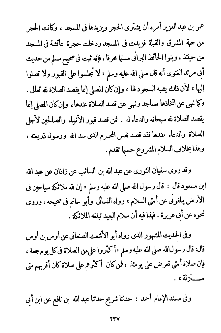 عُمَرَ بْنَ عَبْدِ الْعَزِيزِ أَمَرَهُ أَنْ يَشْتَرِيَ الْحُجَرَ وَيَزِيدَهَا فِي الْمَسْجِدِ وَكَانَتْ الْحُجَرُ مِنْ جِهَةِ الْمَشْرِقِ وَالْقِبْلَةِ فَزِيدَتْ فِي الْمَسْجِدِ وَدَخَلَتْ حُجْرَةُ عَائِشَةَ فِي الْمَسْجِدِ مِنْ حِينَئِذٍ وَبَنَوْا الْحَائِطَ البراني مُسَنَّمًا مُحَرَّفًا فَإِنَّهُ ثَبَتَ فِي صَحِيحِ مُسْلِمٍ مِنْ حَدِيثِ أَبِي مَرْثَدٍ الغنوي أَنَّهُ قَالَ صَلَّى اللَّهُ عَلَيْهِ وَسَلَّمَ {لَا تَجْلِسُوا عَلَى الْقُبُورِ وَلَا تُصَلُّوا إلَيْهَا} لِأَنَّ ذَلِكَ يُشْبِهُ السُّجُودَ لَهَا وَإِنْ كَانَ الْمُصَلِّي إنَّمَا يَقْصِدُ الصَّلَاةَ لِلَّهِ تَعَالَى. وَكَمَا نُهِيَ عَنْ اتِّخَاذِهَا مَسَاجِدَ وَنُهِيَ عَنْ قَصْدِ الصَّلَاةِ عِنْدَهَا وَإِنْ كَانَ الْمُصَلِّي إنَّمَا يَقْصِدُ الصَّلَاةَ لِلَّهِ سُبْحَانَهُ وَالدُّعَاءَ لَهُ. فَمَنْ قَصَدَ قُبُورَ الْأَنْبِيَاءِ وَالصَّالِحِينَ لِأَجْلِ الصَّلَاةِ وَالدُّعَاءِ عِنْدَهَا فَقَدْ قَصَدَ نَفْسَ الْمُحَرَّمِ الَّذِي سَدَّ اللَّهُ وَرَسُولُهُ ذَرِيعَتَهُ وَهَذَا بِخِلَافِ السَّلَامِ الْمَشْرُوعِ حَسْبَمَا تَقَدَّمَ. وَقَدْ رَوَى سُفْيَانُ الثَّوْرِيُّ عَنْ عَبْدِ اللَّهِ بْنِ السَّائِبِ عَنْ زاذان عَنْ عَبْدِ اللَّهِ بْنِ مَسْعُودٍ قَالَ: قَالَ رَسُولُ اللَّهِ صَلَّى اللَّهُ عَلَيْهِ وَسَلَّمَ {إنَّ لِلَّهِ مَلَائِكَةً سَيَّاحِينَ فِي الْأَرْضِ يُبَلِّغُونِي عَنْ أُمَّتِي السَّلَامَ} رَوَاهُ النَّسَائِي وَأَبُو حَاتِمٍ فِي صَحِيحِهِ وَرُوِيَ نَحْوُهُ عَنْ أَبِي هُرَيْرَةَ. فَهَذَا فِيهِ أَنَّ سَلَامَ الْبَعِيدِ تُبَلِّغُهُ الْمَلَائِكَةُ. وَفِي الْحَدِيثِ الْمَشْهُورِ الَّذِي رَوَاهُ أَبُو الْأَشْعَثِ الصَّنْعَانِي عَنْ أَوْسِ بْنِ أَوْسٍ قَالَ: قَالَ رَسُولُ اللَّهِ صَلَّى اللَّهُ عَلَيْهِ وَسَلَّمَ {أَكْثِرُوا عَلَيَّ مِنْ الصَّلَاةِ فِي كُلِّ يَوْمِ جُمُعَةٍ فَإِنَّ صَلَاةَ أُمَّتِي تُعْرَضُ عَلَيَّ يَوْمَئِذٍ فَمَنْ كَانَ أَكْثَرَهُمْ عَلَيَّ صَلَاةً كَانَ أَقْرَبَهُمْ مِنِّي مَنْزِلَةً} . وَفِي مُسْنَدِ الْإِمَامِ أَحْمَدَ: حَدَّثَنَا شريح حَدَّثَنَا عَبْدُ اللَّهِ بْنُ نَافِعٍ عَنْ ابْنِ