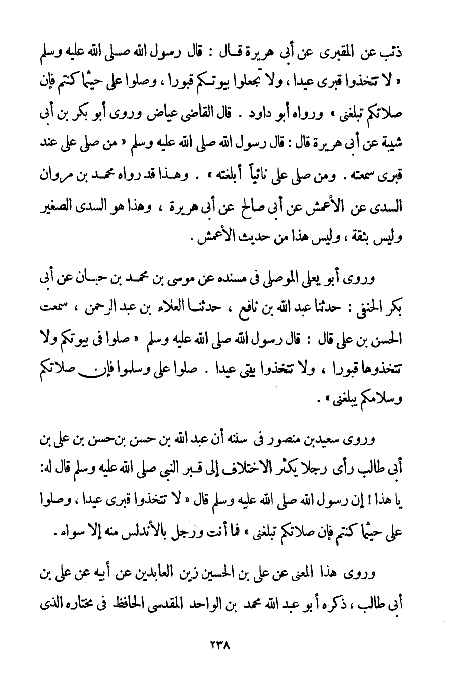 أَبِي ذِئْبٍ عَنْ المقبري عَنْ أَبِي هُرَيْرَةَ قَالَ: قَالَ رَسُولُ اللَّهِ صَلَّى اللَّهُ عَلَيْهِ وَسَلَّمَ {لَا تَتَّخِذُوا قَبْرِي عِيدًا وَلَا تَجْعَلُوا بُيُوتَكُمْ قُبُورًا وَصَلُّوا عَلَيَّ حَيْثُمَا كُنْتُمْ فَإِنَّ صَلَاتَكُمْ تَبْلُغُنِي} وَرَوَاهُ أَبُو دَاوُد. قَالَ الْقَاضِي عِيَاضٌ وَرَوَى أَبُو بَكْرِ بْنُ أَبِي شَيْبَةَ عَنْ أَبِي هُرَيْرَةَ قَالَ: قَالَ رَسُولُ اللَّهِ صَلَّى اللَّهُ عَلَيْهِ وَسَلَّمَ {مَنْ صَلَّى عَلَيَّ عِنْدَ قَبْرِي سَمِعْته وَمَنْ صَلَّى عَلَيَّ نَائِيًا أُبْلِغْته} . وَهَذَا قَدْ رَوَاهُ مُحَمَّدُ بْنُ مَرْوَانَ السدي عَنْ الْأَعْمَشِ عَنْ أَبِي صَالِحٍ عَنْ أَبِي هُرَيْرَةَ وَهَذَا هُوَ السدي الصَّغِيرُ وَلَيْسَ بِثِقَةِ وَلَيْسَ هَذَا مِنْ حَدِيثِ الْأَعْمَشِ. وَرَوَى أَبُو يَعْلَى الموصلي فِي مُسْنَدِهِ عَنْ مُوسَى بْنِ مُحَمَّدِ بْنِ حِبَّانَ عَنْ أَبِي بَكْرٍ الْحَنَفِيِّ: حَدَّثَنَا عَبْدُ اللَّهِ بْنُ نَافِعٍ حَدَّثَنَا الْعَلَاءُ بْنُ عَبْدِ الرَّحْمَنِ سَمِعْت الْحَسَنَ بْنَ عَلِيٍّ قَالَ: قَالَ رَسُولُ اللَّهِ صَلَّى اللَّهُ عَلَيْهِ وَسَلَّمَ {صَلُّوا فِي بُيُوتِكُمْ وَلَا تَتَّخِذُوهَا قُبُورًا وَلَا تَتَّخِذُوا بَيْتِي عِيدًا. صَلُّوا عَلَيَّ وَسَلِّمُوا فَإِنَّ صَلَاتَكُمْ وَسَلَامَكُمْ يَبْلُغُنِي} . وَرَوَى سَعِيدُ بْنُ مَنْصُورٍ فِي سُنَنِهِ أَنَّ عَبْدَ اللَّهِ بْنَ حَسَنِ بْنِ حَسَنِ بْنِ عَلِيِّ بْنِ أَبِي طَالِبٍ رَأَى رَجُلًا يُكْثِرُ الِاخْتِلَافَ إلَى قَبْرِ النَّبِيِّ صَلَّى اللَّهُ عَلَيْهِ وَسَلَّمَ قَالَ لَهُ: يَا هَذَا إنَّ رَسُولَ اللَّهِ صَلَّى اللَّهُ عَلَيْهِ وَسَلَّمَ قَالَ {لَا تَتَّخِذُوا قَبْرِي عِيدًا وَصَلُّوا عَلَيَّ حَيْثُمَا كُنْتُمْ فَإِنَّ صَلَاتَكُمْ تَبْلُغُنِي} فَمَا أَنْتَ وَرَجُلٌ بِالْأَنْدَلُسِ مِنْهُ إلَّا سَوَاءٌ. وَرُوِيَ هَذَا الْمَعْنَى عَنْ عَلِيِّ بْنِ الْحُسَيْنِ زَيْنِ الْعَابِدِينَ عَنْ أَبِيهِ عَنْ عَلِيِّ بْنِ أَبِي طَالِبٍ ذَكَرَهُ أَبُو عَبْدِ اللَّهِ مُحَمَّدُ بْنُ عَبْدِ الْوَاحِدِ المقدسي الْحَافِظُ فِي مُخْتَارِهِ الَّذِي