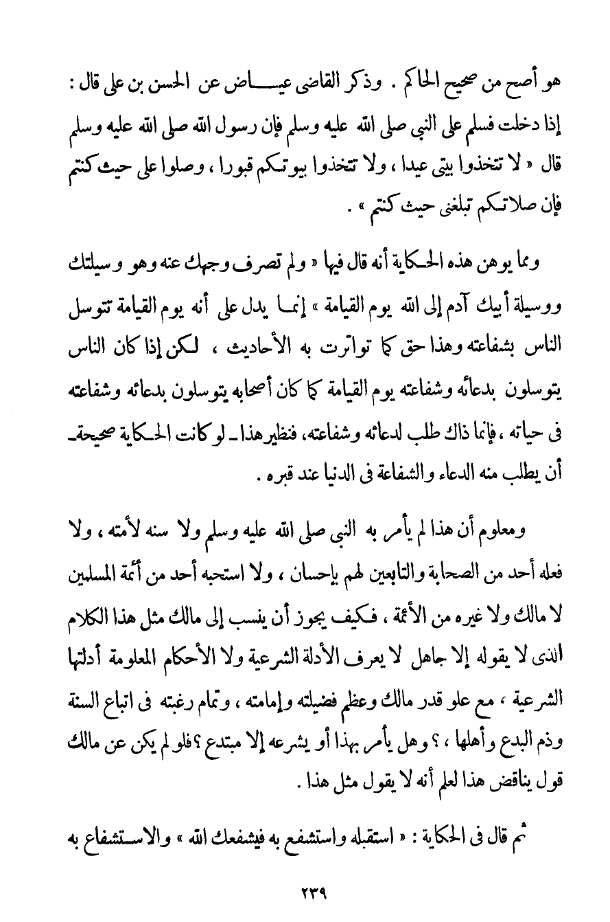 هُوَ أَصَحُّ مِنْ صَحِيحِ الْحَاكِمِ. وَذَكَرَ الْقَاضِي عِيَاضٌ عَنْ الْحَسَنِ بْنِ عَلِيٍّ قَالَ: إذَا دَخَلْت فَسَلِّمْ عَلَى النَّبِيِّ صَلَّى اللَّهُ عَلَيْهِ وَسَلَّمَ فَإِنَّ رَسُولَ اللَّهِ صَلَّى اللَّهُ عَلَيْهِ وَسَلَّمَ قَالَ {لَا تَتَّخِذُوا بَيْتِي عِيدًا وَلَا تَتَّخِذُوا بُيُوتَكُمْ قُبُورًا وَصَلُّوا عَلَيَّ حَيْثُ كُنْتُمْ فَإِنَّ صَلَاتَكُمْ تَبْلُغُنِي حَيْثُ كُنْتُمْ} .