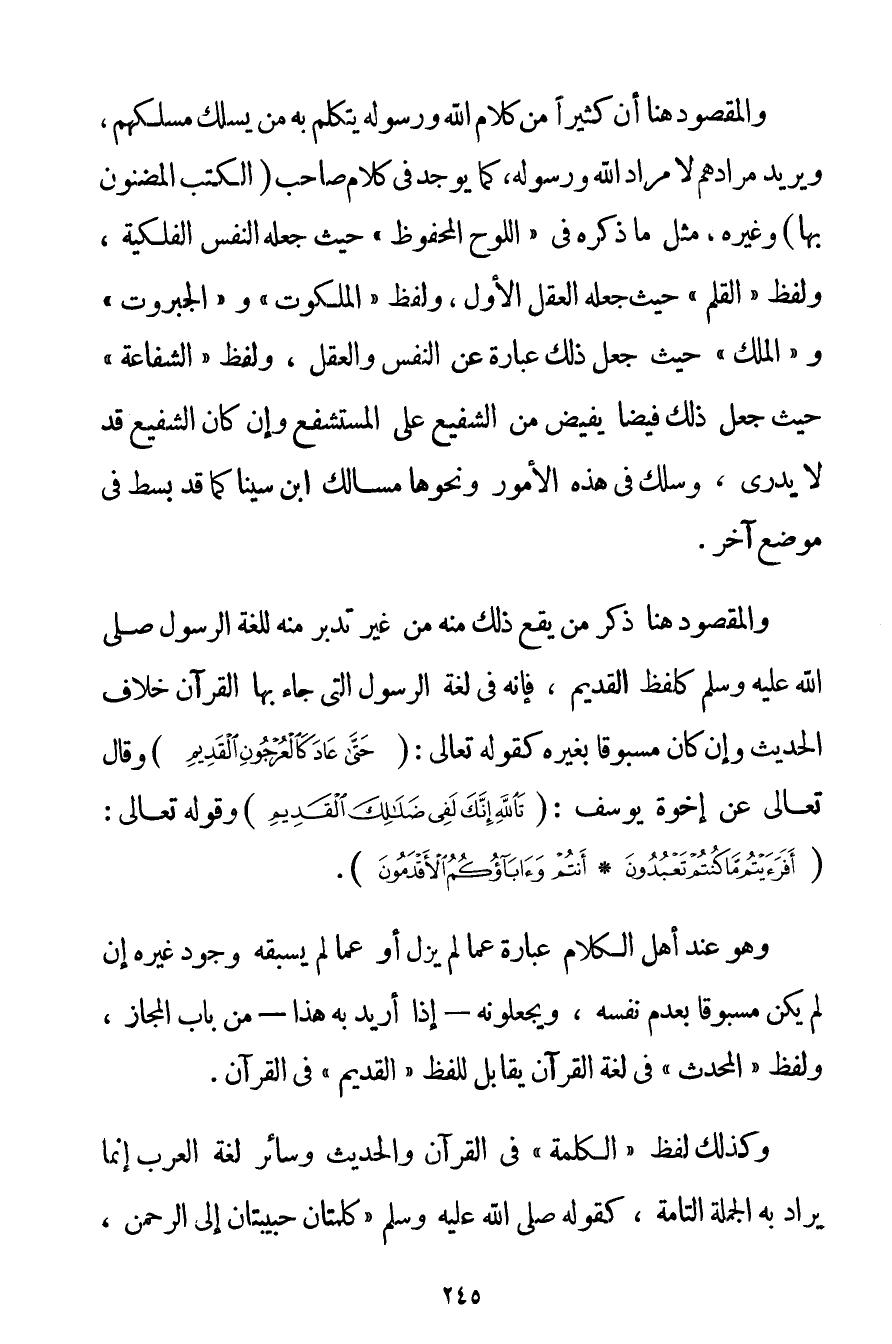 وَالْمَقْصُودُ هُنَا أَنَّ كَثِيرًا مِنْ كَلَامِ اللَّهِ وَرَسُولِهِ يَتَكَلَّمُ بِهِ مَنْ يَسْلُكُ مَسْلَكَهُمْ وَيُرِيدُ مُرَادَهُمْ لَا مُرَادَ اللَّهِ وَرَسُولِهِ كَمَا يُوجَدُ فِي كَلَامِ صَاحِبِ (الْكُتُبِ الْمَضْنُونِ بِهَا وَغَيْرِهِ مِثْلُ مَا ذَكَرَهُ فِي " اللَّوْحِ الْمَحْفُوظِ " حَيْثُ جَعَلَهُ النَّفْسَ الْفَلَكِيَّةَ وَلَفْظِ " الْقَلَمِ " حَيْثُ جَعَلَهُ الْعَقْلَ الْأَوَّلَ وَلَفْظِ " الْمَلَكُوتِ " وَ " الْجَبَرُوتِ " وَ " الْمُلْكِ " حَيْثُ جَعَلَ ذَلِكَ عِبَارَةً عَنْ النَّفْسِ وَالْعَقْلِ وَلَفْظَ " الشَّفَاعَةِ " حَيْثُ جَعَلَ ذَلِكَ فَيْضًا يَفِيضُ مِنْ الشَّفِيعِ عَلَى الْمُسْتَشْفِعِ وَإِنْ كَانَ الشَّفِيعُ قَدْ لَا يَدْرِي وَسَلَكَ فِي هَذِهِ الْأُمُورِ وَنَحْوِهَا مَسَالِكَ ابْنِ سِينَا كَمَا قَدْ بُسِطَ فِي مَوْضِعٍ آخَرَ. وَالْمَقْصُودُ هُنَا ذِكْرُ مَنْ يَقَعُ ذَلِكَ مِنْهُ مِنْ غَيْرِ تَدَبُّرٍ مِنْهُ لِلُغَةِ الرَّسُولِ صَلَّى اللَّهُ عَلَيْهِ وَسَلَّمَ كَلَفْظِ الْقَدِيمِ فَإِنَّهُ فِي لُغَةِ الرَّسُولِ الَّتِي جَاءَ بِهَا الْقُرْآنُ خِلَافُ الْحَدِيثِ وَإِنْ كَانَ مَسْبُوقًا بِغَيْرِهِ كَقَوْلِهِ تَعَالَى: {حَتَّى عَادَ كَالْعُرْجُونِ الْقَدِيمِ} وَقَالَ تَعَالَى عَنْ إخْوَةِ يُوسُفَ: {تَاللَّهِ إنَّكَ لَفِي ضَلَالِكَ الْقَدِيمِ} وقَوْله تَعَالَى {أَفَرَأَيْتُمْ مَا كُنْتُمْ تَعْبُدُونَ} {أَنْتُمْ وَآبَاؤُكُمُ الْأَقْدَمُونَ} . وَهُوَ عِنْدَ أَهْلِ الْكَلَامِ عِبَارَةٌ عَمَّا لَمْ يَزَلْ أَوْ عَمَّا لَمْ يَسْبِقْهُ وُجُودُ غَيْرِهِ إنْ لَمْ يَكُنْ مَسْبُوقًا بِعَدَمِ نَفْسِهِ وَيَجْعَلُونَهُ - إذَا أُرِيدَ بِهِ هَذَا - مِنْ بَابِ الْمَجَازِ وَلَفْظُ " الْمُحْدَثِ " فِي لُغَةِ الْقُرْآنِ يُقَابِلُ لِلَفْظِ " الْقَدِيمِ " فِي الْقُرْآنِ. وَكَذَلِكَ لَفْظُ " الْكَلِمَةِ " فِي الْقُرْآنِ وَالْحَدِيثِ وَسَائِرِ لُغَةِ الْعَرَبِ إنَّمَا يُرَادُ بِهِ الْجُمْلَةُ التَّامَّةُ كَقَوْلِهِ صَلَّى اللَّهُ عَلَيْهِ وَسَلَّمَ {كَلِمَتَانِ حَبِيبَتَانِ إلَى الرَّحْمَنِ