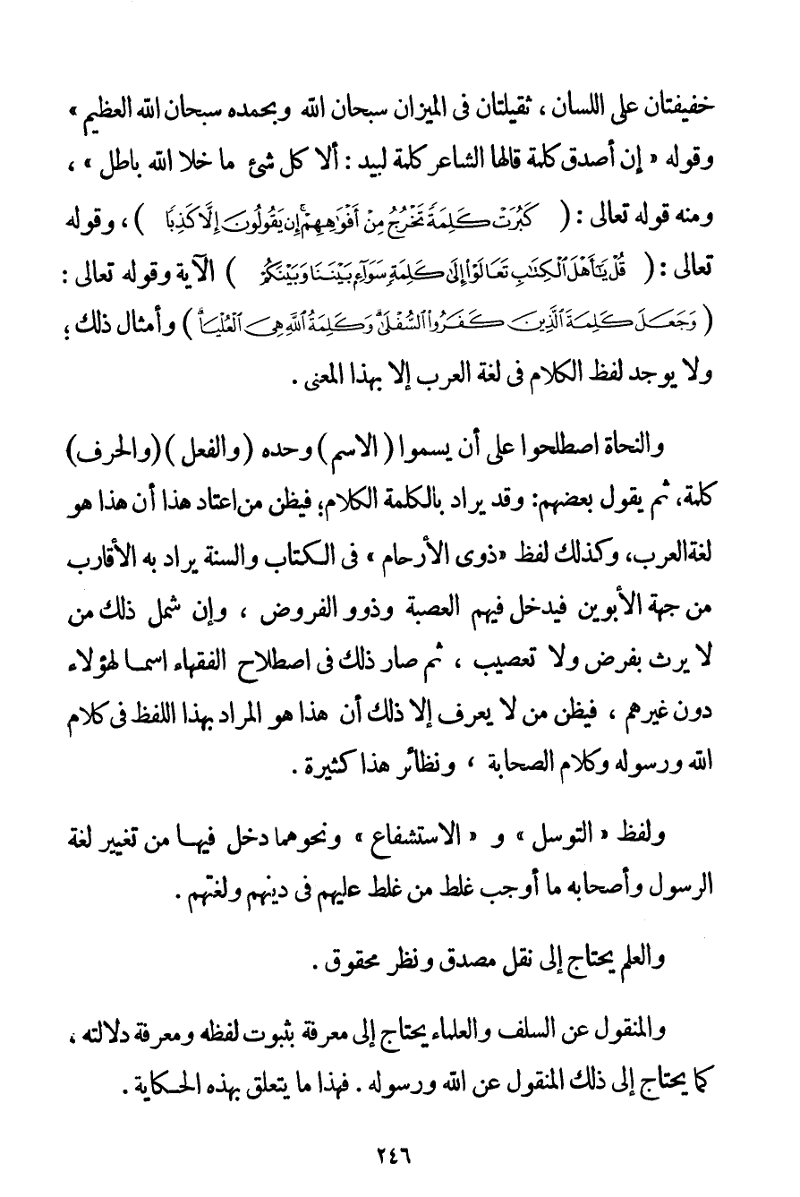 خَفِيفَتَانِ عَلَى اللِّسَانِ ثَقِيلَتَانِ فِي الْمِيزَانِ سُبْحَانَ اللَّهِ وَبِحَمْدِهِ سُبْحَانَ اللَّهِ الْعَظِيمِ} وَقَوْلِهِ {إنَّ أَصْدَقَ كَلِمَةٍ قَالَهَا الشَّاعِرُ كَلِمَةُ لَبِيَدٍ: أَلَا كُلُّ شَيْءٍ مَا خَلَا اللَّهَ بَاطِلُ} وَمِنْهُ قَوْله تَعَالَى {كَبُرَتْ كَلِمَةً تَخْرُجُ مِنْ أَفْوَاهِهِمْ إنْ يَقُولُونَ إلَّا كَذِبًا} وقَوْله تَعَالَى {قُلْ يَا أَهْلَ الْكِتَابِ تَعَالَوْا إلَى كَلِمَةٍ سَوَاءٍ بَيْنَنَا وَبَيْنَكُمْ} الْآيَةَ وقَوْله تَعَالَى {وَجَعَلَ كَلِمَةَ الَّذِينَ كَفَرُوا السُّفْلَى وَكَلِمَةُ اللَّهِ هِيَ الْعُلْيَا} وَأَمْثَالُ ذَلِكَ؛ وَلَا يُوجَدُ لَفْظُ الْكَلَامِ فِي لُغَةِ الْعَرَبِ إلَّا بِهَذَا الْمَعْنَى. وَالنُّحَاةُ اصْطَلَحُوا عَلَى أَنْ يُسَمُّوا (الِاسْمَ وَحْدَهُ (وَالْفِعْلَ (وَالْحَرْفَ كَلِمَةً ثُمَّ يَقُولُ بَعْضُهُمْ: وَقَدْ يُرَادُ بِالْكَلِمَةِ الْكَلَامُ؛ فَيَظُنُّ مَنْ اعْتَادَ هَذَا أَنَّ هَذَا هُوَ لُغَةُ الْعَرَبِ وَكَذَلِكَ لَفْظُ " ذَوِي الْأَرْحَامِ " فِي الْكِتَابِ وَالسُّنَّةِ يُرَادُ بِهِ الْأَقَارِبُ مِنْ جِهَةِ الْأَبَوَيْنِ فَيَدْخُلُ فِيهِمْ الْعَصَبَةُ وَذَوُو الْفُرُوضِ وَإِنْ شَمِلَ ذَلِكَ مَنْ لَا يَرِثُ بِفَرْضِ وَلَا تَعْصِيبٍ ثُمَّ صَارَ ذَلِكَ فِي اصْطِلَاحِ الْفُقَهَاءِ اسْمًا لِهَؤُلَاءِ دُونَ غَيْرِهِمْ فَيَظُنُّ مَنْ لَا يَعْرِفُ إلَّا ذَلِكَ أَنَّ هَذَا هُوَ الْمُرَادُ بِهَذَا اللَّفْظِ فِي كَلَامِ اللَّهِ وَرَسُولِهِ وَكَلَامِ الصَّحَابَةِ وَنَظَائِرُ هَذَا كَثِيرَةٌ. وَلَفْظُ " التَّوَسُّلِ " وَ " الِاسْتِشْفَاعِ " وَنَحْوِهِمَا دَخَلَ فِيهَا مِنْ تَغْيِيرِ لُغَةِ الرَّسُولِ وَأَصْحَابِهِ مَا أَوْجَبَ غَلَطَ مَنْ غَلِطَ عَلَيْهِمْ فِي دِينِهِمْ وَلُغَتِهِمْ. وَالْعِلْمُ يَحْتَاجُ إلَى نَقْلٍ مُصَدِّقٍ وَنَظَرٍ مَحْقُوقٍ. وَالْمَنْقُولُ عَنْ السَّلَفِ وَالْعُلَمَاءِ يَحْتَاجُ إلَى مَعْرِفَةٍ بِثُبُوتِ لَفْظِهِ وَمَعْرِفَةِ دَلَالَتِهِ كَمَا يَحْتَاجُ إلَى ذَلِكَ الْمَنْقُولِ عَنْ اللَّهِ وَرَسُولِهِ. فَهَذَا مَا يَتَعَلَّقُ بِهَذِهِ الْحِكَايَةِ.