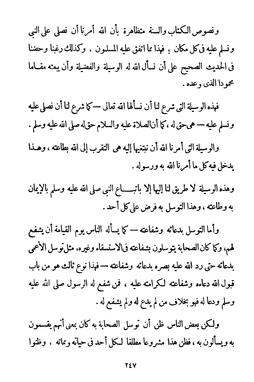 وَنُصُوصُ الْكِتَابِ وَالسُّنَّةِ مُتَظَاهِرَةٌ بِأَنَّ اللَّهَ أَمَرَنَا أَنْ نُصَلِّيَ عَلَى النَّبِيِّ وَنُسَلِّمَ عَلَيْهِ فِي كُلِّ مَكَانٍ؛ فَهَذَا مِمَّا اتَّفَقَ عَلَيْهِ الْمُسْلِمُونَ وَكَذَلِكَ رَغَّبَنَا وَحَضَّنَا فِي الْحَدِيثِ الصَّحِيحِ عَلَى أَنْ نَسْأَلَ اللَّهَ لَهُ الْوَسِيلَةَ وَالْفَضِيلَةَ وَأَنْ يَبْعَثَهُ مَقَامًا مَحْمُودًا الَّذِي وَعَدَهُ. فَهَذِهِ الْوَسِيلَةُ الَّتِي شُرِعَ لَنَا أَنْ نَسْأَلَهَا اللَّهَ تَعَالَى - كَمَا شُرِعَ لَنَا أَنْ نُصَلِّيَ عَلَيْهِ وَنُسَلِّمَ عَلَيْهِ - هِيَ حَقٌّ لَهُ كَمَا أَنَّ الصَّلَاةَ عَلَيْهِ وَالسَّلَامَ حَقٌّ لَهُ صَلَّى اللَّهُ عَلَيْهِ وَسَلَّمَ.