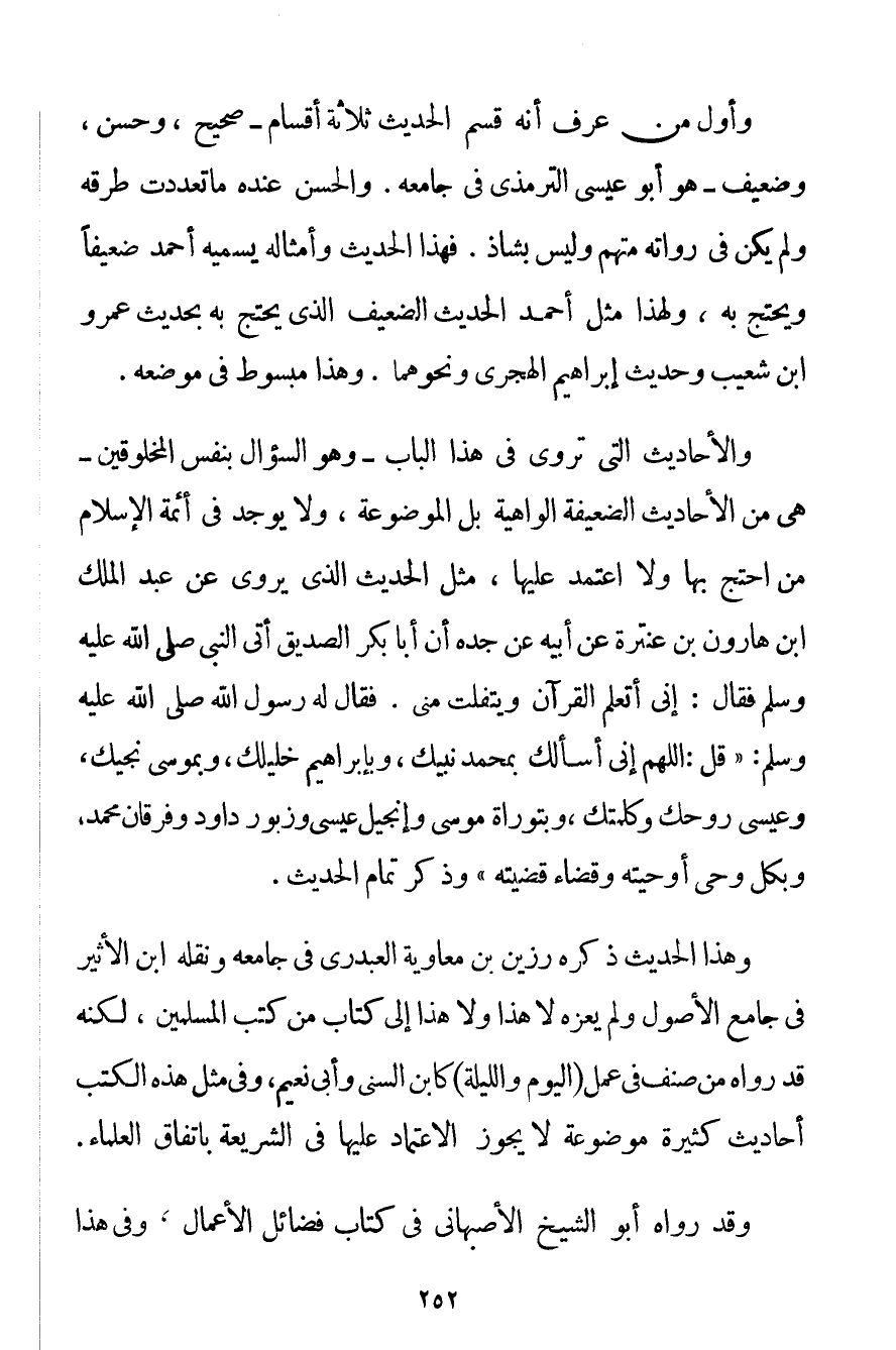 وَأَوَّلُ مَنْ عُرِفَ أَنَّهُ قَسَّمَ الْحَدِيثَ ثَلَاثَةَ أَقْسَامٍ - صَحِيحٌ وَحَسَنٌ وَضَعِيفٌ - هُوَ أَبُو عِيسَى التِّرْمِذِيُّ فِي جَامِعِهِ. وَالْحَسَنُ عِنْدَهُ مَا تَعَدَّدَتْ طُرُقُهُ وَلَمْ يَكُنْ فِي رُوَاتِهِ مُتَّهَمٌ وَلَيْسَ بِشَاذِّ. فَهَذَا الْحَدِيثُ وَأَمْثَالُهُ يُسَمِّيهِ أَحْمَدُ ضَعِيفًا وَيَحْتَجُّ بِهِ وَلِهَذَا مَثَّلَ أَحْمَدُ الْحَدِيثَ الضَّعِيفَ الَّذِي يُحْتَجُّ بِهِ بِحَدِيثِ عَمْرِو بْنِ شُعَيْبٍ وَحَدِيثِ إبْرَاهِيمَ الهجري وَنَحْوِهِمَا. وَهَذَا مَبْسُوطٌ فِي مَوْضِعِهِ. وَالْأَحَادِيثُ الَّتِي تُرْوَى فِي هَذَا الْبَابِ - وَهُوَ السُّؤَالُ بِنَفْسِ الْمَخْلُوقِينَ - هِيَ مِنْ الْأَحَادِيثِ الضَّعِيفَةِ الْوَاهِيَةِ بَلْ الْمَوْضُوعَةِ وَلَا يُوجَدُ فِي أَئِمَّةِ الْإِسْلَامِ مَنْ احْتَجَّ بِهَا وَلَا اعْتَمَدَ عَلَيْهَا مِثْلَ الْحَدِيثِ الَّذِي يُرْوَى عَنْ عَبْدِ الْمَلِكِ بْنِ هَارُونَ بْنِ عَنْتَرَةَ عَنْ أَبِيهِ عَنْ جَدِّهِ {أَنَّ أَبَا بَكْرٍ الصِّدِّيقَ أَتَى النَّبِيَّ صَلَّى اللَّهُ عَلَيْهِ وَسَلَّمَ فَقَالَ: إنِّي أَتَعْلَمُ الْقُرْآنَ وَيَتَفَلَّتُ مِنِّي. فَقَالَ لَهُ رَسُولُ اللَّهِ صَلَّى اللَّهُ عَلَيْهِ وَسَلَّمَ قُلْ: اللَّهُمَّ إنِّي أَسْأَلُك بِمُحَمَّدِ نَبِيِّك وَبِإِبْرَاهِيمَ خَلِيلِك وَبِمُوسَى نَجِيِّك وَعِيسَى رُوحِك وَكَلِمَتِك وَبِتَوْرَاةِ مُوسَى وَإِنْجِيلِ عِيسَى وَزَبُورِ دَاوُد وَفُرْقَانِ مُحَمَّدٍ وَبِكُلِّ وَحْيٍ أَوْحَيْته وَقَضَاءٍ قَضَيْته} وَذَكَرَ تَمَامَ الْحَدِيثِ. وَهَذَا الْحَدِيثُ ذَكَرَهُ رزين بْنُ مُعَاوِيَةَ العبدري فِي جَامِعِهِ وَنَقَلَهُ ابْنُ الْأَثِيرِ فِي جَامِعِ الْأُصُولِ وَلَمْ يَعْزُهُ لَا هَذَا وَلَا هَذَا إلَى كِتَابٍ مِنْ كُتُبِ الْمُسْلِمِينَ لَكِنَّهُ قَدْ رَوَاهُ مَنْ صَنَّفَ فِي عَمَلِ (الْيَوْمِ وَاللَّيْلَةِ كَابْنِ السُّنِّيِّ وَأَبِي نُعَيْمٍ وَفِي مِثْلِ هَذِهِ الْكُتُبِ أَحَادِيثُ كَثِيرَةٌ مَوْضُوعَةٌ لَا يَجُوزُ الِاعْتِمَادُ عَلَيْهَا فِي الشَّرِيعَةِ بِاتِّفَاقِ الْعُلَمَاءِ. وَقَدْ رَوَاهُ الشَّيْخُ الأصبهاني فِي كِتَابِ فَضَائِلِ الْأَعْمَالِ وَفِي هَذَا