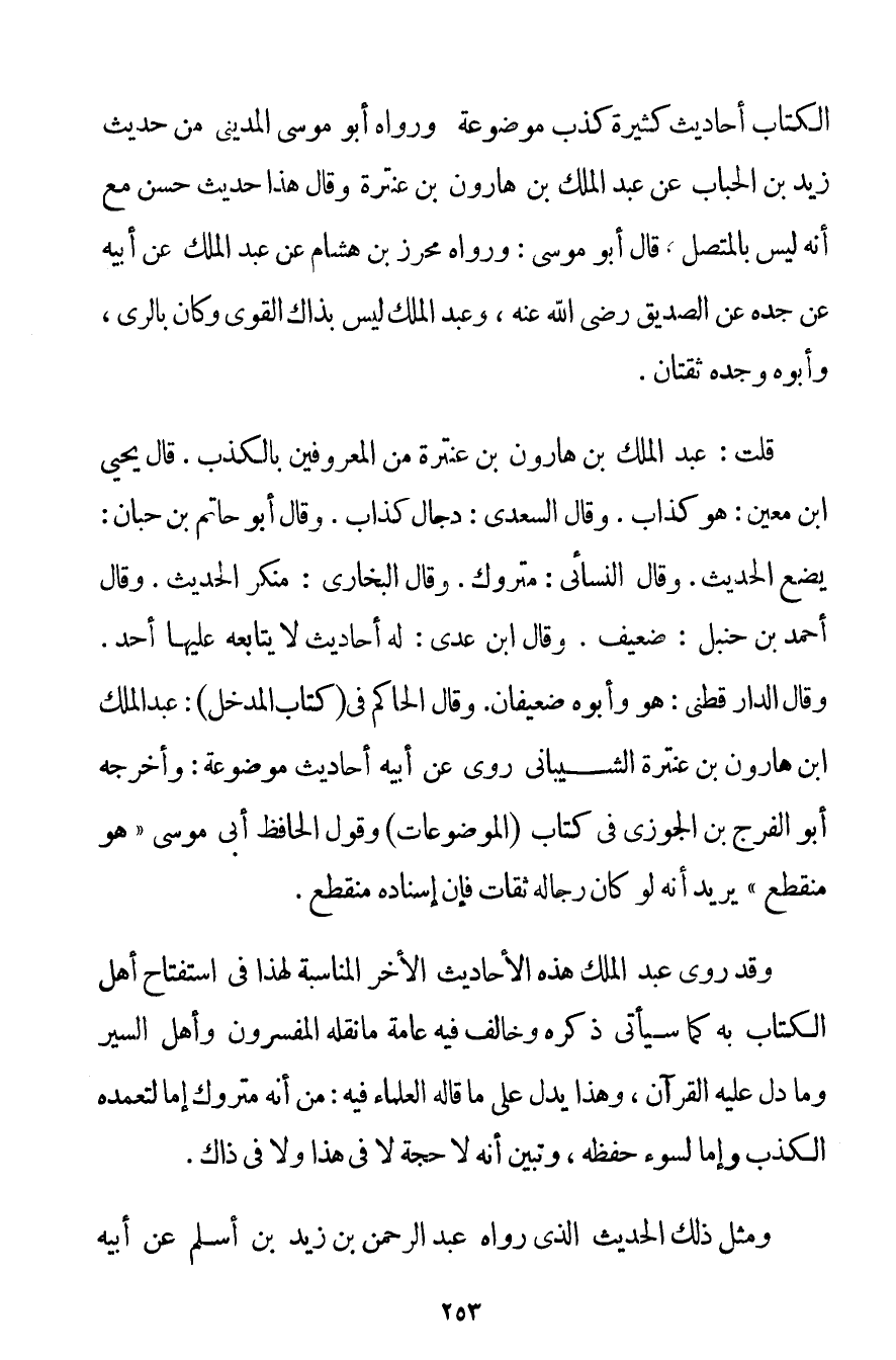 الْكِتَابِ أَحَادِيثُ كَثِيرَةٌ كَذِبٌ مَوْضُوعَةٌ. وَرَوَاهُ أَبُو مُوسَى الْمَدِينِيُّ مِنْ حَدِيثِ زَيْدِ بْنِ الحباب عَنْ عَبْدِ الْمَلِكِ بْنِ هَارُونَ بْنِ عَنْتَرَةَ وَقَالَ هَذَا حَدِيثٌ حَسَنٌ مَعَ أَنَّهُ لَيْسَ بِالْمُتَّصِلِ قَالَ أَبُو مُوسَى: وَرَوَاهُ مُحْرِزُ بْنُ هِشَامٍ عَنْ عَبْدِ الْمَلِكِ عَنْ أَبِيهِ عَنْ جَدِّهِ عَنْ الصِّدِّيقِ رَضِيَ اللَّهُ عَنْهُ وَعَبْدُ الْمَلِكِ لَيْسَ بِذَاكَ الْقَوِيِّ وَكَانَ بِالرِّيِّ وَأَبُوهُ وَجَدُّهُ ثِقَتَانِ. قُلْت: عَبْدُ الْمَلِكِ بْنُ هَارُونَ بْنِ عَنْتَرَةَ مِنْ الْمَعْرُوفِينَ بِالْكَذِبِ. قَالَ يَحْيَى بْنُ مَعِينٍ: هُوَ كَذَّابٌ. وَقَال السَّعْدِيُّ: دَجَّالٌ كَذَّابٌ. وَقَالَ أَبُو حَاتِمِ بْنُ حِبَّانَ: يَضَعُ الْحَدِيثَ. وَقَالَ النَّسَائِي: مَتْرُوكٌ. وَقَالَ الْبُخَارِيُّ: مُنْكَرُ الْحَدِيثِ. وَقَالَ أَحْمَدُ بْنُ حَنْبَلٍ: ضَعِيفٌ. وَقَالَ ابْنُ عَدِيٍّ: لَهُ أَحَادِيثُ لَا يُتَابِعُهُ عَلَيْهَا أَحَدٌ. وَقَالَ الدارقطني: هُوَ وَأَبُوهُ ضَعِيفَانِ. وَقَالَ الْحَاكِمُ فِي (كِتَابِ الْمَدْخَلِ: عَبْدُ الْمَلِكِ بْنُ هَارُونَ بْنِ عَنْتَرَةَ الشيباني رَوَى عَنْ أَبِيهِ أَحَادِيثَ مَوْضُوعَةً: وَأَخْرَجَهُ أَبُو الْفَرَجِ بْنُ الْجَوْزِيِّ فِي كِتَابِ (الْمَوْضُوعَاتِ وَقَوْلُ الْحَافِظِ أَبِي مُوسَى " هُوَ مُنْقَطِعٌ " يُرِيدُ أَنَّهُ لَوْ كَانَ رِجَالُهُ ثِقَاتٌ فَإِنَّ إسْنَادَهُ مُنْقَطِعٌ. وَقَدْ رَوَى عَبْدُ الْمَلِكِ هَذِهِ الْأَحَادِيثَ الْأُخَرَ الْمُنَاسِبَةَ لِهَذَا فِي اسْتِفْتَاحِ أَهْلِ الْكِتَابِ بِهِ كَمَا سَيَأْتِي ذِكْرُهُ وَخَالَفَ فِيهِ عَامَّةَ مَا نَقَلَهُ الْمُفَسِّرُونَ وَأَهْلُ السِّيَرِ وَمَا دَلَّ عَلَيْهِ الْقُرْآنُ وَهَذَا يَدُلُّ عَلَى مَا قَالَهُ الْعُلَمَاءُ فِيهِ: مِنْ أَنَّهُ مَتْرُوكٌ إمَّا لِتَعَمُّدِهِ الْكَذِبَ وَإِمَّا لِسُوءِ حِفْظِهِ وَتَبَيَّنَ أَنَّهُ لَا حُجَّةَ لَا فِي هَذَا وَلَا فِي ذَاكَ. وَمِثْلُ ذَلِكَ الْحَدِيثِ الَّذِي رَوَاهُ عَبْدُ الرَّحْمَنِ بْنُ زَيْدِ بْنِ أَسْلَمَ عَنْ أَبِيهِ