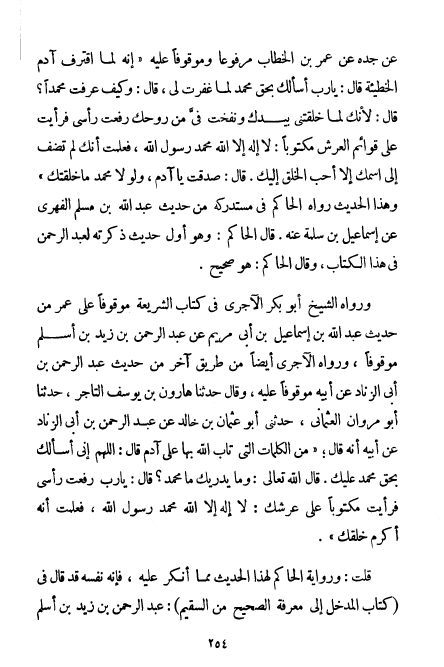 عَنْ جَدِّهِ عَنْ عُمَرَ بْنِ الْخَطَّابِ مَرْفُوعًا وَمَوْقُوفًا عَلَيْهِ {إنَّهُ لَمَّا اقْتَرَفَ آدَمَ الْخَطِيئَةَ قَالَ: يَا رَبِّ أَسْأَلُك بِحَقِّ مُحَمَّدٍ لَمَا غَفَرْت لِي قَالَ: وَكَيْفَ عَرَفْت مُحَمَّدًا؟ قَالَ: لِأَنَّك لَمَّا خَلَقْتنِي بِيَدِك وَنَفَخْت فِيَّ مِنْ رُوحِك رَفَعْت رَأْسِي فَرَأَيْت عَلَى قَوَائِمِ الْعَرْشِ مَكْتُوبًا: لَا إلَهَ إلَّا اللَّهُ مُحَمَّدٌ رَسُولُ اللَّهِ فَعَلِمْت أَنَّك لَمْ تُضِفْ إلَى اسْمِك إلَّا أَحَبَّ الْخَلْقِ إلَيْك. قَالَ: صَدَقْت يَا آدَمَ وَلَوْلَا مُحَمَّدٌ مَا خَلَقْتُك} وَهَذَا الْحَدِيثُ رَوَاهُ الْحَاكِمُ فِي مُسْتَدْرَكِهِ مِنْ حَدِيثِ عَبْدِ اللَّهِ بْنِ مُسْلِمٍ العوفي عَنْ إسْمَاعِيلَ بْنِ سَلَمَةَ عَنْهُ. قَالَ الْحَاكِمُ: وَهُوَ أَوَّلُ حَدِيثٍ ذَكَرْته لِعَبْدِ الرَّحْمَنِ فِي هَذَا الْكِتَابِ وَقَالَ الْحَاكِمُ: هُوَ صَحِيحٌ. وَرَوَاهُ الشَّيْخُ أَبُو بَكْرٍ الآجري فِي كِتَابِ الشَّرِيعَةِ مَوْقُوفًا عَلَى عُمَرَ مِنْ حَدِيثِ عَبْدِ اللَّهِ بْنِ إسْمَاعِيلَ بْنِ أَبِي مَرْيَمَ عَنْ عَبْدِ الرَّحْمَنِ بْنِ زَيْدِ بْنِ أَسْلَمَ مَوْقُوفًا وَرَوَاهُ الآجري أَيْضًا مِنْ طَرِيقٍ آخَرَ مِنْ حَدِيثِ عَبْدِ الرَّحْمَنِ بْنِ أَبِي الزِّنَادِ عَنْ أَبِيهِ مَوْقُوفًا عَلَيْهِ وَقَالَ حَدَّثَنَا هَارُونُ بْنُ يُوسُفَ التَّاجِرُ حَدَّثَنَا أَبُو مَرْوَانَ الْعُثْمَانِيُّ حَدَّثَنِي أَبُو عُثْمَانَ بْنُ خَالِدِ عَنْ عَبْدِ الرَّحْمَنِ بْنِ أَبِي الزِّنَادِ عَنْ أَبِيهِ أَنَّهُ قَالَ؛ {مِنْ الْكَلِمَاتِ الَّتِي تَابَ اللَّهُ بِهَا عَلَى آدَمَ قَالَ: اللَّهُمَّ إنِّي أَسْأَلُك بِحَقِّ مُحَمَّدٍ عَلَيْك. قَالَ اللَّهُ تَعَالَى: وَمَا يُدْرِيك مَا مُحَمَّدٌ؟ قَالَ: يَا رَبِّ رَفَعْت رَأْسِي فَرَأَيْت مَكْتُوبًا عَلَى عَرْشِك: لَا إلَهَ إلَّا اللَّهُ مُحَمَّدٌ رَسُولُ اللَّهِ فَعَلِمْت أَنَّهُ أَكْرَمُ خَلْقِك} . قُلْت: وَرِوَايَةُ الْحَاكِمِ لِهَذَا الْحَدِيثِ مِمَّا أُنْكِرَ عَلَيْهِ فَإِنَّهُ نَفْسَهُ قَدْ قَالَ فِي (كِتَابِ الْمَدْخَلِ إلَى مَعْرِفَةِ الصَّحِيحِ مِنْ السَّقِيمِ: عَبْدُ الرَّحْمَنِ بْنُ زَيْدِ بْنِ أَسْلَمَ