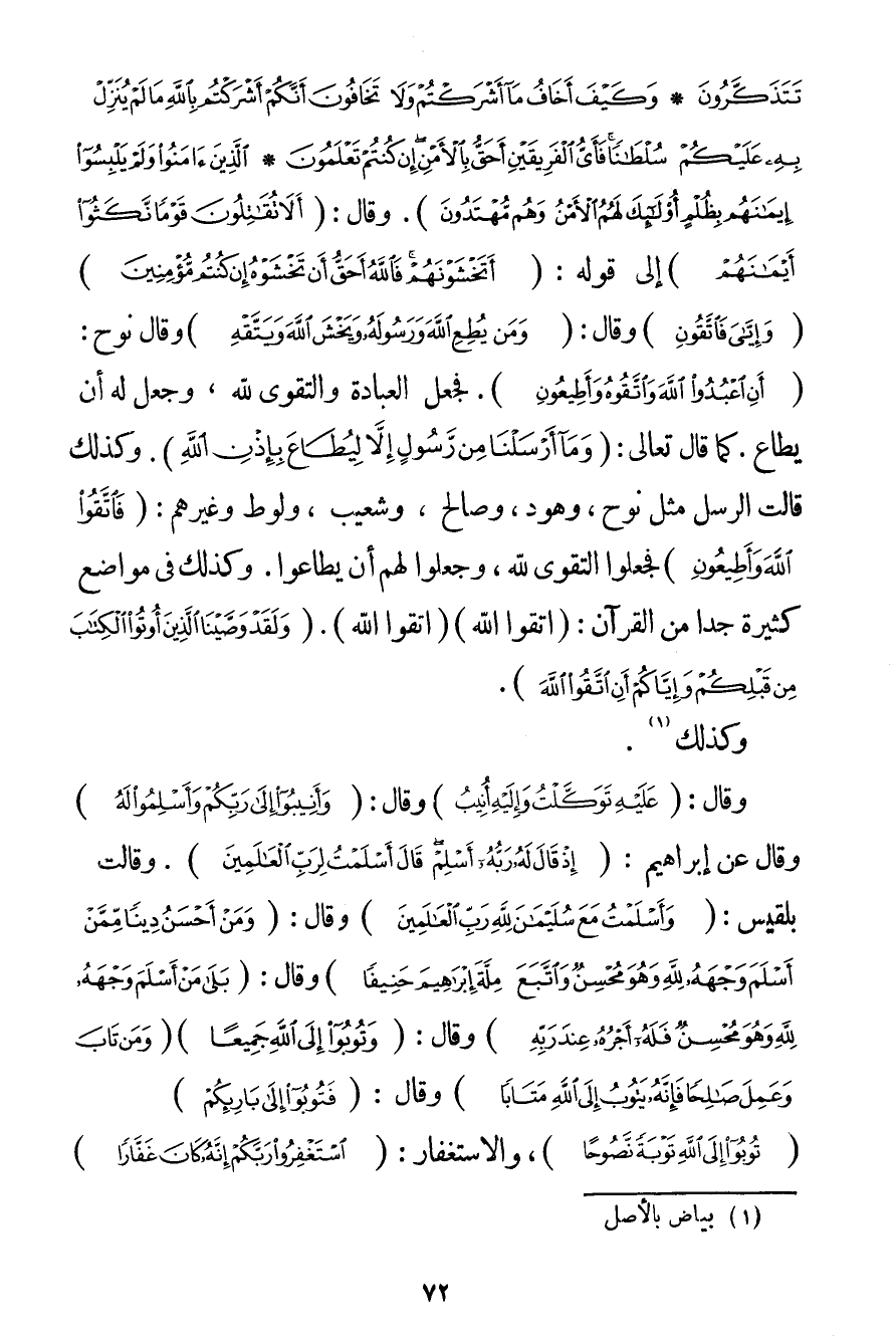 تَتَذَكَّرُونَ وَكَيْفَ أَخَافُ مَا أَشْرَكْتُمْ وَلَا تَخَافُونَ أَنَّكُمْ أَشْرَكْتُمْ بِاللَّهِ مَا لَمْ يُنَزِّلْ بِهِ عَلَيْكُمْ سُلْطَانًا فَأَيُّ الْفَرِيقَيْنِ أَحَقُّ بِالْأَمْنِ إنْ كُنْتُمْ تَعْلَمُونَ} {الَّذِينَ آمَنُوا وَلَمْ يَلْبِسُوا إيمَانَهُمْ بِظُلْمٍ أُولَئِكَ لَهُمُ الْأَمْنُ وَهُمْ مُهْتَدُونَ} . وَقَالَ: {أَلَا تُقَاتِلُونَ قَوْمًا نَكَثُوا أَيْمَانَهُمْ} إلَى قَوْلِهِ: {أَتَخْشَوْنَهُمْ فَاللَّهُ أَحَقُّ أَنْ تَخْشَوْهُ إنْ كُنْتُمْ مُؤْمِنِينَ} {وَإِيَّايَ فَاتَّقُونِ} وَقَالَ: {وَمَنْ يُطِعِ اللَّهَ وَرَسُولَهُ وَيَخْشَ اللَّهَ وَيَتَّقْهِ} وَقَالَ نُوحٌ: {أَنِ اعْبُدُوا اللَّهَ وَاتَّقُوهُ وَأَطِيعُونِ} . فَجَعَلَ الْعِبَادَةَ وَالتَّقْوَى لِلَّهِ وَجَعَلَ لَهُ أَنْ يُطَاعَ. كَمَا قَالَ تَعَالَى: {وَمَا أَرْسَلْنَا مِنْ رَسُولٍ إلَّا لِيُطَاعَ بِإِذْنِ اللَّهِ} . وَكَذَلِكَ قَالَتْ الرُّسُلُ مِثْلُ نُوحٍ وَهُودٍ وَصَالِحٍ وَشُعَيْبٍ وَلُوطٍ وَغَيْرِهِمْ: {فَاتَّقُوا اللَّهَ وَأَطِيعُونِ} فَجَعَلُوا التَّقْوَى لِلَّهِ وَجَعَلُوا لَهُمْ أَنْ يُطَاعُوا. وَكَذَلِكَ فِي مَوَاضِعَ كَثِيرَةٍ جِدًّا مِنْ الْقُرْآنِ: {اتَّقُوا اللَّهَ} {اتَّقُوا اللَّهَ} . {وَلَقَدْ وَصَّيْنَا الَّذِينَ أُوتُوا الْكِتَابَ مِنْ قَبْلِكُمْ وَإِيَّاكُمْ أَنِ اتَّقُوا اللَّهَ} . وَكَذَلِكَ. . . (1) وَقَالَ: {عَلَيْهِ تَوَكَّلْتُ وَإِلَيْهِ أُنِيبُ} وَقَالَ: {وَأَنِيبُوا إلَى رَبِّكُمْ وَأَسْلِمُوا لَهُ} وَقَالَ عَنْ إبْرَاهِيمَ: {إذْ قَالَ لَهُ رَبُّهُ أَسْلِمْ قَالَ أَسْلَمْتُ لِرَبِّ الْعَالَمِينَ} . وَقَالَتْ بلقيس: {إِنِّي ظَلَمْتُ نَفْسِي وَأَسْلَمْتُ مَعَ سُلَيْمَانَ لِلَّهِ رَبِّ الْعَالَمِينَ} وَقَالَ: {وَمَنْ أَحْسَنُ دِينًا مِمَّنْ أَسْلَمَ وَجْهَهُ لِلَّهِ وَهُوَ مُحْسِنٌ وَاتَّبَعَ مِلَّةَ إبْرَاهِيمَ حَنِيفًا} وَقَالَ: {بَلَى مَنْ أَسْلَمَ وَجْهَهُ لِلَّهِ وَهُوَ مُحْسِنٌ فَلَهُ أَجْرُهُ عِنْدَ رَبِّهِ} وَقَالَ: {وَتُوبُوا إلَى اللَّهِ جَمِيعًا} {وَمَنْ تَابَ وَعَمِلَ صَالِحًا فَإِنَّهُ يَتُوبُ إلَى اللَّهِ مَتَابًا} وَقَالَ: {فَتُوبُوا إلَى بَارِئِكُمْ} {تُوبُوا إلَى اللَّهِ تَوْبَةً نَصُوحًا} وَالِاسْتِغْفَارُ: {اسْتَغْفِرُوا رَبَّكُمْ إنَّهُ كَانَ غَفَّارًا}