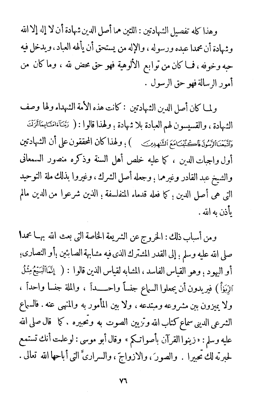 وَهَذَا كُلُّهُ تَفْصِيلُ الشَّهَادَتَيْنِ اللَّتَيْنِ هُمَا أَصْلُ الدِّينِ: شَهَادَةُ أَنْ لَا إلَهَ إلَّا اللَّهُ وَشَهَادَةُ أَنَّ مُحَمَّدًا عَبْدُهُ وَرَسُولُهُ وَالْإِلَهُ مَنْ يَسْتَحِقُّ إنْ يُؤَلِّهَهُ الْعِبَادُ وَيَدْخُلُ فِيهِ حُبُّهُ وَخَوْفُهُ فَمَا كَانَ مِنْ تَوَابِعِ الْأُلُوهِيَّةِ فَهُوَ حَقٌّ مَحْضٌ لِلَّهِ وَمَا كَانَ مِنْ أُمُورِ الرِّسَالَةِ فَهُوَ حَقُّ الرَّسُولِ. وَلَمَّا كَانَ أَصْلُ الدِّينِ الشَّهَادَتَيْنِ: كَانَتْ هَذِهِ الْأُمَّةُ الشُّهَدَاءَ وَلَهَا وَصْفُ الشَّهَادَةِ. وَالْقِسِّيسُونَ لَهُمْ الْعِبَادَةُ بِلَا شَهَادَةٍ وَلِهَذَا قَالُوا: {رَبَّنَا آمَنَّا بِمَا أَنْزَلْتَ وَاتَّبَعْنَا الرَّسُولَ فَاكْتُبْنَا مَعَ الشَّاهِدِينَ} وَلِهَذَا كَانَ الْمُحَقِّقُونَ عَلَى أَنَّ الشَّهَادَتَيْنِ أَوَّلُ وَاجِبَاتِ الدِّينِ كَمَا عَلَيْهِ خُلَّصُ أَهْلِ السُّنَّةِ وَذَكَرَهُ مَنْصُورٌ السَّمْعَانِي وَالشَّيْخُ عَبْدُ الْقَادِرِ وَغَيْرُهُمَا وَجَعَلَهُ أَصْلَ الشِّرْكِ وَغَيَّرُوا بِذَلِكَ مِلَّةَ التَّوْحِيدِ الَّتِي هِيَ أَصْلُ الدِّينِ كَمَا فَعَلَهُ قُدَمَاءُ الْمُتَفَلْسِفَةِ الَّذِينَ شَرَعُوا مِنْ الدِّينِ مَا لَمْ يَأْذَنْ بِهِ اللَّهُ. وَمِنْ أَسْبَابِ ذَلِكَ: الْخُرُوجُ عَنْ الشَّرِيعَةِ الْخَاصَّةِ الَّتِي بَعَثَ اللَّهُ بِهَا مُحَمَّدًا صَلَّى اللَّهُ عَلَيْهِ وَسَلَّمَ إلَى الْقَدْرِ الْمُشْتَرَكِ الَّذِي فِيهِ مُشَابَهَةُ الصَّابِئِينَ أَوْ النَّصَارَى أَوْ الْيَهُودِ وَهُوَ الْقِيَاسُ الْفَاسِدُ الْمُشَابِهُ لِقِيَاسِ الَّذِينَ قَالُوا: {إنَّمَا الْبَيْعُ مِثْلُ الرِّبَا} فَيُرِيدُونَ أَنْ يَجْعَلُوا السَّمَاعَ جِنْسًا وَاحِدًا وَالْمِلَّةَ جِنْسًا وَاحِدًا وَلَا يُمَيِّزُونَ بَيْنَ مَشْرُوعِهِ وَمُبْتَدِعِهِ وَلَا بَيْنَ الْمَأْمُورِ بِهِ وَالْمَنْهِيِّ عَنْهُ. فَالسَّمَاعُ الشَّرْعِيُّ الدِّينِيُّ سَمَاعُ كِتَابِ اللَّهِ وَتَزْيِينُ الصَّوْتِ بِهِ وَتَحْبِيرُهُ كَمَا قَالَ صَلَّى اللَّهُ عَلَيْهِ وَسَلَّمَ {زَيِّنُوا الْقُرْآنَ بِأَصْوَاتِكُمْ} وَقَالَ أَبُو مُوسَى: لَوْ عَلِمْتُ أَنَّك تَسْتَمِعُ لَحَبَّرْتُهُ لَكَ تَحْبِيرًا. وَالصُّوَرُ وَالْأَزْوَاجُ وَالسَّرَارِيُّ الَّتِي أَبَاحَهَا اللَّهُ تَعَالَى.