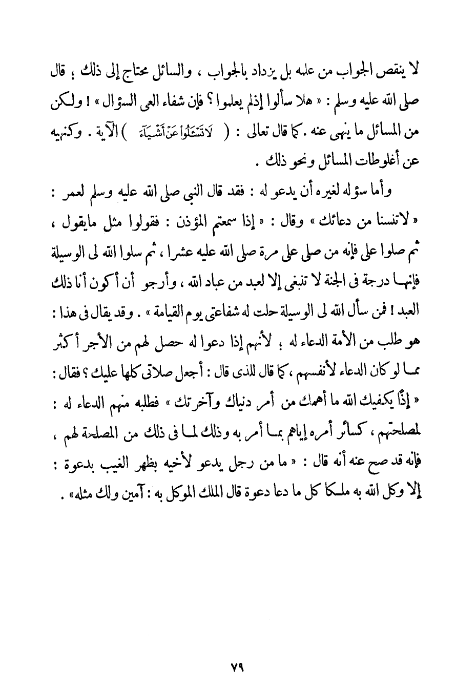 لَا يُنْقِصُ الْجَوَابُ مِنْ عِلْمِهِ بَلْ يَزْدَادُ بِالْجَوَابِ وَالسَّائِلُ مُحْتَاجٌ إلَى ذَلِكَ قَالَ صَلَّى اللَّهُ عَلَيْهِ وَسَلَّمَ {هَلَّا سَأَلُوا إذْ لَمْ يَعْلَمُوا؟ فَإِنَّ شِفَاءَ الْعَيِّ السُّؤَالُ} وَلَكِنْ مِنْ الْمَسَائِلِ مَا يُنْهَى عَنْهُ. كَمَا قَالَ تَعَالَى: {لَا تَسْأَلُوا عَنْ أَشْيَاءَ} الْآيَةَ. وَكَنَهْيِهِ عَنْ أُغْلُوطَاتِ الْمَسَائِلِ وَنَحْوِ ذَلِكَ. وَأَمَّا سُؤَالُهُ لِغَيْرِهِ أَنْ يَدْعُوَ لَهُ: فَقَدْ قَالَ النَّبِيُّ صَلَّى اللَّهُ عَلَيْهِ وَسَلَّمَ لِعُمَرِ: {لَا تَنْسَنَا مِنْ دُعَائِك} وَقَالَ: {إذَا سَمِعْتُمْ الْمُؤَذِّنَ: فَقُولُوا مِثْلَ مَا يَقُولُ ثُمَّ صَلُّوا عَلَيَّ فَإِنَّهُ مَنْ صَلَّى عَلَيَّ مَرَّةً صَلَّى اللَّهُ عَلَيْهِ عَشْرًا ثُمَّ سَلُوا اللَّهَ لِي الْوَسِيلَةَ فَإِنَّهَا دَرَجَةٌ فِي الْجَنَّةِ لَا تَنْبَغِي إلَّا لِعَبْدِ مِنْ عِبَادِ اللَّهِ وَأَرْجُو أَنْ أَكُونَ أَنَا ذَلِكَ الْعَبْدَ فَمَنْ سَأَلَ اللَّهَ لِي الْوَسِيلَةَ حَلَّتْ لَهُ شَفَاعَتِي يَوْمَ الْقِيَامَةِ} وَقَدْ يُقَالُ فِي هَذَا: هُوَ طَلَبَ مِنْ الْأُمَّةِ الدُّعَاءَ لَهُ لِأَنَّهُمْ إذَا دَعَوْا لَهُ حَصَلَ لَهُمْ مِنْ الْأَجْرِ أَكْثَرُ مِمَّا لَوْ كَانَ الدُّعَاءُ لِأَنْفُسِهِمْ كَمَا قَالَ لِلَّذِي قَالَ: أَجْعَلُ صَلَاتِي كُلَّهَا عَلَيْكَ؟ فَقَالَ: {إذًا يَكْفِيكَ اللَّهُ مَا أَهَمَّكَ مِنْ أَمْرِ دُنْيَاك وَآخِرَتِكَ} فَطَلَبُهُ مِنْهُمْ الدُّعَاءَ لَهُ لِمَصْلَحَتِهِمْ كَسَائِرِ أَمْرِهِ إيَّاهُمْ بِمَا أُمِرَ بِهِ وَذَلِكَ لِمَا فِي ذَلِكَ مِنْ الْمَصْلَحَةِ لَهُمْ فَإِنَّهُ قَدْ صَحَّ عَنْهُ أَنَّهُ قَالَ: {مَا مِنْ رَجُلٍ يَدْعُو لِأَخِيهِ بِظَهْرِ الْغَيْبِ بِدَعْوَةِ: إلَّا وَكَّلَ اللَّهُ بِهِ مَلَكًا كُلَّمَا دَعَا دَعْوَةً قَالَ الْمَلَكُ الْمُوَكَّلُ بِهِ: آمِينَ وَلَك مِثْلُهُ} .