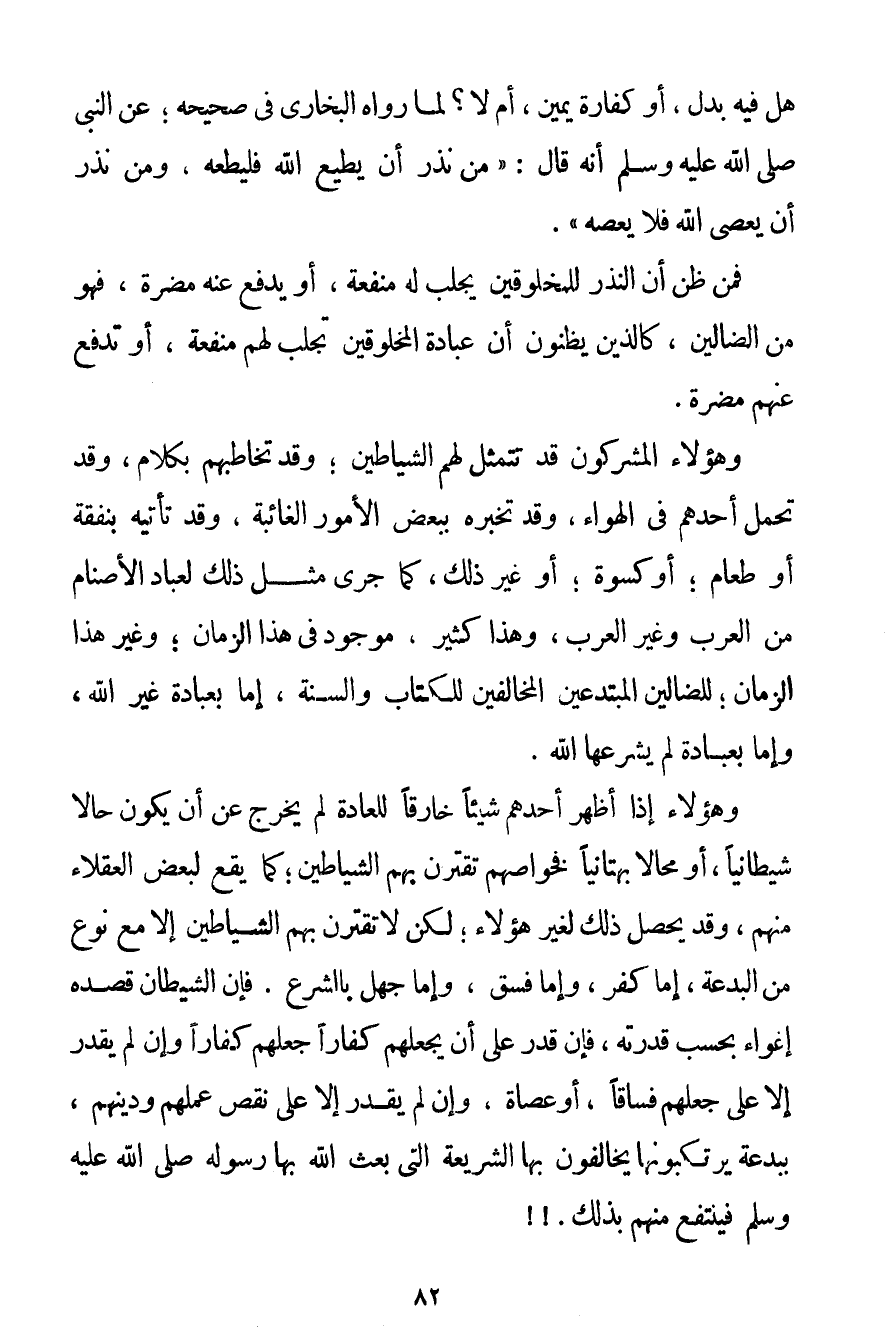 هَلْ فِيهِ بَدَلٌ أَوْ كَفَّارَةُ يَمِينٍ أَمْ لَا؟ لِمَا رَوَاهُ الْبُخَارِيُّ فِي صَحِيحِهِ عَنْ النَّبِيِّ صَلَّى اللَّهُ عَلَيْهِ وَسَلَّمَ أَنَّهُ قَالَ: {مَنْ نَذَرَ أَنْ يُطِيعَ اللَّهَ فَلْيُطِعْهُ وَمَنْ نَذَرَ أَنْ يَعْصِيَ اللَّهَ فَلَا يَعْصِهِ} . فَمَنْ ظَنَّ أَنَّ النَّذْرَ لِلْمَخْلُوقِينَ يَجْلِبُ لَهُ مَنْفَعَةً أَوْ يَدْفَعُ عَنْهُ مَضَرَّةً فَهُوَ مِنْ الضَّالِّينَ كَاَلَّذِينَ يَظُنُّونَ أَنَّ عِبَادَةَ الْمَخْلُوقِينَ تَجْلِبُ لَهُمْ مَنْفَعَةً أَوْ تَدْفَعُ عَنْهُمْ مَضَرَّةً. وَهَؤُلَاءِ الْمُشْرِكُونَ قَدْ تَتَمَثَّلُ لَهُمْ الشَّيَاطِينُ وَقَدْ تُخَاطِبُهُمْ بِكَلَامِ وَقَدْ تَحْمِلُ أَحَدَهُمْ فِي الْهَوَاءِ وَقَدْ تُخْبِرُهُ بِبَعْضِ الْأُمُورِ الْغَائِبَةِ وَقَدْ تَأْتِيهِ بِنَفَقَةِ أَوْ طَعَامٍ أَوْ كِسْوَةٍ أَوْ غَيْرِ ذَلِكَ كَمَا جَرَى مِثْلُ ذَلِكَ لِعُبَّادِ الْأَصْنَامِ مِنْ الْعَرَبِ وَغَيْرِ الْعَرَبِ وَهَذَا كَثِيرٌ مَوْجُودٌ فِي هَذَا الزَّمَانِ وَغَيْرِ هَذَا الزَّمَانِ لِلضَّالِّينَ الْمُبْتَدِعِينَ الْمُخَالِفِينَ لِلْكِتَابِ وَالسُّنَّةِ إمَّا بِعِبَادَةِ غَيْرِ اللَّهِ وَإِمَّا بِعِبَادَةِ لَمْ يَشْرَعْهَا اللَّهُ.