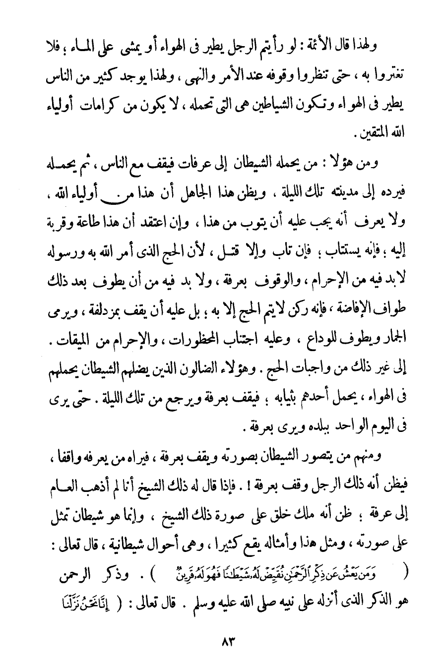 وَلِهَذَا قَالَ الْأَئِمَّةُ: لَوْ رَأَيْتُمْ الرَّجُلَ يَطِيرُ فِي الْهَوَاءِ أَوْ يَمْشِي عَلَى الْمَاءِ فَلَا تَغْتَرُّوا بِهِ حَتَّى تَنْظُرُوا وُقُوفَهُ عِنْدَ الْأَمْرِ وَالنَّهْيِ وَلِهَذَا يُوجَدُ كَثِيرٌ مِنْ النَّاسِ يَطِيرُ فِي الْهَوَاءِ وَتَكُونُ الشَّيَاطِينُ هِيَ الَّتِي تَحْمِلُهُ لَا يَكُونُ مِنْ كَرَامَاتِ أَوْلِيَاءِ اللَّهِ الْمُتَّقِينَ. وَمِنْ هَؤُلَاءِ: مَنْ يَحْمِلُهُ الشَّيْطَانُ إلَى عَرَفَاتٍ فَيَقِفُ مَعَ النَّاسِ ثُمَّ يَحْمِلُهُ فَيَرُدُّهُ إلَى مَدِينَتِهِ تِلْكَ اللَّيْلَةَ وَيَظُنُّ هَذَا الْجَاهِلُ أَنَّ هَذَا مِنْ أَوْلِيَاءِ اللَّهِ وَلَا يَعْرِفُ أَنَّهُ يَجِبُ عَلَيْهِ أَنْ يَتُوبَ مِنْ هَذَا وَإِنْ اعْتَقَدَ أَنَّ هَذَا طَاعَةٌ وَقُرْبَةٌ إلَيْهِ فَإِنَّهُ يُسْتَتَابُ فَإِنْ تَابَ وَإِلَّا قُتِلَ لِأَنَّ الْحَجَّ الَّذِي أَمَرَ اللَّهُ بِهِ وَرَسُولُهُ لَا بُدَّ فِيهِ مِنْ الْإِحْرَامِ وَالْوُقُوفِ بِعَرَفَةَ وَلَا بُدَّ فِيهِ مِنْ أَنْ يَطُوفَ بَعْدَ ذَلِكَ طَوَافَ الْإِفَاضَةِ فَإِنَّهُ رُكْنٌ لَا يَتِمُّ الْحَجُّ إلَّا بِهِ بَلْ عَلَيْهِ أَنْ يَقِفَ بمزدلفة وَيَرْمِيَ الْجِمَارَ وَيَطُوفَ لِلْوَدَاعِ وَعَلَيْهِ اجْتِنَابُ الْمَحْظُورَاتِ وَالْإِحْرَامُ مِنْ الْمِيقَاتِ. إلَى غَيْرِ ذَلِكَ مِنْ وَاجِبَاتِ الْحَجِّ. وَهَؤُلَاءِ الضَّالُّونَ الَّذِينَ يُضِلُّهُمْ الشَّيْطَانُ يَحْمِلُهُمْ فِي الْهَوَاءِ يَحْمِلُ أَحَدَهُمْ بِثِيَابِهِ فَيَقِفُ بِعَرَفَةَ وَيَرْجِعُ مِنْ تِلْكَ اللَّيْلَةِ. حَتَّى يُرَى فِي الْيَوْمِ الْوَاحِدِ بِبَلَدِهِ وَيُرَى بِعَرَفَةَ. وَمِنْهُمْ مَنْ يَتَصَوَّرُ الشَّيْطَانُ بِصُورَتِهِ وَيَقِفُ بِعَرَفَةَ فَيَرَاهُ مَنْ يَعْرِفُهُ وَاقِفًا فَيَظُنُّ أَنَّهُ ذَلِكَ الرَّجُلُ وَقَفَ بِعَرَفَةَ. فَإِذَا قَالَ لَهُ ذَلِكَ الشَّيْخُ أَنَا لَمْ أَذْهَبْ الْعَامَ إلَى عَرَفَةَ ظَنَّ أَنَّهُ مَلَكٌ خُلِقَ عَلَى صُورَةِ ذَلِكَ الشَّيْخِ وَإِنَّمَا هُوَ شَيْطَانٌ تَمَثَّلَ عَلَى صُورَتِهِ وَمِثْلُ هَذَا وَأَمْثَالِهِ يَقَعُ كَثِيرًا وَهِيَ أَحْوَالٌ شَيْطَانِيَّةٌ قَالَ تَعَالَى: {وَمَنْ يَعْشُ عَنْ ذِكْرِ الرَّحْمَنِ نُقَيِّضْ لَهُ شَيْطَانًا فَهُوَ لَهُ قَرِينٌ} . وَذِكْرُ الرَّحْمَنِ هُوَ الذِّكْرُ الَّذِي أَنْزَلَهُ عَلَى نَبِيِّهِ صَلَّى اللَّهُ عَلَيْهِ وَسَلَّمَ قَالَ تَعَالَى: {إنَّا نَحْنُ نَزَّلْنَا