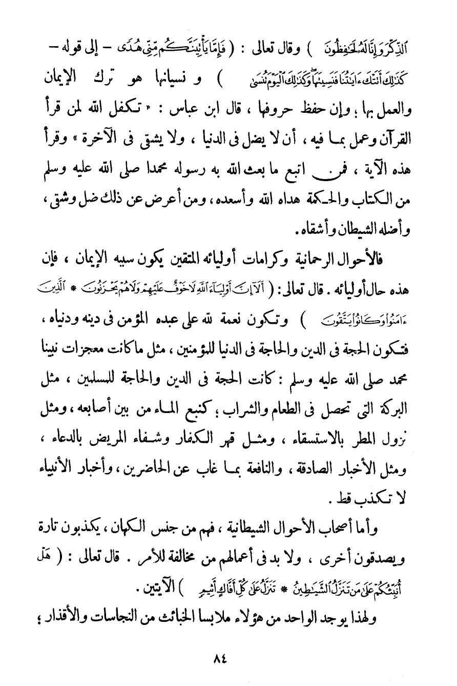 الذِّكْرَ وَإِنَّا لَهُ لَحَافِظُونَ} وَقَالَ تَعَالَى: {فَإِمَّا يَأْتِيَنَّكُمْ مِنِّي هُدًى} - إلَى قَوْلِهِ - {كَذَلِكَ أَتَتْكَ آيَاتُنَا فَنَسِيتَهَا وَكَذَلِكَ الْيَوْمَ تُنْسَى} وَنِسْيَانُهَا هُوَ تَرْكُ الْإِيمَانِ وَالْعَمَلِ بِهَا وَإِنْ حَفِظَ حُرُوفَهَا قَالَ ابْنُ عَبَّاسٍ: " تَكَفَّلَ اللَّهُ لِمَنْ قَرَأَ الْقُرْآنَ وَعَمِلَ بِمَا فِيهِ أَنْ لَا يَضِلَّ فِي الدُّنْيَا وَلَا يَشْقَى فِي الْآخِرَةِ " وَقَرَأَ هَذِهِ الْآيَةَ. فَمَنْ اتَّبَعَ مَا بَعَثَ اللَّهُ بِهِ رَسُولَهُ مُحَمَّدًا صَلَّى اللَّهُ عَلَيْهِ وَسَلَّمَ مِنْ الْكِتَابِ وَالْحِكْمَةِ هَدَاهُ اللَّهُ وَأَسْعَدَهُ وَمَنْ أَعْرَضَ عَنْ ذَلِكَ ضَلَّ وَشَقِيَ وَأَضَلَّهُ الشَّيْطَانُ وَأَشْقَاهُ. فَالْأَحْوَالُ الرَّحْمَانِيَّةُ وَكَرَامَاتُ أَوْلِيَائِهِ الْمُتَّقِينَ يَكُونُ سَبَبُهُ الْإِيمَانَ فَإِنَّ هَذِهِ حَالُ أَوْلِيَائِهِ. قَالَ تَعَالَى: {أَلَا إنَّ أَوْلِيَاءَ اللَّهِ لَا خَوْفٌ عَلَيْهِمْ وَلَا هُمْ يَحْزَنُونَ} {الَّذِينَ آمَنُوا وَكَانُوا يَتَّقُونَ} وَتَكُونُ نِعْمَةً لِلَّهِ عَلَى عَبْدِهِ الْمُؤْمِنِ فِي دِينِهِ وَدُنْيَاهُ فَتَكُونُ الْحُجَّةَ فِي الدِّينِ وَالْحَاجَةَ فِي الدُّنْيَا لِلْمُؤْمِنِينَ مِثْلَمَا كَانَتْ مُعْجِزَاتُ نَبِيِّنَا مُحَمَّدٍ صَلَّى اللَّهُ عَلَيْهِ وَسَلَّمَ كَانَتْ الْحُجَّةَ فِي الدِّينِ وَالْحَاجَةَ لِلْمُسْلِمِينَ مِثْلُ الْبَرَكَةِ الَّتِي تَحْصُلُ فِي الطَّعَامِ وَالشَّرَابِ كَنَبْعِ الْمَاءِ مِنْ بَيْنِ أَصَابِعِهِ وَمِثْلُ نُزُولِ الْمَطَرِ بِالِاسْتِسْقَاءِ وَمِثْلُ قَهْرِ الْكُفَّارِ وَشِفَاءِ الْمَرِيضِ بِالدُّعَاءِ وَمِثْلُ الْأَخْبَارِ الصَّادِقَةِ وَالنَّافِعَةِ بِمَا غَابَ عَنْ الْحَاضِرِينَ وَأَخْبَارُ الْأَنْبِيَاءِ لَا تَكْذِبُ قَطُّ. وَأَمَّا أَصْحَابُ الْأَحْوَالِ الشَّيْطَانِيَّةِ فَهُمْ مِنْ جِنْسِ الْكُهَّانِ يَكْذِبُونَ تَارَةً وَيَصْدُقُونَ أُخْرَى وَلَا بُدَّ فِي أَعْمَالِهِمْ مِنْ مُخَالَفَةٍ لِلْأَمْرِ. قَالَ تَعَالَى: {هَلْ أُنَبِّئُكُمْ عَلَى مَنْ تَنَزَّلُ الشَّيَاطِينُ} {تَنَزَّلُ عَلَى كُلِّ أَفَّاكٍ أَثِيمٍ} الْآيَتَيْنِ. وَلِهَذَا يُوجَدُ الْوَاحِدُ مِنْ هَؤُلَاءِ مُلَابِسًا الْخَبَائِثَ مِنْ النَّجَاسَاتِ وَالْأَقْذَارِ