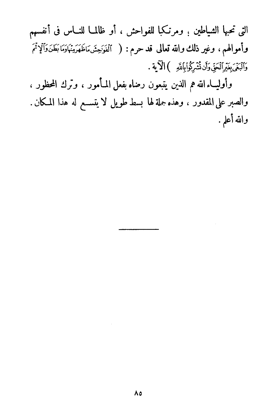 الَّتِي تُحِبُّهَا الشَّيَاطِينُ وَمُرْتَكِبًا لِلْفَوَاحِشِ أَوْ ظَالِمًا لِلنَّاسِ فِي أَنْفُسِهِمْ وَأَمْوَالِهِمْ وَغَيْرِ ذَلِكَ. وَاَللَّهُ تَعَالَى قَدْ حَرَّمَ: {الْفَوَاحِشَ مَا ظَهَرَ مِنْهَا وَمَا بَطَنَ وَالْإِثْمَ وَالْبَغْيَ بِغَيْرِ الْحَقِّ وَأَنْ تُشْرِكُوا بِاللَّهِ} الْآيَةَ. وَأَوْلِيَاءُ اللَّهِ هُمْ الَّذِينَ يَتَّبِعُونَ رِضَاهُ بِفِعْلِ الْمَأْمُورِ وَتَرْكِ الْمَحْظُورِ وَالصَّبْرِ عَلَى الْمَقْدُورِ وَهَذِهِ جُمْلَةٌ لَهَا بَسْطٌ طَوِيلٌ لَا يَتَّسِعُ لَهُ هَذَا الْمَكَانُ. وَاَللَّهُ أَعْلَمُ.