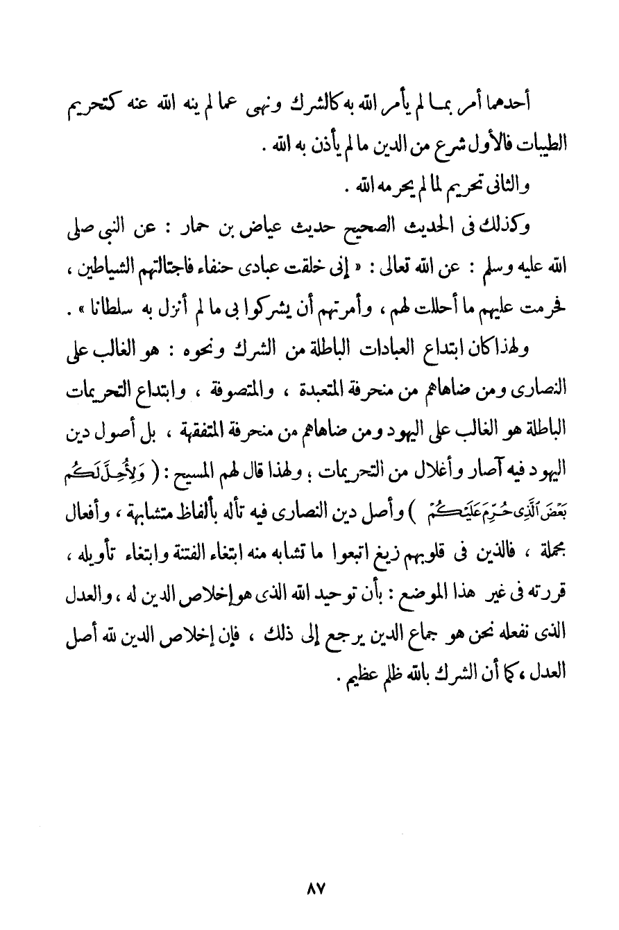 أَحَدُهُمَا: أَمْرٌ بِمَا لَمْ يَأْمُرْ اللَّهُ بِهِ كَالشِّرْكِ وَنَهْيٌ عَمَّا لَمْ يَنْهَ اللَّهُ عَنْهُ كَتَحْرِيمِ الطَّيِّبَاتِ. فَالْأَوَّلُ: شِرْعٌ مِنْ الدِّينِ مَا لَمْ يَأْذَنْ بِهِ اللَّهُ. وَالثَّانِي: تَحْرِيمٌ لِمَا لَمْ يُحَرِّمْهُ اللَّهُ. وَكَذَلِكَ فِي الْحَدِيثِ الصَّحِيحِ حَدِيثِ عِيَاضِ بْنِ حِمَارٍ: عَنْ النَّبِيِّ صَلَّى اللَّهُ عَلَيْهِ وَسَلَّمَ عَنْ اللَّهِ تَعَالَى: {إنِّي خَلَقْتُ عِبَادِي حُنَفَاءَ فَاجْتَالَتْهُمْ الشَّيَاطِينُ فَحَرَّمَتْ عَلَيْهِمْ مَا أَحْلَلْتُ لَهُمْ وَأَمَرَتْهُمْ أَنْ يُشْرِكُوا بِي مَا لَمْ أُنَزِّلْ بِهِ سُلْطَانًا} . وَلِهَذَا كَانَ ابْتِدَاعُ الْعِبَادَاتِ الْبَاطِلَةِ مِنْ الشِّرْكِ وَنَحْوِهِ: هُوَ الْغَالِبُ عَلَى النَّصَارَى وَمَنْ ضَاهَاهُمْ مِنْ مُنْحَرِفَةِ الْمُتَعَبِّدَةِ وَالْمُتَصَوِّفَةِ، وَابْتِدَاعُ التَّحْرِيمَاتِ الْبَاطِلَةِ هُوَ الْغَالِبُ عَلَى الْيَهُودِ وَمَنْ ضَاهَاهُمْ مِنْ مُنْحَرِفَةِ الْمُتَفَقِّهَةِ بَلْ أُصُولُ دِينِ الْيَهُودِ فِيهِ آصَارٌ وَأَغْلَالٌ مِنْ التَّحْرِيمَاتِ وَلِهَذَا قَالَ لَهُمْ الْمَسِيحُ: {وَلِأُحِلَّ لَكُمْ بَعْضَ الَّذِي حُرِّمَ عَلَيْكُمْ} وَأَصْلُ دِينِ النَّصَارَى فِيهِ تَأَلُّهٌ بِأَلْفَاظِ مُتَشَابِهَةٍ وَأَفْعَالٍ مُجْمَلَةٍ فَاَلَّذِينَ فِي قُلُوبِهِمْ زَيْغٌ اتَّبَعُوا مَا تَشَابَهَ مِنْهُ ابْتِغَاءَ الْفِتْنَةِ وَابْتِغَاءَ تَأْوِيلِهِ. قَرَّرْتُهُ فِي غَيْرِ هَذَا الْمَوْضِعِ بِأَنَّ تَوْحِيدَ اللَّهِ الَّذِي هُوَ إخْلَاصُ الدِّينِ لَهُ وَالْعَدْلَ الَّذِي نَفْعَلُهُ نَحْنُ هُوَ جِمَاعُ الدِّينِ يَرْجِعُ إلَى ذَلِكَ فَإِنَّ إخْلَاصَ الدِّينِ لِلَّهِ أَصْلُ الْعَدْلِ كَمَا أَنَّ الشِّرْكَ بِاَللَّهِ ظُلْمٌ عَظِيمٌ.