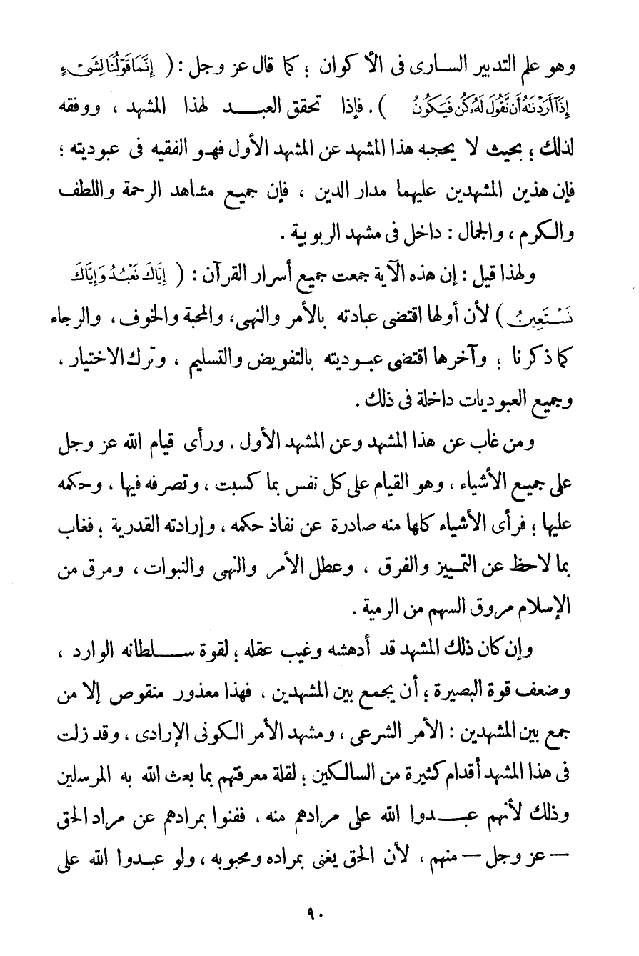 وَهُوَ عِلْمُ التَّدْبِيرِ السَّارِي فِي الْأَكْوَانِ كَمَا قَالَ عَزَّ وَجَلَّ: {إنَّمَا قَوْلُنَا لِشَيْءٍ إذَا أَرَدْنَاهُ أَنْ نَقُولَ لَهُ كُنْ فَيَكُونُ} . فَإِذَا تَحَقَّقَ الْعَبْدُ لِهَذَا الْمَشْهَدِ وَوَفَّقَهُ لِذَلِكَ بِحَيْثُ لَا يَحْجُبُهُ هَذَا الْمَشْهَدُ عَنْ الْمَشْهَدِ الْأَوَّلِ فَهُوَ الْفَقِيهُ فِي عُبُودِيَّتِهِ فَإِنَّ هَذَيْنِ الْمَشْهَدَيْنِ عَلَيْهِمَا مَدَارُ الدِّينِ فَإِنَّ جَمِيعَ مَشَاهِدِ الرَّحْمَةِ وَاللُّطْفِ وَالْكَرَمِ وَالْجَمَالِ دَاخِلَةٌ فِي مَشْهَدِ الرُّبُوبِيَّةِ. وَلِهَذَا قِيلَ: إنَّ هَذِهِ الْآيَةَ جَمَعَتْ جَمِيعَ أَسْرَارِ الْقُرْآنِ: {إيَّاكَ نَعْبُدُ وَإِيَّاكَ نَسْتَعِينُ} لِأَنَّ أَوَّلَهَا اقْتَضَى عِبَادَتَهُ بِالْأَمْرِ وَالنَّهْيِ وَالْمَحَبَّةِ وَالْخَوْفِ وَالرَّجَاءِ كَمَا ذَكَرْنَا وَآخِرَهَا اقْتَضَى عُبُودِيَّتَهُ بِالتَّفْوِيضِ وَالتَّسْلِيمِ وَتَرْكِ الِاخْتِيَارِ. وَجَمِيعُ الْعُبُودِيَّاتِ دَاخِلَةٌ فِي ذَلِكَ. وَمَنْ غَابَ عَنْ هَذَا الْمَشْهَدِ وَعَنْ الْمَشْهَدِ الْأَوَّلِ وَرَأَى قِيَامَ اللَّهِ عَزَّ وَجَلَّ عَلَى جَمِيعِ الْأَشْيَاءِ وَهُوَ الْقِيَامُ عَلَى كُلِّ نَفْسٍ بِمَا كَسَبَتْ وَتَصَرُّفَهُ فِيهَا وَحُكْمَهُ عَلَيْهَا فَرَأَى الْأَشْيَاءَ كُلَّهَا مِنْهُ صَادِرَةً عَنْ نَفَاذِ حُكْمِهِ وَإِرَادَتِهِ الْقَادِرَةِ فَغَابَ بِمَا لَاحَظَ عَنْ التَّمْيِيزِ وَالْفَرْقِ وَعَطَّلَ الْأَمْرَ وَالنَّهْيَ وَالنُّبُوَّاتِ وَمَرَقَ مِنْ الْإِسْلَامِ مُرُوقَ السَّهْمِ مِنْ الرَّمِيَّةِ. وَإِنْ كَانَ ذَلِكَ الْمَشْهَدُ قَدْ أَدْهَشَهُ وَغَيَّبَ عَقْلَهُ لِقُوَّةِ سُلْطَانِهِ الْوَارِدِ وَضَعْفِ قُوَّةِ الْبَصِيرَةِ أَنْ يَجْمَعَ بَيْنَ الْمَشْهَدَيْنِ فَهَذَا مَعْذُورٌ مَنْقُوصٌ إلَّا مَنْ جَمَعَ بَيْنَ الْمَشْهَدَيْنِ: الْأَمْرِ الشَّرْعِيِّ وَمَشْهَدِ الْأَمْرِ الْكَوْنِيِّ الْإِرَادِيِّ وَقَدْ زَلَّتْ فِي هَذَا الْمَشْهَدِ أَقْدَامٌ كَثِيرَةٌ مِنْ السَّالِكِينَ لِقِلَّةِ مَعْرِفَتِهِمْ بِمَا بَعَثَ اللَّهُ بِهِ الْمُرْسَلِينَ وَذَلِكَ لِأَنَّهُمْ عَبَدُوا اللَّهَ عَلَى مُرَادِهِمْ مِنْهُ فَفَنُوا بِمُرَادِهِمْ عَنْ مُرَادِ الْحَقِّ - عَزَّ وَجَلَّ - مِنْهُمْ لِأَنَّ الْحَقَّ يُغْنِي بِمُرَادِهِ وَمَحْبُوبِهِ وَلَوْ عَبَدُوا اللَّهَ عَلَى مُرَادِهِ