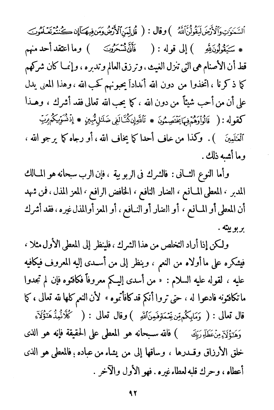 السَّمَاوَاتِ وَالْأَرْضَ وَسَخَّرَ الشَّمْسَ وَالْقَمَرَ لَيَقُولُنَّ اللَّهُ} وَقَالَ: {قُلْ لِمَنِ الْأَرْضُ وَمَنْ فِيهَا إنْ كُنْتُمْ تَعْلَمُونَ سَيَقُولُونَ لِلَّهِ} إلَى قَوْلِهِ: {فَأَنَّى تُسْحَرُونَ} وَمَا اعْتَقَدَ أَحَدٌ مِنْهُمْ قَطُّ أَنَّ الْأَصْنَامَ هِيَ الَّتِي تُنْزِلُ الْغَيْثَ وَتَرْزُقُ الْعَالَمَ وَتُدَبِّرُهُ وَإِنَّمَا كَانَ شِرْكُهُمْ كَمَا ذَكَرْنَا أَنْ اتَّخَذُوا مَنْ دُونِ اللَّهِ أَنْدَادًا يُحِبُّونَهُمْ كَحُبِّ اللَّهِ وَهَذَا الْمَعْنَى يَدُلُّ عَلَى أَنَّ مَنْ أَحَبَّ شَيْئًا مِنْ دُونِ اللَّهِ كَمَا يُحِبُّ اللَّهَ تَعَالَى فَقَدْ أَشْرَكَ وَهَذَا كَقَوْلِهِ: {قَالُوا وَهُمْ فِيهَا يَخْتَصِمُونَ} {تَاللَّهِ إنْ كُنَّا لَفِي ضَلَالٍ مُبِينٍ} {إذْ نُسَوِّيكُمْ بِرَبِّ الْعَالَمِينَ} . وَكَذَا مَنْ خَافَ أَحَدًا كَمَا يَخَافُ اللَّهَ أَوْ رَجَاهُ كَمَا يَرْجُو اللَّهَ وَمَا أَشْبَهَ ذَلِكَ. وَأَمَّا النَّوْعُ الثَّانِي: فَالشِّرْكُ فِي الرُّبُوبِيَّةِ فَإِنَّ الرَّبَّ سُبْحَانَهُ هُوَ الْمَالِكُ الْمُدَبِّرُ الْمُعْطِي الْمَانِعُ الضَّارُّ النَّافِعُ الْخَافِضُ الرَّافِعُ الْمُعِزُّ الْمُذِلُّ فَمَنْ شَهِدَ أَنَّ الْمُعْطِيَ أَوْ الْمَانِعَ أَوْ الضَّارَّ أَوْ النَّافِعَ أَوْ الْمُعِزَّ أَوْ الْمُذِلَّ غَيْرُهُ فَقَدْ أَشْرَكَ بِرُبُوبِيَّتِهِ. وَلَكِنْ إذَا أَرَادَ التَّخَلُّصَ مِنْ هَذَا الشِّرْكِ فَلْيَنْظُرْ إلَى الْمُعْطِي الْأَوَّلِ مَثَلًا فَيَشْكُرَهُ عَلَى مَا أَوْلَاهُ مِنْ النِّعَمِ وَيَنْظُرْ إلَى مَنْ أَسْدَى إلَيْهِ الْمَعْرُوفَ فَيُكَافِئَهُ عَلَيْهِ لِقَوْلِهِ عَلَيْهِ السَّلَامُ {مَنْ أَسْدَى إلَيْكُمْ مَعْرُوفًا فَكَافِئُوهُ فَإِنْ لَمْ تَجِدُوا مَا تُكَافِئُونَهُ فَادْعُوَا لَهُ حَتَّى تَرَوْا أَنَّكُمْ قَدْ كَافَأْتُمُوهُ} لِأَنَّ النِّعَمَ كُلَّهَا لِلَّهِ تَعَالَى كَمَا قَالَ تَعَالَى: {وَمَا بِكُمْ مِنْ نِعْمَةٍ فَمِنَ اللَّهِ} وَقَالَ تَعَالَى: {كُلًّا نُمِدُّ هَؤُلَاءِ وَهَؤُلَاءِ مِنْ عَطَاءِ رَبِّكَ} فَاَللَّهُ سُبْحَانَهُ هُوَ الْمُعْطِي عَلَى الْحَقِيقَةِ فَإِنَّهُ هُوَ الَّذِي خَلَقَ الْأَرْزَاقَ وَقَدَّرَهَا وَسَاقَهَا إلَى مَنْ يَشَاءُ مِنْ عِبَادِهِ فَالْمُعْطِي هُوَ الَّذِي أَعْطَاهُ وَحَرَّكَ قَلْبَهُ لِعَطَاءِ غَيْرِهِ. فَهُوَ الْأَوَّلُ وَالْآخِرُ.