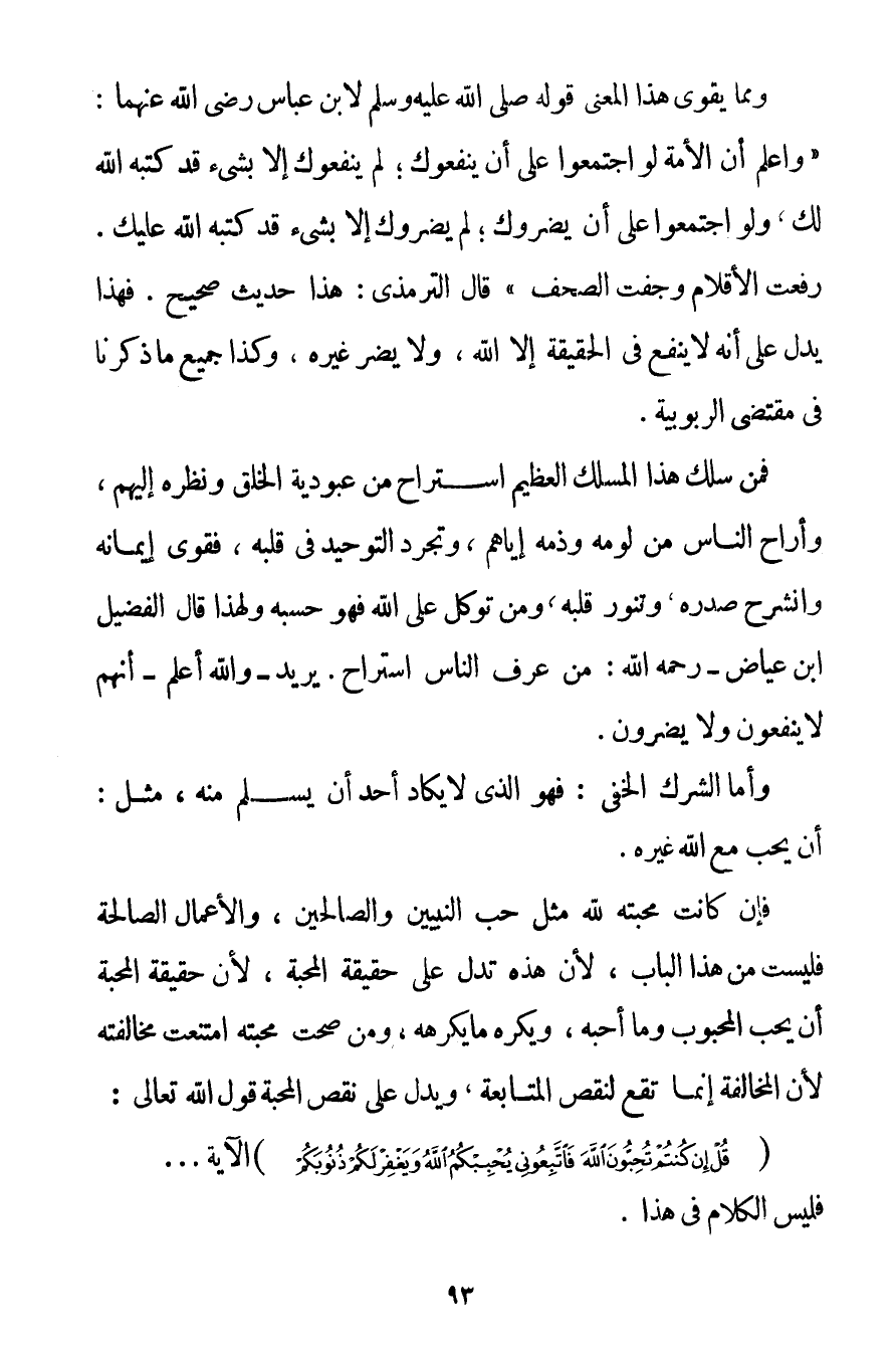 وَمِمَّا يُقَوِّي هَذَا الْمَعْنَى قَوْلُهُ صَلَّى اللَّهُ عَلَيْهِ وَسَلَّمَ لِابْنِ عَبَّاسٍ رَضِيَ اللَّهُ عَنْهُ {وَاعْلَمْ أَنَّ الْأُمَّةَ لَوْ اجْتَمَعُوا عَلَى أَنْ يَنْفَعُوك لَمْ يَنْفَعُوك إلَّا بِشَيْءِ قَدْ كَتَبَهُ اللَّهُ لَك وَلَوْ اجْتَمَعُوا عَلَى أَنْ يَضُرُّوك لَمْ يَضُرُّوكَ إلَّا بِشَيْءِ قَدْ كَتَبَهُ اللَّهُ عَلَيْكَ. رُفِعَتْ الْأَقْلَامُ وَجَفَّتْ الصُّحُفُ} قَالَ التِّرْمِذِيُّ: هَذَا حَدِيثٌ صَحِيحٌ. فَهَذَا يَدُلُّ عَلَى أَنَّهُ لَا يَنْفَعُ فِي الْحَقِيقَةِ إلَّا اللَّهُ وَلَا يَضُرُّ غَيْرُهُ وَكَذَا جَمِيعُ مَا ذَكَرْنَا فِي مُقْتَضَى الرُّبُوبِيَّةِ. فَمَنْ سَلَكَ هَذَا الْمَسْلَكَ الْعَظِيمَ اسْتَرَاحَ مِنْ عُبُودِيَّةِ الْخَلْقِ وَنَظَرِهِ إلَيْهِمْ وَأَرَاحَ النَّاسَ مِنْ لَوْمِهِ وَذَمِّهِ إيَّاهُمْ وَتَجَرَّدَ التَّوْحِيدُ فِي قَلْبِهِ فَقَوِيَ إيمَانُهُ وَانْشَرَحَ صَدْرُهُ وَتَنَوَّرَ قَلْبُهُ وَمَنْ تَوَكَّلَ عَلَى اللَّهِ فَهُوَ حَسْبُهُ وَلِهَذَا قَالَ الْفُضَيْل بْنُ عِيَاضٍ رَحِمَهُ اللَّهُ مَنْ عَرَفَ النَّاسَ اسْتَرَاحَ. يُرِيدُ - وَاَللَّهُ أَعْلَمُ - أَنَّهُمْ لَا يَنْفَعُونَ وَلَا يَضُرُّونَ. وَأَمَّا الشِّرْكُ الْخَفِيُّ فَهُوَ الَّذِي لَا يَكَادُ أَحَدٌ أَنْ يَسْلَمَ مِنْهُ مِثْلُ أَنْ يُحِبَّ مَعَ اللَّهِ غَيْرَهُ. فَإِنْ كَانَتْ مَحَبَّتُهُ لِلَّهِ مِثْلَ حُبِّ النَّبِيِّينَ وَالصَّالِحِينَ وَالْأَعْمَالِ الصَّالِحَةِ فَلَيْسَتْ مِنْ هَذَا الْبَابِ لِأَنَّ هَذِهِ تَدُلُّ عَلَى حَقِيقَةِ الْمَحَبَّةِ لِأَنَّ حَقِيقَةَ الْمَحَبَّةِ أَنْ يُحِبَّ الْمَحْبُوبَ وَمَا أَحَبَّهُ وَيَكْرَهَ مَا يَكْرَهُهُ وَمَنْ صَحَّتْ مَحَبَّتُهُ امْتَنَعَتْ مُخَالَفَتُهُ لِأَنَّ الْمُخَالَفَةَ إنَّمَا تَقَعُ لِنَقْصِ الْمُتَابَعَةِ وَيَدُلُّ عَلَى نَقْصِ الْمَحَبَّةِ قَوْلُ اللَّهِ تَعَالَى {قُلْ إنْ كُنْتُمْ تُحِبُّونَ اللَّهَ فَاتَّبِعُونِي يُحْبِبْكُمُ اللَّهُ وَيَغْفِرْ لَكُمْ ذُنُوبَكُمْ} الْآيَةَ. فَلَيْسَ الْكَلَامُ فِي هَذَا.