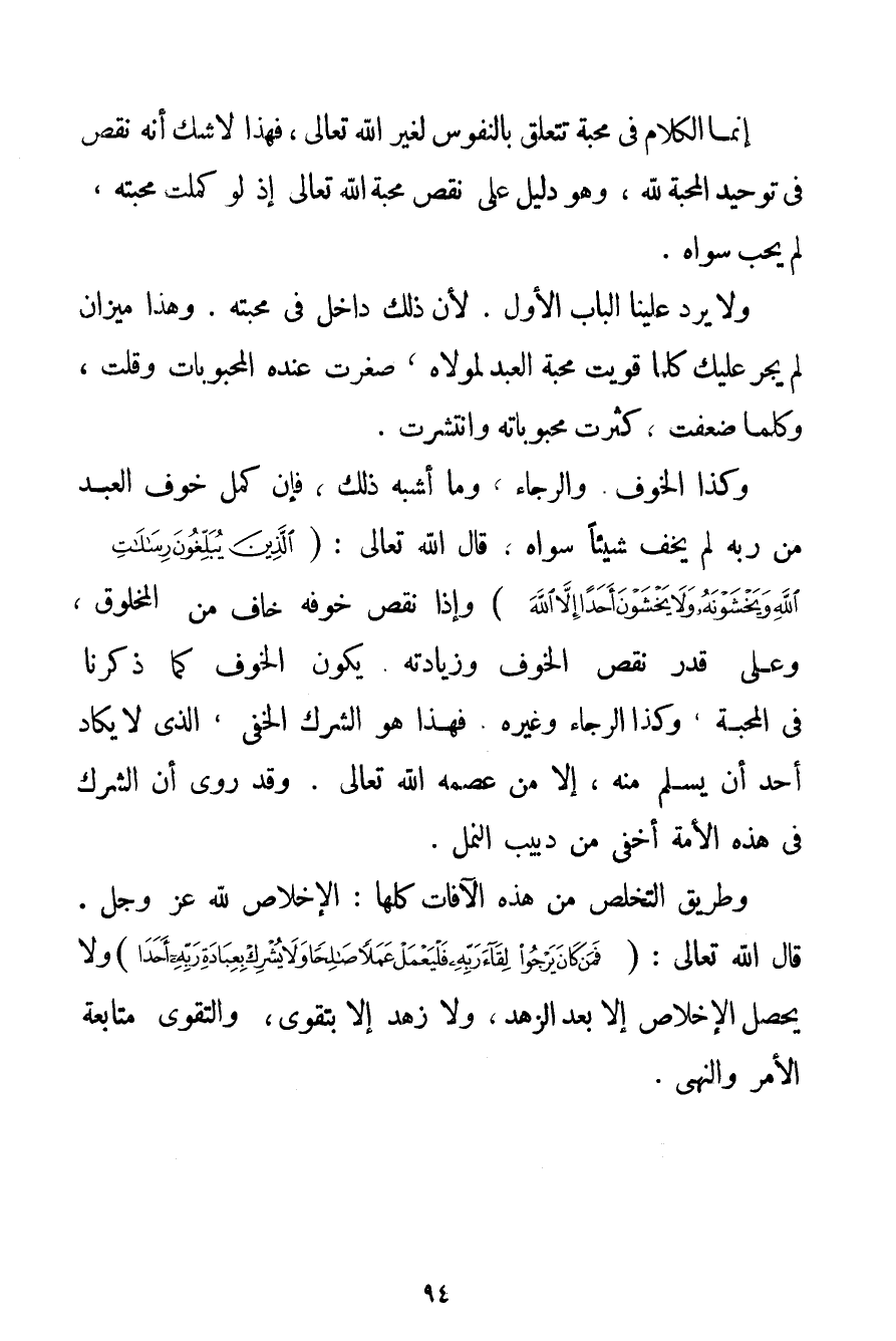 إنَّمَا الْكَلَامُ فِي مَحَبَّةٍ تَتَعَلَّقُ بِالنُّفُوسِ لِغَيْرِ اللَّهِ تَعَالَى فَهَذَا لَا شَكَّ أَنَّهُ نَقْصٌ فِي تَوْحِيدِ الْمَحَبَّةِ لِلَّهِ وَهُوَ دَلِيلٌ عَلَى نَقْصِ مَحَبَّةِ اللَّهِ تَعَالَى إذْ لَوْ كَمُلَتْ مَحَبَّتُهُ لَمْ يُحِبَّ سِوَاهُ. وَلَا يَرُدُّ عَلَيْنَا الْبَابُ الْأَوَّلُ لِأَنَّ ذَلِكَ دَاخِلٌ فِي مَحَبَّتِهِ. وَهَذَا مِيزَانٌ لَمْ يَجْرِ عَلَيْكَ: كُلَّمَا قَوِيَتْ مَحَبَّةُ الْعَبْدِ لِمَوْلَاهُ صَغُرَتْ عِنْدَهُ الْمَحْبُوبَاتُ وَقَلَّتْ، وَكُلَّمَا ضَعُفَتْ كَثُرَتْ مَحْبُوبَاتُهُ وَانْتَشَرَتْ. وَكَذَا الْخَوْفُ وَالرَّجَاءُ وَمَا أَشْبَهَ ذَلِكَ فَإِنْ كَمُلَ خَوْفُ الْعَبْدِ مِنْ رَبِّهِ لَمْ يَخَفْ شَيْئًا سِوَاهُ قَالَ اللَّهُ تَعَالَى {الَّذِينَ يُبَلِّغُونَ رِسَالَاتِ اللَّهِ وَيَخْشَوْنَهُ وَلَا يَخْشَوْنَ أَحَدًا إلَّا اللَّهَ} وَإِذَا نَقَصَ خَوْفُهُ خَافَ مِنْ الْمَخْلُوقِ وَعَلَى قَدْرِ نَقْصِ الْخَوْفِ وَزِيَادَتِهِ يَكُونُ الْخَوْفُ كَمَا ذَكَرْنَا فِي الْمَحَبَّةِ وَكَذَا الرَّجَاءُ وَغَيْرُهُ. فَهَذَا هُوَ الشِّرْكُ الْخَفِيُّ الَّذِي لَا يَكَادُ أَحَدٌ أَنْ يَسْلَمَ مِنْهُ إلَّا مَنْ عَصَمَهُ اللَّهُ تَعَالَى. وَقَدْ رُوِيَ أَنَّ الشِّرْكَ فِي هَذِهِ الْأُمَّةِ أَخْفَى مِنْ دَبِيبِ النَّمْلِ. وَطَرِيقُ التَّخَلُّصِ مِنْ هَذِهِ الْآفَاتِ كُلِّهَا الْإِخْلَاصُ لِلَّهِ عَزَّ وَجَلَّ قَالَ اللَّهُ تَعَالَى {فَمَنْ كَانَ يَرْجُوا لِقَاءَ رَبِّهِ فَلْيَعْمَلْ عَمَلًا صَالِحًا وَلَا يُشْرِكْ بِعِبَادَةِ رَبِّهِ أَحَدًا} وَلَا يَحْصُلُ الْإِخْلَاصُ إلَّا بَعْدَ الزُّهْدِ وَلَا زُهْدَ إلَّا بِتَقْوَى وَالتَّقْوَى مُتَابَعَةُ الْأَمْرِ وَالنَّهْيِ.