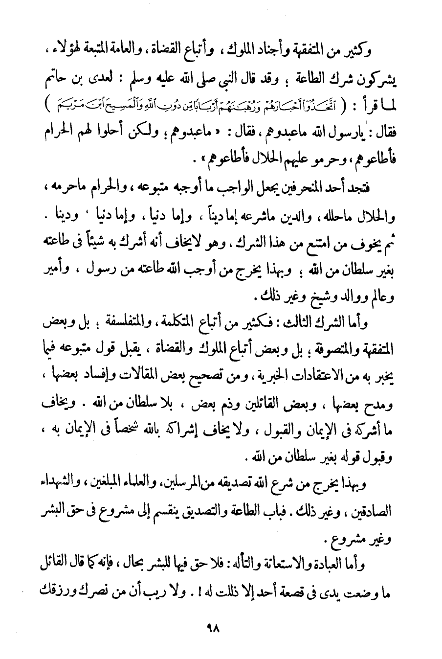 وَكَثِيرٌ مِنْ الْمُتَفَقِّهَةِ وَأَجْنَادِ الْمُلُوكِ وَأَتْبَاعِ الْقُضَاةِ وَالْعَامَّةِ الْمُتَّبِعَةِ لِهَؤُلَاءِ يُشْرِكُونَ شِرْكَ الطَّاعَةِ وَقَدْ {قَالَ النَّبِيُّ صَلَّى اللَّهُ عَلَيْهِ وَسَلَّمَ لِعَدِيِّ بْنِ حَاتِمٍ لَمَّا قَرَأَ {اتَّخَذُوا أَحْبَارَهُمْ وَرُهْبَانَهُمْ أَرْبَابًا مِنْ دُونِ اللَّهِ وَالْمَسِيحَ ابْنَ مَرْيَمَ} فَقَالَ يَا رَسُولَ اللَّهِ مَا عَبَدُوهُمْ فَقَالَ مَا عَبَدُوهُمْ وَلَكِنْ أَحَلُّوا لَهُمْ الْحَرَامَ فَأَطَاعُوهُمْ وَحَرَّمُوا عَلَيْهِمْ الْحَلَالَ فَأَطَاعُوهُمْ} . فَتَجِدُ أَحَدَ الْمُنْحَرِفِينَ يَجْعَلُ الْوَاجِبَ مَا أَوْجَبَهُ مَتْبُوعُهُ وَالْحَرَامَ مَا حَرَّمَهُ وَالْحَلَالَ مَا حَلَّلَهُ وَالدِّينَ مَا شَرَعَهُ إمَّا دِينًا وَإِمَّا دُنْيَا وَإِمَّا دُنْيَا وَدِينًا. ثُمَّ يُخَوِّفُ مَنْ امْتَنَعَ مِنْ هَذَا الشِّرْكِ وَهُوَ لَا يَخَافُ أَنَّهُ أَشْرَكَ بِهِ شَيْئًا فِي طَاعَتِهِ بِغَيْرِ سُلْطَانٍ مِنْ اللَّهِ وَبِهَذَا يَخْرُجُ مَنْ أَوْجَبَ اللَّهُ طَاعَتَهُ مِنْ رَسُولٍ وَأَمِيرٍ وَعَالِمٍ وَوَالِدٍ وَشَيْخٍ وَغَيْرِ ذَلِكَ. وَأَمَّا الشِّرْكُ الثَّالِثُ فَكَثِيرٌ مِنْ أَتْبَاعِ الْمُتَكَلِّمَةِ والمتفلسفة بَلْ وَبَعْضِ الْمُتَفَقِّهَةِ وَالْمُتَصَوِّفَةِ بَلْ وَبَعْضِ أَتْبَاعِ الْمُلُوكِ وَالْقُضَاةِ يَقْبَلُ قَوْلَ مَتْبُوعِهِ فِيمَا يُخْبِرُ بِهِ مِنْ الِاعْتِقَادَاتِ الْخَبَرِيَّةِ وَمِنْ تَصْحِيحِ بَعْضِ الْمَقَالَاتِ وَإِفْسَادِ بَعْضِهَا وَمَدْحِ بَعْضِهَا وَبَعْضِ الْقَائِلِينَ وَذَمِّ بَعْضٍ بِلَا سُلْطَانٍ مِنْ اللَّهِ. وَيَخَافُ مَا أَشْرَكَهُ فِي الْإِيمَانِ وَالْقَبُولِ وَلَا يَخَافُ إشْرَاكَهُ بِاَللَّهِ شَخْصًا فِي الْإِيمَانِ بِهِ وَقَبُولِ قَوْلِهِ بِغَيْرِ سُلْطَانٍ مِنْ اللَّهِ. وَبِهَذَا يَخْرُجُ مَنْ شَرَعَ اللَّهُ تَصْدِيقَهُ مِنْ الْمُرْسَلِينَ وَالْعُلَمَاءِ الْمُبَلِّغِينَ وَالشُّهَدَاءِ الصَّادِقِينَ وَغَيْرِ ذَلِكَ. فَبَابُ الطَّاعَةِ وَالتَّصْدِيقِ يَنْقَسِمُ إلَى مَشْرُوعٍ فِي حَقِّ الْبَشَرِ وَغَيْرِ مَشْرُوعٍ. وَأَمَّا الْعِبَادَةُ وَالِاسْتِعَانَةُ وَالتَّأَلُّهُ فَلَا حَقَّ فِيهَا لِلْبَشَرِ بِحَالِ فَإِنَّهُ كَمَا قَالَ الْقَائِلُ مَا وَضَعْتُ يَدِي فِي قَصْعَةِ أَحَدٍ إلَّا ذَلَلْتُ لَهُ. وَلَا رَيْبَ أَنَّ مَنْ نَصَرَكَ وَرَزَقَكَ