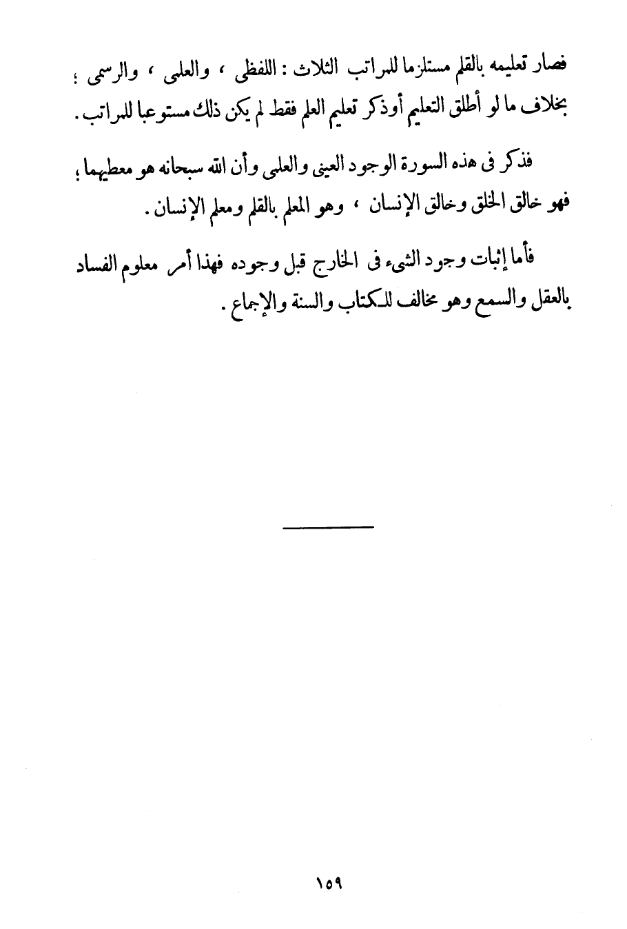 فَصَارَ تَعْلِيمُهُ بِالْقَلَمِ مُسْتَلْزِمًا لِلْمَرَاتِبِ الثَّلَاثِ: اللَّفْظِيِّ وَالْعِلْمِيِّ وَالرَّسْمِيِّ؛ بِخِلَافِ مَا لَوْ أَطَلَقَ التَّعْلِيمَ أَوْ ذَكَرَ تَعْلِيمَ الْعِلْمِ فَقَطْ لَمْ يَكُنْ ذَلِكَ مُسْتَوْعِبًا لِلْمَرَاتِبِ. فَذَكَرَ فِي هَذِهِ السُّورَةِ الْوُجُودَ الْعَيْنِيَّ وَالْعِلْمِيَّ وَأَنَّ اللَّهَ سُبْحَانَهُ هُوَ مُعْطِيهِمَا؛ فَهُوَ خَالِقُ الْخَلْقِ وَخَالِقُ الْإِنْسَانِ وَهُوَ الْمُعَلِّمُ بِالْقَلَمِ وَمُعَلِّمُ الْإِنْسَانِ. فَأَمَّا إثْبَاتُ وُجُودِ الشَّيْءِ فِي الْخَارِجِ قَبْلَ وُجُودِهِ فَهَذَا أَمْرٌ مَعْلُومُ الْفَسَادِ بِالْعَقْلِ وَالسَّمْعِ وَهُوَ مُخَالِفٌ لِلْكِتَابِ وَالسُّنَّةِ وَالْإِجْمَاعِ.