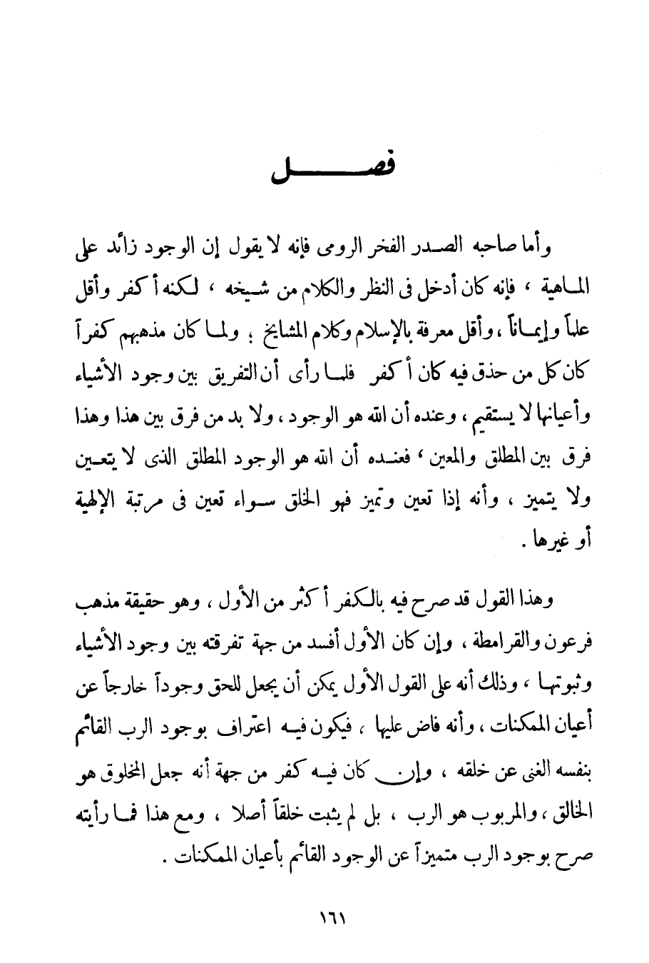 وَأَمَّا صَاحِبُهُ الصَّدْرُ الْفَخْرُ الرُّومِيُّ فَإِنَّهُ لَا يَقُولُ إنَّ الْوُجُودَ زَائِدٌ عَلَى الْمَاهِيَّةِ فَإِنَّهُ كَانَ أَدْخَلَ فِي النَّظَرِ وَالْكَلَامِ مِنْ شَيْخِهِ لَكِنَّهُ أَكْفَرُ وَأَقَلُّ عِلْمًا وَإِيمَانًا وَأَقَلُّ مَعْرِفَةً بِالْإِسْلَامِ وَكَلَامِ الْمَشَايِخِ؛ وَلَمَّا كَانَ مَذْهَبُهُمْ كُفْرًا كَانَ كُلُّ مَنْ حَذَقَ فِيهِ كَانَ أَكْفَرَ فَلَمَّا رَأَى أَنَّ التَّفْرِيقَ بَيْنَ وُجُودِ الْأَشْيَاءِ وَأَعْيَانِهَا لَا يَسْتَقِيمُ وَعِنْدَهُ أَنَّ اللَّهَ هُوَ الْوُجُودُ وَلَا بُدَّ مِنْ فَرْقٍ بَيْنَ هَذَا وَهَذَا فَرْقٌ بَيْنَ الْمُطْلَقِ وَالْمُعَيَّنِ فَعِنْدَهُ أَنَّ اللَّهَ هُوَ الْوُجُودُ الْمُطْلَقُ الَّذِي لَا يَتَعَيَّنُ وَلَا يَتَمَيَّزُ وَأَنَّهُ إذَا تَعَيَّنَ وَتَمَيَّزَ فَهُوَ الْخَلْقُ سَوَاءٌ تَعَيَّنَ فِي مَرْتَبَةِ الْإِلَهِيَّةِ أَوْ غَيْرِهَا. وَهَذَا الْقَوْلُ قَدْ صَرَّحَ فِيهِ بِالْكُفْرِ أَكْثَرَ مِنْ الْأَوَّلِ وَهُوَ حَقِيقَةُ مَذْهَبِ فِرْعَوْنَ وَالْقَرَامِطَةِ وَإِنْ كَانَ الْأَوَّلُ أَفْسَدَ مِنْ جِهَةِ تَفْرِقَتِهِ بَيْنَ وُجُودِ الْأَشْيَاءِ وَثُبُوتِهَا وَذَلِكَ أَنَّهُ عَلَى الْقَوْلِ الْأَوَّلِ يُمْكِنُ أَنْ يُجْعَلَ لِلْحَقِّ وُجُودًا خَارِجًا عَنْ أَعْيَانِ الْمُمْكِنَاتِ وَأَنَّهُ فَاضَ عَلَيْهَا فَيَكُونُ فِيهِ اعْتِرَافٌ بِوُجُودِ الرَّبِّ الْقَائِمِ بِنَفْسِهِ الْغَنِيِّ عَنْ خَلْقِهِ وَإِنْ كَانَ فِيهِ كُفْرٌ مِنْ جِهَةِ أَنَّهُ جَعَلَ الْمَخْلُوقَ هُوَ الْخَالِقَ وَالْمَرْبُوبَ هُوَ الرَّبَّ بَلْ لَمْ يُثْبِتْ خَلْقًا أَصْلًا وَمَعَ هَذَا فَمَا رَأَيْته صَرَّحَ بِوُجُودِ الرَّبِّ مُتَمَيِّزًا عَنْ الْوُجُودِ الْقَائِمِ بِأَعْيَانِ الْمُمْكِنَاتِ.