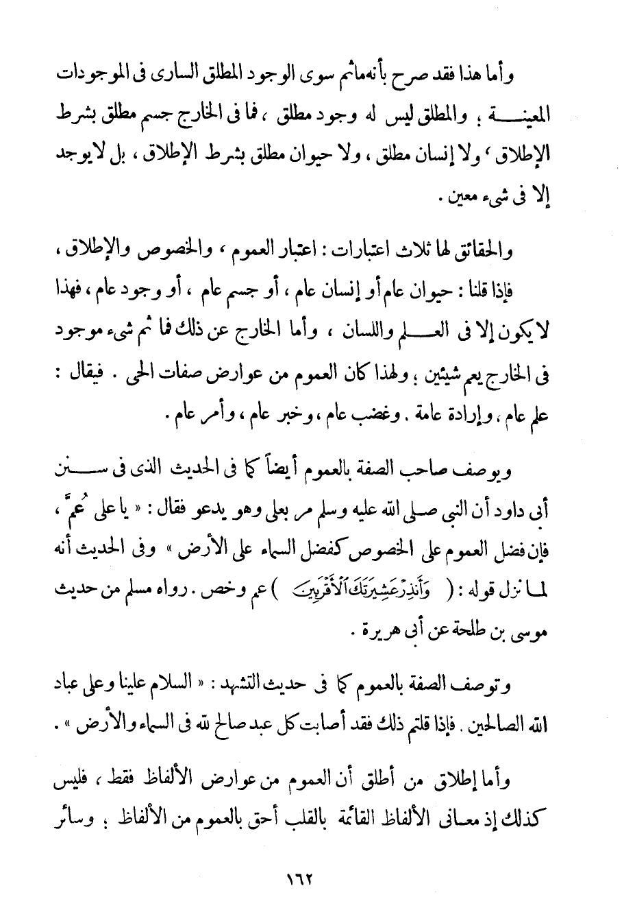 فَإِذَا قُلْنَا: حَيَوَانٌ عَامٌّ أَوْ إنْسَانٌ عَامٌّ أَوْ جِسْمٌ عَامٌّ أَوْ وُجُودٌ عَامٌّ فَهَذَا لَا يَكُونُ إلَّا فِي الْعِلْمِ وَاللِّسَانِ وَأَمَّا الْخَارِجُ عَنْ ذَلِكَ فَمَا ثَمَّ شَيْءٌ مَوْجُودٌ فِي الْخَارِجِ يَعُمُّ شَيْئَيْنِ؛ وَلِهَذَا كَانَ الْعُمُومُ مِنْ عَوَارِضِ صِفَاتِ الْحَيِّ. فَيُقَالُ: عِلْمٌ عَامٌّ وَإِرَادَةٌ عَامَّةٌ وَغَضَبٌ عَامٌّ وَخَبَرٌ عَامٌّ وَأَمْرٌ عَامٌّ. وَيُوصَفُ صَاحِبُ الصِّفَةِ بِالْعُمُومِ أَيْضًا كَمَا فِي الْحَدِيثِ الَّذِي فِي سُنَنِ أَبِي دَاوُد {أَنَّ النَّبِيَّ صَلَّى اللَّهُ عَلَيْهِ وَسَلَّمَ مَرَّ بِعَلِيِّ وَهُوَ يَدْعُو فَقَالَ: يَا عَلِيُّ عُمَّ فَإِنَّ فَضْلَ الْعُمُومِ عَلَى الْخُصُوصِ كَفَضْلِ السَّمَاءِ عَلَى الْأَرْضِ} وَفِي الْحَدِيثِ أَنَّهُ {لَمَّا نَزَلَ قَوْلُهُ: {وَأَنْذِرْ عَشِيرَتَكَ الْأَقْرَبِينَ} عَمَّ وَخَصَّ} . رَوَاهُ مُسْلِمٌ مِنْ حَدِيثِ مُوسَى بْنِ طَلْحَةَ عَنْ أَبِي هُرَيْرَةَ. وَتُوصَفُ الصِّفَةُ بِالْعُمُومِ كَمَا فِي حَدِيثِ التَّشَهُّدِ: {السَّلَامُ عَلَيْنَا وَعَلَى عِبَادِ اللَّهِ الصَّالِحِينَ. فَإِذَا قُلْتُمْ ذَلِكَ فَقَدْ أَصَابَتْ كُلَّ عَبْدٍ صَالِحٍ لِلَّهِ فِي السَّمَاءِ وَالْأَرْضِ} . وَأَمَّا إطْلَاقُ مَنْ أَطْلَقَ أَنَّ الْعُمُومَ مِنْ عَوَارِضِ الْأَلْفَاظِ فَقَطْ فَلَيْسَ كَذَلِكَ إذْ مَعَانِي الْأَلْفَاظِ الْقَائِمَةِ بِالْقَلْبِ أَحَقُّ بِالْعُمُومِ مِنْ الْأَلْفَاظِ؛ وَسَائِرُ الصِّفَاتِ
