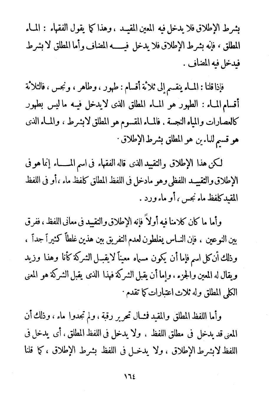 بِشَرْطِ الْإِطْلَاقِ فَلَا يَدْخُلُ فِيهِ الْمُعَيَّنُ الْمُقَيَّدُ وَهَذَا كَمَا يَقُولُ الْفُقَهَاءُ: الْمَاءُ الْمُطْلَقُ فَإِنَّهُ بِشَرْطِ الْإِطْلَاقِ فَلَا يَدْخُلُ فِيهِ الْمُضَافُ وَأَمَّا الْمُطْلَقُ لَا بِشَرْطِ فَيَدْخُلُ فِيهِ الْمُضَافُ. فَإِذَا قُلْنَا: الْمَاءُ يَنْقَسِمُ إلَى ثَلَاثَةِ أَقْسَامٍ: طَهُورٍ وَطَاهِرٍ وَنَجِسٍ فَالثَّلَاثَةُ أَقْسَامُ الْمَاءِ: الطَّهُورُ هُوَ الْمَاءُ الْمُطْلَقُ الَّذِي لَا يَدْخُلُ فِيهِ مَا لَيْسَ بِطَهُورِ كَالْعُصَارَاتِ وَالْمِيَاهِ النَّجِسَةِ فَالْمَاءُ الْمَقْسُومُ هُوَ الْمُطْلَقُ لَا بِشَرْطِ وَالْمَاءُ الَّذِي هُوَ قَسِيمٌ لِلْمَاءَيْنِ هُوَ الْمُطْلَقُ بِشَرْطِ الْإِطْلَاقِ. لَكِنَّ هَذَا الْإِطْلَاقَ وَالتَّقْيِيدَ الَّذِي قَالَهُ الْفُقَهَاءُ فِي اسْمِ الْمَاءِ إنَّمَا هُوَ فِي الْإِطْلَاقِ وَالتَّقْيِيدِ اللَّفْظِيِّ وَهُوَ مَا دَخَلَ فِي اللَّفْظِ الْمُطْلَقِ كَلَفْظِ مَاءٍ أَوْ فِي اللَّفْظِ الْمُقَيَّدِ كَلَفْظِ مَاءٍ نَجِسٍ أَوْ مَاءِ وَرْدٍ. وَأَمَّا مَا كَانَ كَلَامُنَا فِيهِ أَوَّلًا فَإِنَّهُ الْإِطْلَاقُ وَالتَّقْيِيدُ فِي مَعَانِي اللَّفْظِ فَفَرْقٌ بَيْنَ النَّوْعَيْنِ فَإِنَّ النَّاسَ يَغْلَطُونَ لِعَدَمِ التَّفْرِيقِ بَيْنَ هَذَيْنِ غَلَطًا كَثِيرًا جِدًّا وَذَلِكَ أَنَّ كُلَّ اسْمٍ فَإِمَّا أَنْ يَكُونَ مُسَمَّاهُ مُعَيَّنًا لَا يَقْبَلُ الشِّرْكَةَ كَأَنَا وَهَذَا وَزَيْدٍ وَيُقَالُ لَهُ الْمُعَيَّنُ وَالْجُزْءُ وَإِمَّا أَنْ يَقْبَلَ الشِّرْكَةَ فَهَذَا الَّذِي يَقْبَلُ الشِّرْكَةَ هُوَ الْمَعْنَى الْكُلِّيُّ الْمُطْلَقُ وَلَهُ ثَلَاثُ اعْتِبَارَاتٍ كَمَا تَقَدَّمَ. وَأَمَّا اللَّفْظُ الْمُطْلَقُ وَالْمُقَيَّدُ فَمِثَالُ تَحْرِيرِ رَقَبَةٍ وَلَمْ تَجِدُوا مَاءً وَذَلِكَ أَنَّ الْمَعْنَى قَدْ يَدْخُلُ فِي مُطْلَقِ اللَّفْظِ وَلَا يَدْخُلُ فِي اللَّفْظِ الْمُطْلَقِ أَيْ يَدْخُلُ فِي اللَّفْظِ لَا بِشَرْطِ الْإِطْلَاقِ وَلَا يَدْخُلُ فِي اللَّفْظِ بِشَرْطِ الْإِطْلَاقِ كَمَا قُلْنَا