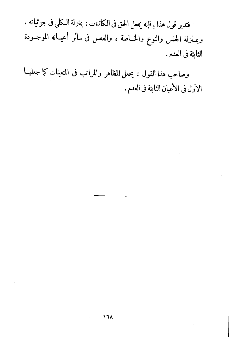فَتَدَبَّرْ قَوْلَ هَذَا؛ فَإِنَّهُ يَجْعَلُ الْحَقَّ فِي الْكَائِنَاتِ: بِمَنْزِلَةِ الْكُلِّيِّ فِي جُزْئِيَّاتِهِ وَبِمَنْزِلَةِ الْجِنْسِ وَالنَّوْعِ وَالْخَاصَّةِ وَالْفَصْلِ فِي سَائِرِ أَعْيَانِهِ الْمَوْجُودَةِ الثَّابِتَةِ فِي الْعَدَمِ. وَصَاحِبُ هَذَا الْقَوْلِ: يَجْعَلُ الْمَظَاهِرَ وَالْمَرَاتِبَ فِي الْمُتَعَيِّنَاتِ كَمَا جَعَلَهَا الْأَوَّلُ فِي الْأَعْيَانِ الثَّابِتَةِ فِي الْعَدَمِ.