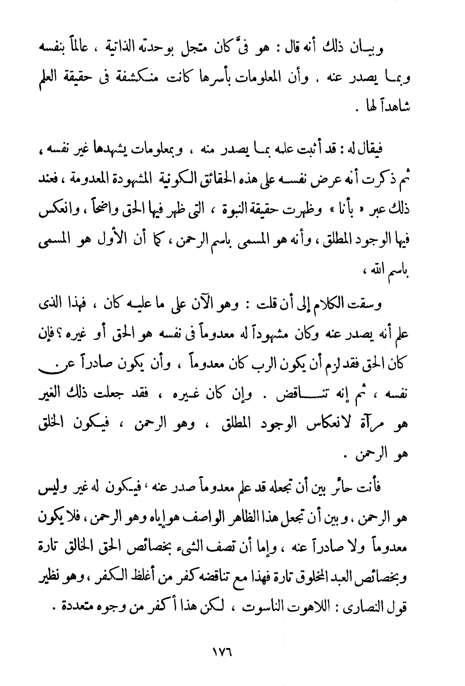 بَيَانُ ذَلِكَ أَنَّهُ قَالَ: هُوَ فِيَّ كَانَ مُتَجَلٍّ بِوَحْدَتِهِ الذَّاتِيَّةِ عَالِمًا بِنَفْسِهِ وَبِمَا يَصْدُرُ عَنْهُ وَأَنَّ الْمَعْلُومَاتِ بِأَسْرِهَا كَانَتْ مُنْكَشِفَةً فِي حَقِيقَةِ الْعِلْمِ شَاهِدًا لَهَا. فَيُقَالُ لَهُ: قَدْ أَثْبَتَ عِلْمَهُ بِمَا يَصْدُرُ مِنْهُ وَبِمَعْلُومَاتِ يَشْهَدُهَا غَيْرِ نَفْسِهِ ثُمَّ ذَكَرْت أَنَّهُ عَرَضَ نَفْسَهُ عَلَى هَذِهِ الْحَقَائِقِ الْكَوْنِيَّةِ الْمَشْهُودَةِ الْمَعْدُومَةِ فَعِنْدَ ذَلِكَ عَبَّرَ " بِأَنَا " وَظَهَرَتْ حَقِيقَةُ النُّبُوَّةِ الَّتِي ظَهَرَ فِيهَا الْحَقُّ وَاضِحًا وَانْعَكَسَ فِيهَا الْوُجُودُ الْمُطْلَقُ وَأَنَّهُ هُوَ الْمُسَمَّى بِاسْمِ الرَّحْمَنِ كَمَا أَنَّ الْأَوَّلَ هُوَ الْمُسَمَّى بِاسْمِ اللَّهِ، وَسُقْت الْكَلَامَ إلَى أَنْ قُلْت: وَهُوَ الْآنَ عَلَى مَا عَلَيْهِ كَانَ فَهَذَا الَّذِي عَلِمَ أَنَّهُ يَصْدُرُ عَنْهُ وَكَانَ مَشْهُودًا لَهُ مَعْدُومًا فِي نَفْسِهِ هُوَ الْحَقُّ أَوْ غَيْرُهُ؟ فَإِنْ كَانَ الْحَقُّ فَقَدْ لَزِمَ أَنْ يَكُونَ الرَّبُّ كَانَ مَعْدُومًا وَأَنْ يَكُونَ صَادِرًا عَنْ نَفْسِهِ ثُمَّ أَنَّهُ تَنَاقَضَ. وَإِنْ كَانَ غَيْرَهُ فَقَدْ جَعَلْت ذَلِكَ الْغَيْرَ هُوَ مِرْآةً لِانْعِكَاسِ الْوُجُودِ الْمُطْلَقِ وَهُوَ الرَّحْمَنُ فَيَكُونُ الْخَلْقُ هُوَ الرَّحْمَنُ. فَأَنْتَ حَائِرٌ بَيْنَ أَنْ تَجْعَلَهُ قَدْ عَلِمَ مَعْدُومًا صَدَرَ عَنْهُ فَيَكُونُ لَهُ غَيْرُ وَلَيْسَ هُوَ الرَّحْمَنُ وَبَيْنَ أَنْ تَجْعَلَ هَذَا الظَّاهِرَ الْوَاصِفَ هُوَ إيَّاهُ وَهُوَ الرَّحْمَنُ فَلَا يَكُونُ مَعْدُومًا وَلَا صَادِرًا عَنْهُ وَإِمَّا أَنْ تَصِفَ الشَّيْءَ بِخَصَائِصِ الْحَقِّ الْخَالِقِ تَارَةً وَبِخَصَائِصِ الْعَبْدِ الْمَخْلُوقِ تَارَةً فَهَذَا مَعَ تَنَاقُضِهِ كُفْرٌ مَنْ أَغْلَظِ الْكُفْرِ وَهُوَ نَظِيرُ قَوْلِ النَّصَارَى: اللَّاهُوتُ النَّاسُوتُ لَكِنَّ هَذَا أَكْفَرُ مِنْ وُجُوهٍ مُتَعَدِّدَةٍ.