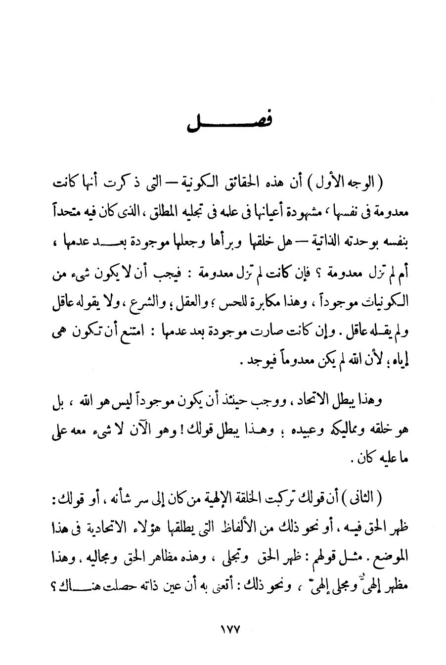 الْوَجْهُ الْأَوَّلُ: أَنَّ هَذِهِ الْحَقَائِقَ الْكَوْنِيَّةَ - الَّتِي ذَكَرْت أَنَّهَا كَانَتْ مَعْدُومَةً فِي نَفْسِهَا مَشْهُودَةً أَعْيَانُهَا فِي عِلْمِهِ فِي تَجَلِّيهِ الْمُطْلَقِ الَّذِي كَانَ فِيهِ مُتَّحِدًا بِنَفْسِهِ بِوَحْدَتِهِ الذَّاتِيَّةِ - هَلْ خَلَقَهَا وَبَرَأَهَا وَجَعَلَهَا مَوْجُودَةً بَعْدَ عَدَمِهَا أَمْ لَمْ تَزَلْ مَعْدُومَةً؟ فَإِنْ كَانَتْ لَمْ تَزَلْ مَعْدُومَةً: فَيَجِبُ أَنْ لَا يَكُونَ شَيْءٌ مِنْ الْكَوْنِيَّاتِ مَوْجُودًا وَهَذَا مُكَابَرَةٌ لِلْحِسِّ؛ وَالْعَقْلِ؛ وَالشَّرْعِ وَلَا يَقُولُهُ عَاقِلٌ وَلَمْ يَقُلْهُ عَاقِلٌ. وَإِنْ كَانَتْ صَارَتْ مَوْجُودَةً بَعْدَ عَدَمِهَا: امْتَنَعَ أَنْ تَكُونَ هِيَ إيَّاهُ؛ لِأَنَّ اللَّهَ لَمْ يَكُنْ مَعْدُومًا فَيُوجَدُ. وَهَذَا يُبْطِلُ الِاتِّحَادَ وَوَجَبَ حِينَئِذٍ أَنْ يَكُونَ مَوْجُودًا لَيْسَ هُوَ اللَّهُ بَلْ هُوَ خَلْقُهُ وَمَمَالِيكُهُ وَعَبِيدُهُ؛ وَهَذَا يُبْطِلُ قَوْلَك وَهُوَ الْآنَ لَا شَيْءَ مَعَهُ عَلَى مَا عَلَيْهِ كَانَ.