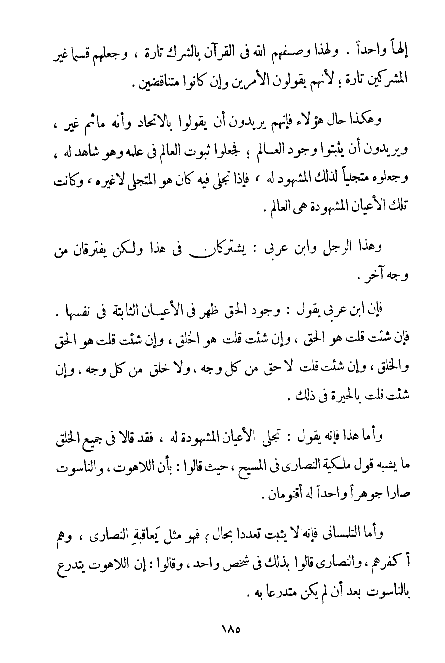 وَأَمَّا هَذَا فَإِنَّهُ يَقُولُ: تَجَلَّى الْأَعْيَانُ الْمَشْهُودَةُ لَهُ فَقَدْ قَالَا فِي جَمِيعِ الْخَلْقِ مَا يُشْبِهُ قَوْلَ مَلَكِيَّةِ النَّصَارَى فِي الْمَسِيحِ حَيْثُ قَالُوا: بِأَنَّ اللَّاهُوتَ وَالنَّاسُوتَ صَارَا جَوْهَرًا وَاحِدًا لَهُ أُقْنُومَانِ. وَأَمَّا التلمساني فَإِنَّهُ لَا يُثْبِتُ تَعَدُّدًا بِحَالِ؛ فَهُوَ مِثْلُ يَعَاقِبَةِ النَّصَارَى وَهُمْ أَكْفَرُهُمْ وَالنَّصَارَى قَالُوا بِذَلِكَ فِي شَخْصٍ وَاحِدٍ وَقَالُوا: إنَّ اللَّاهُوتَ يَتَدَرَّعُ بِالنَّاسُوتِ بَعْدَ أَنْ لَمْ يَكُنْ مُتَدَرِّعًا بِهِ.