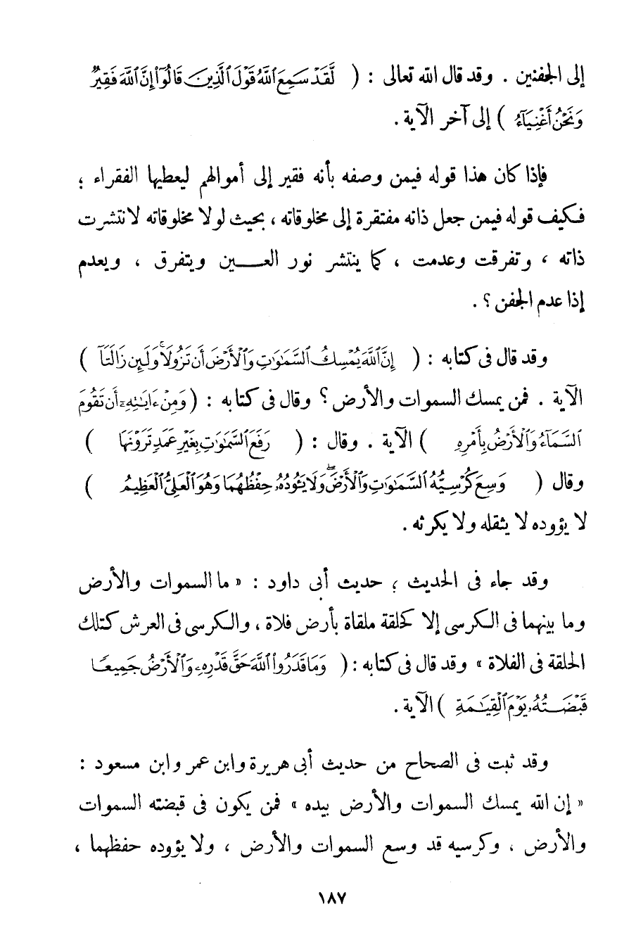 إلَى الْجَفْنَيْنِ. وَقَدْ قَالَ اللَّهُ تَعَالَى: {لَقَدْ سَمِعَ اللَّهُ قَوْلَ الَّذِينَ قَالُوا إنَّ اللَّهَ فَقِيرٌ وَنَحْنُ أَغْنِيَاءُ} إلَى آخِرِ الْآيَةِ. فَإِذَا كَانَ هَذَا قَوْلَهُ فِيمَنْ وَصَفَهُ بِأَنَّهُ فَقِيرٌ إلَى أَمْوَالِهِمْ لِيُعْطِيَهَا الْفُقَرَاءَ؛ فَكَيْفَ قَوْلُهُ فِيمَنْ جَعَلَ ذَاتَه مُفْتَقِرَةً إلَى مَخْلُوقَاتِهِ بِحَيْثُ لَوْلَا مَخْلُوقَاتُهُ لَانْتَشَرَتْ ذَاتُهُ وَتَفَرَّقَتْ وَعَدِمَتْ كَمَا يَنْتَشِرُ نُورُ الْعَيْنِ وَيَتَفَرَّقُ وَيَعْدَمُ إذَا عَدِمَ الْجَفْنُ؟ . وَقَدْ قَالَ فِي كِتَابِهِ: {إنَّ اللَّهَ يُمْسِكُ السَّمَاوَاتِ وَالْأَرْضَ أَنْ تَزُولَا وَلَئِنْ زَالَتَا} الْآيَةَ. فَمَنْ يُمْسِكُ السَّمَوَاتِ وَالْأَرْضَ؟ وَقَالَ فِي كِتَابِهِ: {وَمِنْ آيَاتِهِ أَنْ تَقُومَ السَّمَاءُ وَالْأَرْضُ بِأَمْرِهِ} الْآيَةَ. وَقَالَ: {رَفَعَ السَّمَاوَاتِ بِغَيْرِ عَمَدٍ تَرَوْنَهَا} وَقَالَ {وَسِعَ كُرْسِيُّهُ السَّمَاوَاتِ وَالْأَرْضَ وَلَا يَئُودُهُ حِفْظُهُمَا وَهُوَ الْعَلِيُّ الْعَظِيمُ} {وَلَا يَئُودُهُ} لَا يُثْقِلُهُ وَلَا يُكْرِثُهُ. وَقَدْ جَاءَ فِي الْحَدِيثِ؛ حَدِيثُ أَبِي دَاوُد: {مَا السَّمَوَاتُ وَالْأَرْضُ وَمَا بَيْنَهُمَا فِي الْكُرْسِيِّ إلَّا كَحَلْقَةِ مُلْقَاةٍ بِأَرْضِ فَلَاةٍ وَالْكُرْسِيُّ فِي الْعَرْشِ كَتِلْكَ الْحَلْقَةِ فِي الْفَلَاةِ} وَقَدْ قَالَ فِي كِتَابِهِ: {وَمَا قَدَرُوا اللَّهَ حَقَّ قَدْرِهِ وَالْأَرْضُ جَمِيعًا قَبْضَتُهُ يَوْمَ الْقِيَامَةِ} الْآيَةَ. وَقَدْ ثَبَتَ فِي الصِّحَاحِ مِنْ حَدِيثٍ أَبِي هُرَيْرَةَ وَابْنِ عُمَرَ وَابْنِ مَسْعُودٍ: {إنَّ اللَّهَ يُمْسِكُ السَّمَوَاتِ وَالْأَرْضَ بِيَدِهِ} فَمَنْ يَكُونُ فِي قَبْضَتِهِ السَّمَوَاتُ وَالْأَرْضُ وَكُرْسِيُّهُ قَدْ وَسِعَ السَّمَوَاتِ وَالْأَرْضَ وَلَا يَئُودُهُ حِفْظُهُمَا