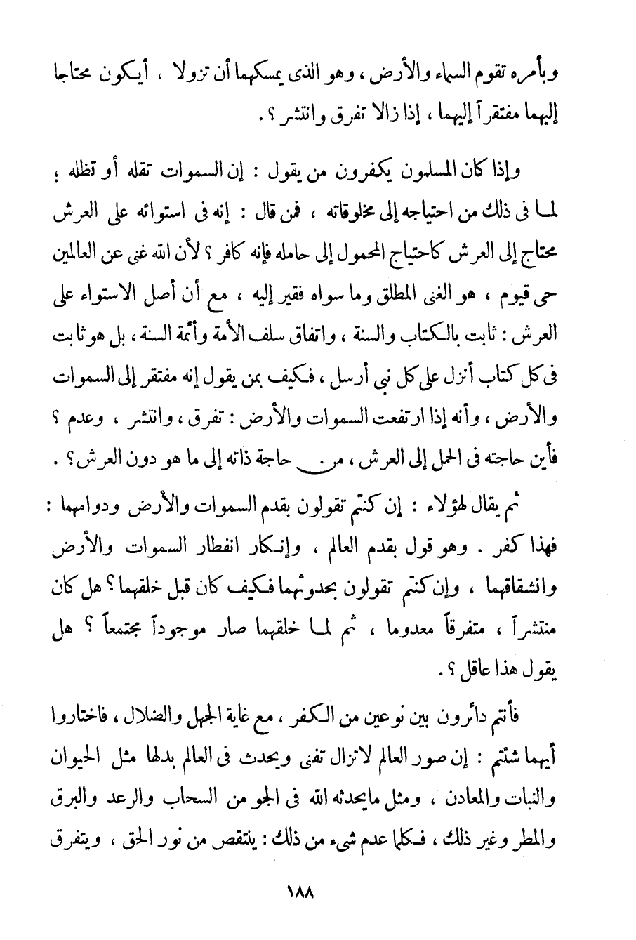 وَبِأَمْرِهِ تَقُومُ السَّمَاءُ وَالْأَرْضُ وَهُوَ الَّذِي يُمْسِكُهُمَا أَنْ تَزُولَا أَيَكُونُ مُحْتَاجًا إلَيْهِمَا مُفْتَقِرًا إلَيْهِمَا إذَا زَالَا تَفَرَّقَ وَانْتَشَرَ؟ . وَإِذَا كَانَ الْمُسْلِمُونَ يُكَفِّرُونَ مَنْ يَقُولُ: إنَّ السَّمَوَاتِ تُقِلُّهُ أَوْ تُظِلُّهُ؛ لِمَا فِي ذَلِكَ مِنْ احْتِيَاجِهِ إلَى مَخْلُوقَاتِهِ فَمَنْ قَالَ: إنَّهُ فِي اسْتِوَائِهِ عَلَى الْعَرْشِ مُحْتَاجٌ إلَى الْعَرْشِ كَاحْتِيَاجِ الْمَحْمُولِ إلَى حَامِلِهِ فَإِنَّهُ كَافِرٌ؟ لِأَنَّ اللَّهَ غَنِيٌّ عَنْ الْعَالَمِينَ حَيٌّ قَيُّومٌ هُوَ الْغَنِيُّ الْمُطْلَقُ وَمَا سِوَاهُ فَقِيرٌ إلَيْهِ مَعَ أَنَّ أَصْلَ الِاسْتِوَاءِ عَلَى الْعَرْشِ: ثَابِتٌ بِالْكِتَابِ وَالسُّنَّةِ وَاتِّفَاقِ سَلَفِ الْأُمَّةِ وَأَئِمَّةِ السُّنَّةِ بَلْ هُوَ ثَابِتٌ فِي كُلِّ كِتَابٍ أُنْزِلَ عَلَى كُلِّ نَبِيٍّ أُرْسِلَ فَكَيْفَ بِمَنْ يَقُولُ إنَّهُ مُفْتَقِرٌ إلَى السَّمَوَاتِ وَالْأَرْضِ وَأَنَّهُ إذَا ارْتَفَعَتْ السَّمَوَاتُ وَالْأَرْضُ: تَفَرَّقَ وَانْتَشَرَ وَعَدِمَ؟ فَأَيْنَ حَاجَتُهُ فِي الْحَمْلِ إلَى الْعَرْشِ مِنْ حَاجَةِ ذَاتِهِ إلَى مَا هُوَ دُونَ الْعَرْشِ؟ . ثُمَّ يُقَالُ لِهَؤُلَاءِ: إنْ كُنْتُمْ تَقُولُونَ بِقِدَمِ السَّمَوَاتِ وَالْأَرْضِ وَدَوَامِهَا: فَهَذَا كُفْرٌ. وَهُوَ قَوْلٌ بِقِدَمِ الْعَالَمِ وَإِنْكَارِ انْفِطَارِ السَّمَوَاتِ وَالْأَرْضِ وَانْشِقَاقِهِمَا وَإِنْ كُنْتُمْ تَقُولُونَ بِحُدُوثِهِمَا فَكَيْفَ كَانَ قَبْلَ خَلْقِهِمَا؟ هَلْ كَانَ مُنْتَشِرًا مُتَفَرِّقًا مَعْدُومًا ثُمَّ لَمَّا خَلَقَهُمَا صَارَ مَوْجُودًا مُجْتَمِعًا؟ هَلْ يَقُولُ هَذَا عَاقِلٌ؟ . فَأَنْتُمْ دَائِرُونَ بَيْنَ نَوْعَيْنِ مِنْ الْكُفْرِ مَعَ غَايَةِ الْجَهْلِ وَالضَّلَالِ فَاخْتَارُوا أَيَّهمَا شِئْتُمْ: إنَّ صُوَرَ الْعَالَمِ لَا تَزَالُ تَفْنَى وَيَحْدُثُ فِي الْعَالَمِ بَدَلُهَا مِثْلُ الْحَيَوَانِ وَالنَّبَاتِ وَالْمَعَادِنِ وَمِثْلُ مَا يُحْدِثُهُ اللَّهُ فِي الْجَوِّ مِنْ السَّحَابِ وَالرَّعْدِ وَالْبَرْقِ وَالْمَطَرِ وَغَيْرِ ذَلِكَ فَكُلَّمَا عُدِمَ شَيْءٌ مِنْ ذَلِكَ: يَنْتَقِصُ مِنْ نُورِ الْحَقِّ وَيَتَفَرَّقُ