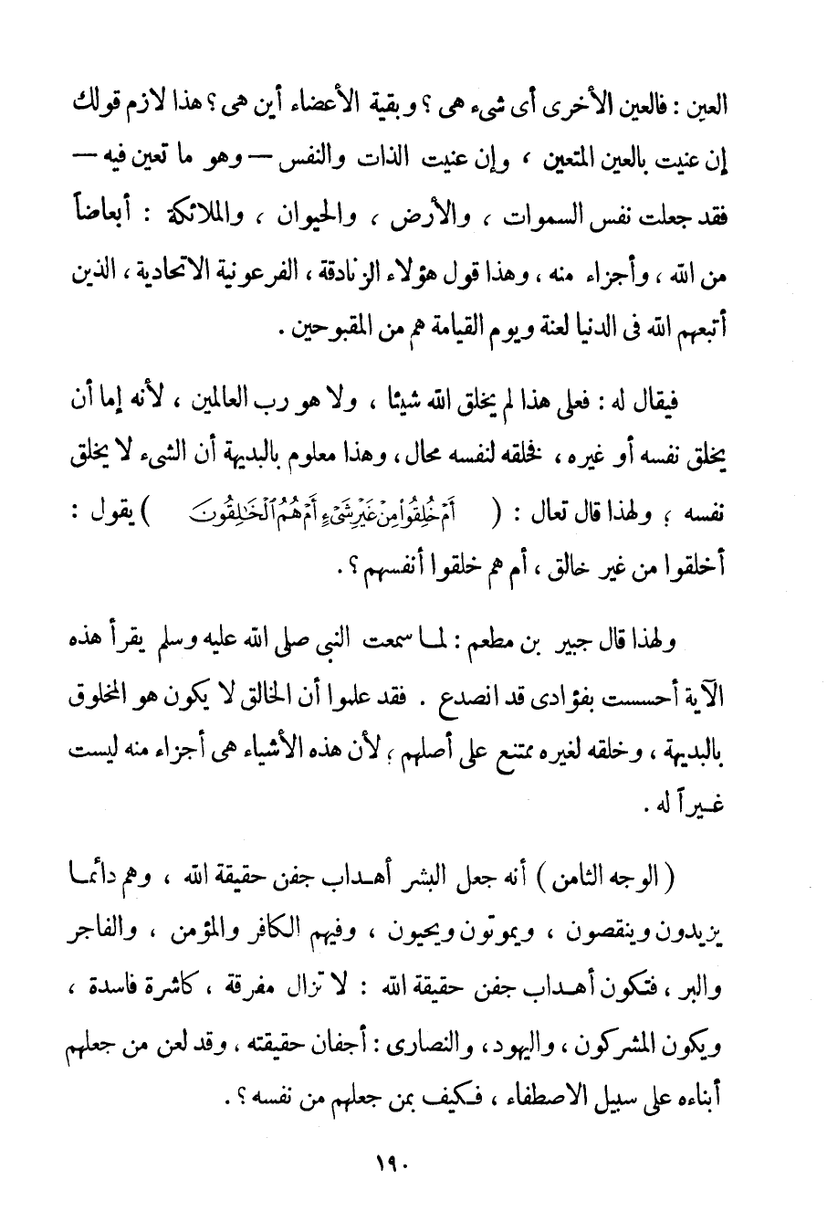 الْعَيْنُ: فَالْعَيْنُ الْأُخْرَى أَيُّ شَيْءٍ هِيَ؟ وَبَقِيَّةُ الْأَعْضَاءِ أَيْنَ هِيَ؟ هَذَا لَازِمُ قَوْلِك إنْ عَنَيْت بِالْعَيْنِ الْمُتَعَيِّنَ وَإِنْ عَنَيْت الذَّاتَ وَالنَّفْسَ - وَهُوَ مَا تَعَيَّنَ فِيهِ - فَقَدْ جَعَلْت نَفْسَ السَّمَوَاتِ وَالْأَرْضِ وَالْحَيَوَانِ وَالْمَلَائِكَةِ: أَبْعَاضًا مِنْ اللَّهِ وَأَجْزَاءً مِنْهُ وَهَذَا قَوْلُ هَؤُلَاءِ الزَّنَادِقَةِ الْفِرْعَوْنِيَّةِ الِاتِّحَادِيَّةِ الَّذِينَ أَتْبَعَهُمْ اللَّهُ فِي الدُّنْيَا لَعْنَةً وَيَوْمَ الْقِيَامَةِ هُمْ مِنْ الْمَقْبُوحِينَ. فَيُقَالُ لَهُ: فَعَلَى هَذَا لَمْ يَخْلُقْ اللَّهُ شَيْئًا وَلَا هُوَ رَبُّ الْعَالَمِينَ لِأَنَّهُ إمَّا أَنْ يَخْلُقَ نَفْسَهُ أَوْ غَيْرَهُ فَخَلْقُهُ لِنَفْسِهِ مُحَالٌ وَهَذَا مَعْلُومٌ بِالْبَدِيهَةِ أَنَّ الشَّيْءَ لَا يَخْلُقُ نَفْسَهُ؛ وَلِهَذَا قَالَ تَعَالَى: {أَمْ خُلِقُوا مِنْ غَيْرِ شَيْءٍ أَمْ هُمُ الْخَالِقُونَ} ؟ يَقُولُ: أَخُلِقُوا مِنْ غَيْرِ خَالِقٍ أَمْ هُمْ خَلَقُوا أَنْفُسَهُمْ؟ . وَلِهَذَا قَالَ جُبَيْرُ بْنُ مُطْعِمٍ: لَمَّا سَمِعْت النَّبِيَّ صَلَّى اللَّهُ عَلَيْهِ وَسَلَّمَ يَقْرَأُ هَذِهِ الْآيَةَ أَحْسَسْت بِفُؤَادِي قَدْ انْصَدَعَ. فَقَدْ عَلِمُوا أَنَّ الْخَالِقَ لَا يَكُونُ هُوَ الْمَخْلُوقَ بِالْبَدِيهَةِ وَخَلْقُهُ لِغَيْرِهِ مُمْتَنِعٌ عَلَى أَصْلِهِمْ؛ لِأَنَّ هَذِهِ الْأَشْيَاءَ أَجْزَاءٌ مِنْهُ لَيْسَتْ غَيْرًا لَهُ. (الْوَجْهُ) الثَّامِنُ أَنَّهُ جَعَلَ الْبَشَرَ أَهْدَابَ جَفْنِ حَقِيقَةِ اللَّهِ وَهُمْ دَائِمًا يَزِيدُونَ وَيَنْقُصُونَ وَيَمُوتُونَ وَيَحْيَوْنَ وَفِيهِمْ الْكَافِرُ وَالْمُؤْمِنُ وَالْفَاجِرُ وَالْبَرُّ فَتَكُونُ أَهْدَابُ جَفْنِ حَقِيقَةِ اللَّهِ: لَا تَزَالُ مُفَرَّقَةً كَاشِرَةً فَاسِدَةً وَيَكُونُ الْمُشْرِكُونَ وَالْيَهُودُ وَالنَّصَارَى: أَجْفَانُ حَقِيقَتِهِ وَقَدْ لَعَنَ مَنْ جَعَلَهُمْ أَبْنَاءَهُ عَلَى سَبِيلِ الِاصْطِفَاءِ فَكَيْفَ بِمَنْ جَعَلَهُمْ مِنْ نَفْسِهِ؟ .