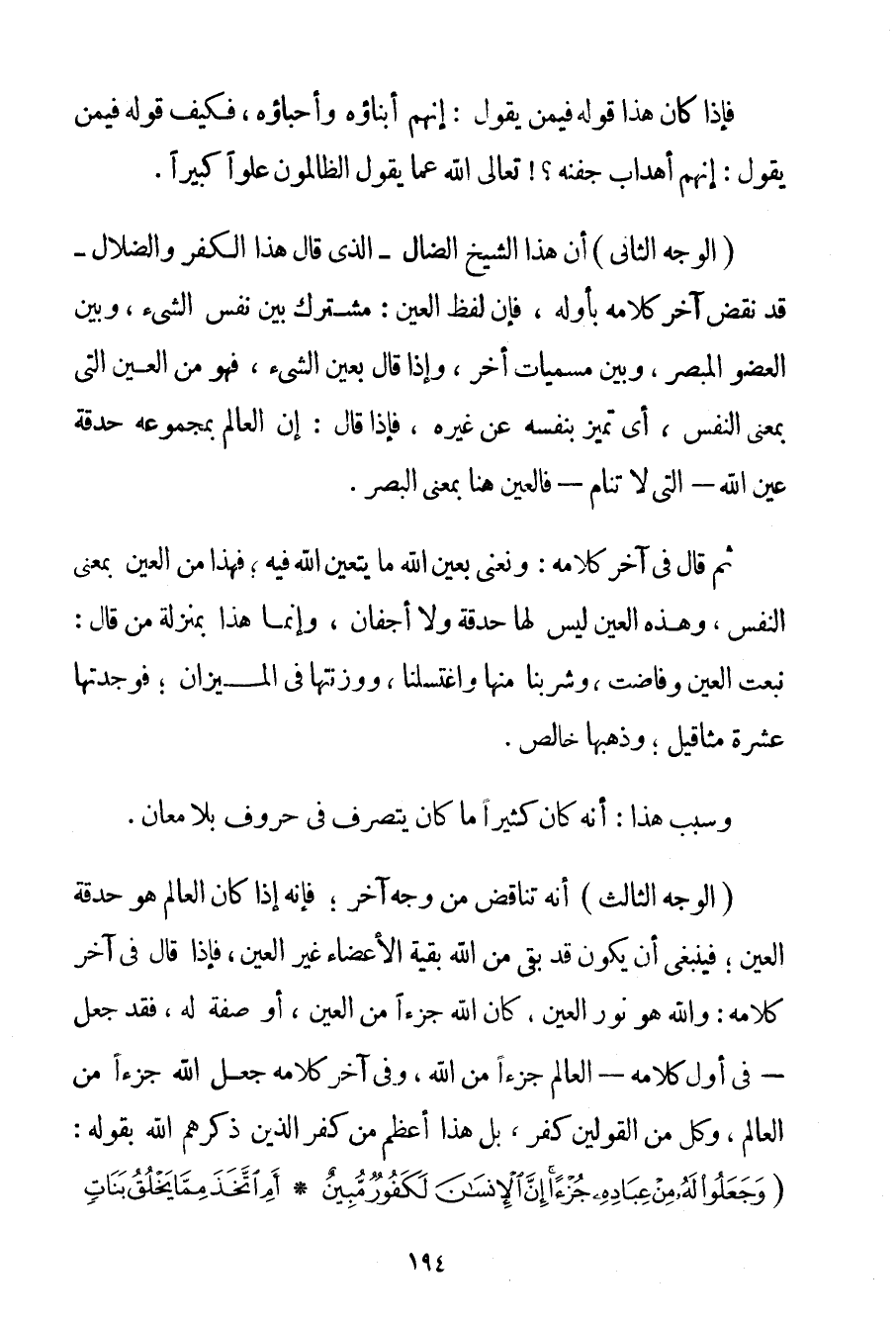الْوَجْهُ الثَّانِي: أَنَّ هَذَا الشَّيْخَ الضَّالَّ - الَّذِي قَالَ هَذَا الْكُفْرَ وَالضَّلَالَ - قَدْ نَقَضَ آخِرَ كَلَامِهِ بِأَوَّلِهِ فَإِنَّ لَفْظَ الْعَيْنِ: مُشْتَرِكٌ بَيْنَ نَفْسِ الشَّيْءِ وَبَيْنَ الْعُضْوِ الْمُبْصِرِ وَبَيْنَ مُسَمَّيَاتٍ أُخَرَ وَإِذَا قَالَ بِعَيْنِ الشَّيْءِ فَهُوَ مِنْ الْعَيْنِ الَّتِي بِمَعْنَى النَّفْسِ أَيْ تَمَيَّزَ بِنَفْسِهِ عَنْ غَيْرِهِ فَإِذَا قَالَ: إنَّ الْعَالَمَ بِمَجْمُوعِهِ حَدَقَةُ عَيْنِ اللَّهِ - الَّتِي لَا تَنَامُ - فَالْعَيْنُ هُنَا بِمَعْنَى الْبَصَرِ. ثُمَّ قَالَ فِي آخِرِ كَلَامِهِ: وَنَعْنِي بِعَيْنِ اللَّهِ مَا يَتَعَيَّنُ اللَّهُ فِيهِ؛ فَهَذَا مِنْ الْعَيْنِ بِمَعْنَى النَّفْسِ وَهَذِهِ الْعَيْنُ لَيْسَ لَهَا حَدَقَةٌ وَلَا أَجْفَانٌ وَإِنَّمَا هَذَا بِمَنْزِلَةِ مَنْ قَالَ: نَبَعَتْ الْعَيْنُ وَفَاضَتْ وَشَرِبْنَا مِنْهَا وَاغْتَسَلْنَا وَوَزَنْتهَا فِي الْمِيزَانِ؛ فَوَجَدْتهَا عَشَرَةَ مَثَاقِيلَ؛ وَذَهَبُهَا خَالِصٌ. وَسَبَبُ هَذَا: أَنَّهُ كَانَ كَثِيرًا مَا كَانَ يَتَصَرَّفُ فِي حُرُوفٍ بِلَا مَعَانٍ.