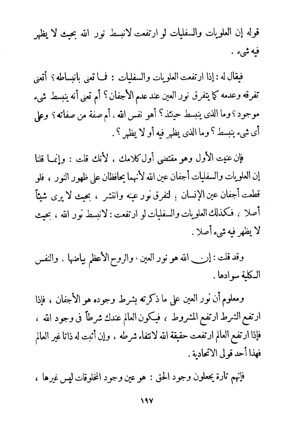 قَوْلِهِ إنَّ الْعُلْوِيَّاتِ وَالسُّفْلَيَاتِ لَوْ ارْتَفَعَتْ لَانْبَسَطَ نُورُ اللَّهِ بِحَيْثُ لَا يَظْهَرُ فِيهِ شَيْءٌ. فَيُقَالُ لَهُ: إذَا ارْتَفَعَتْ الْعُلْوِيَّاتُ وَالسُّفْلَيَاتُ: فَمَا تَعْنِي بِانْبِسَاطِهِ؟ أَتَعْنِي تَفَرُّقَهُ وَعَدَمَهُ كَمَا يَتَفَرَّقُ نُورُ الْعَيْنِ عِنْدَ عَدَمِ الْأَجْفَانِ؟ أَمْ تَعْنِي أَنَّهُ يَنْبَسِطُ شَيْءٌ مَوْجُودٌ؟ وَمَا الَّذِي يَنْبَسِطُ حِينَئِذٍ؟ أَهُوَ نَفْسُ اللَّهِ أَمْ صِفَةٌ مِنْ صِفَاتِهِ؟ وَعَلَى أَيِّ شَيْءٍ يَنْبَسِطُ؟ وَمَا الَّذِي يَظْهَرُ فِيهِ أَوْ لَا يَظْهَرُ؟ . فَإِنْ عَنَيْت الْأَوَّلَ وَهُوَ مُقْتَضَى أَوَّلِ كَلَامِك لِأَنَّك قُلْت: وَإِنَّمَا قُلْنَا إنَّ الْعُلْوِيَّاتِ وَالسُّفْلَيَاتِ أَجْفَانُ عَيْنِ اللَّهِ لِأَنَّهُمَا يُحَافِظَانِ عَلَى ظُهُورِ النُّورِ فَلَوْ قُطِعَتْ أَجْفَانُ عَيْنِ الْإِنْسَانِ؛ لَتَفَرَّقَ نُورُ عَيْنِهِ وَانْتَشَرَ بِحَيْثُ لَا يَرَى شَيْئًا أَصْلًا فَكَذَلِكَ الْعُلْوِيَّاتُ وَالسُّفْلَيَاتُ لَوْ ارْتَفَعَتْ: لَانْبَسَطَ نُورُ اللَّهِ بِحَيْثُ لَا يَظْهَرُ فِيهِ شَيْءٌ أَصْلًا. وَقَدْ قُلْت: إنَّ اللَّهَ هُوَ نُورُ الْعَيْنِ وَالرُّوحُ الْأَعْظَمُ بَيَاضُهَا وَالنَّفْسُ الْكُلِّيَّةُ سَوَادُهَا. وَمَعْلُومٌ أَنَّ نُورَ الْعَيْنِ عَلَى مَا ذَكَرْته بِشَرْطِ وُجُودِهِ هُوَ الْأَجْفَانُ فَإِذَا ارْتَفَعَ الشَّرْطُ ارْتَفَعَ الْمَشْرُوطُ فَيَكُونُ الْعَالَمُ عِنْدَك شَرْطًا فِي وُجُودِ اللَّهِ فَإِذَا ارْتَفَعَ الْعَالَمُ ارْتَفَعَتْ حَقِيقَةُ اللَّهِ لِانْتِفَاءِ شَرْطِهِ وَإِنْ أَثْبَتَ لَهُ ذَاتًا غَيْرَ الْعَالَمِ فَهَذَا أَحَدُ قَوْلَيْ الِاتِّحَادِيَّةِ. فَإِنَّهُمْ تَارَةً يَجْعَلُونَ وُجُودَ الْحَقِّ: هُوَ عَيْنُ وُجُودِ الْمَخْلُوقَاتِ لَيْسَ غَيْرَهَا
