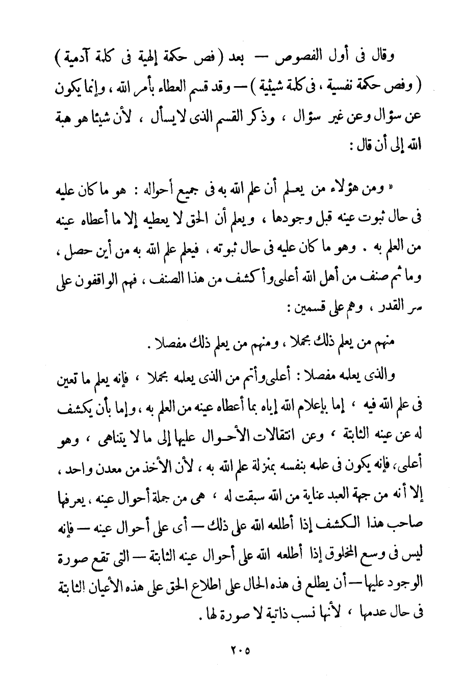 وَقَالَ فِي أَوَّلِ الْفُصُوصِ - بَعْدَ فَصٌّ حِكْمَةٌ إلَهِيَّةٌ فِي كَلِمَةٍ آدَمِيَّةٍ (وَفَصٌّ حِكْمَةٌ نَفْسِيَّةٌ فِي كَلِمَةٍ شيثية - وَقَدْ قَسَّمَ الْعَطَاءَ بِأَمْرِ اللَّهِ وَإِنَّمَا يَكُونُ عَنْ سُؤَالٍ وَعَنْ غَيْرِ سُؤَالٍ وَذَكَرَ الْقِسْمَ الَّذِي لَا يُسْأَلُ لِأَنَّ شَيْئًا هُوَ هِبَةُ اللَّهِ إلَى أَنْ قَالَ: " وَمِنْ هَؤُلَاءِ مَنّ يَعْلَمُ أَنَّ عِلْمَ اللَّهِ بِهِ فِي جَمِيعِ أَحْوَالِهِ: هُوَ مَا كَانَ عَلَيْهِ فِي حَالِ ثُبُوتِ عَيْنِهِ قَبْلَ وُجُودِهَا وَيَعْلَمُ أَنَّ الْحَقَّ لَا يُعْطِيهِ إلَّا مَا أَعْطَاهُ عَيْنَهُ مِنْ الْعِلْمِ بِهِ. وَهُوَ مَا كَانَ عَلَيْهِ فِي حَالِ ثُبُوتُهُ فَيَعْلَمُ عِلْمَ اللَّهِ بِهِ مِنْ أَيْنَ حَصَلَ وَمَا ثَمَّ صِنْفٌ مِنْ أَهْلِ اللَّهِ أَعْلَى وَأَكْشَفُ مِنْ هَذَا الصِّنْفِ فَهُمْ الْوَاقِفُونَ عَلَى سِرِّ الْقَدَرِ وَهُمْ عَلَى قِسْمَيْنِ: مِنْهُمْ مَنْ يَعْلَمُ ذَلِكَ مُجْمَلًا وَمِنْهُمْ مَنْ يَعْلَمُ ذَلِكَ مُفَصَّلًا. وَاَلَّذِي يَعْلَمُهُ مُفَصَّلًا: أَعْلَى وَأَتَمُّ مِنْ الَّذِي يَعْلَمُهُ مُجْمَلًا فَإِنَّهُ يَعْلَمُ مَا تَعَيَّنَ فِي عِلْمِ اللَّهِ فِيهِ إمَّا بِإِعْلَامِ اللَّهِ إيَّاهُ بِمَا أَعْطَاهُ عَيْنَهُ مِنْ الْعِلْمِ بِهِ وَإِمَّا بِأَنْ يَكْشِفَ لَهُ عَنْ عَيْنِهِ الثَّابِتَةِ وَعَنْ انْتِقَالَاتِ الْأَحْوَالِ عَلَيْهَا إلَى مَا لَا يَتَنَاهَى وَهُوَ أَعْلَى فَإِنَّهُ يَكُونُ فِي عِلْمِهِ بِنَفْسِهِ بِمَنْزِلَةِ عِلْمِ اللَّهِ بِهِ لِأَنَّ الْأَخْذَ مِنْ مَعْدِنٍ وَاحِدٍ إلَّا أَنَّهُ مِنْ جِهَةِ الْعَبْدِ عِنَايَةٌ مِنْ اللَّهِ سَبَقَتْ لَهُ هِيَ مِنْ جُمْلَةِ أَحْوَالِ عَيْنِهِ يَعْرِفُهَا صَاحِبُ هَذَا الْكَشْفِ إذَا أَطْلَعَهُ اللَّهُ عَلَى ذَلِكَ - أَيْ عَلَى أَحْوَالِ عَيْنِهِ - فَإِنَّهُ لَيْسَ فِي وُسْعِ الْمَخْلُوقِ إذَا أَطْلَعَهُ اللَّهُ عَلَى أَحْوَالِ عَيْنِهِ الثَّابِتَةِ - الَّتِي تَقَعُ صُورَةُ الْوُجُودِ عَلَيْهَا - أَنْ يَطَّلِعَ فِي هَذِهِ الْحَالِ عَلَى اطِّلَاعِ الْحَقِّ عَلَى هَذِهِ الْأَعْيَانِ الثَّابِتَةِ فِي حَالِ عَدَمِهَا لِأَنَّهَا نِسَبٌ ذَاتِيَّةٌ لَا صُورَةَ لَهَا.