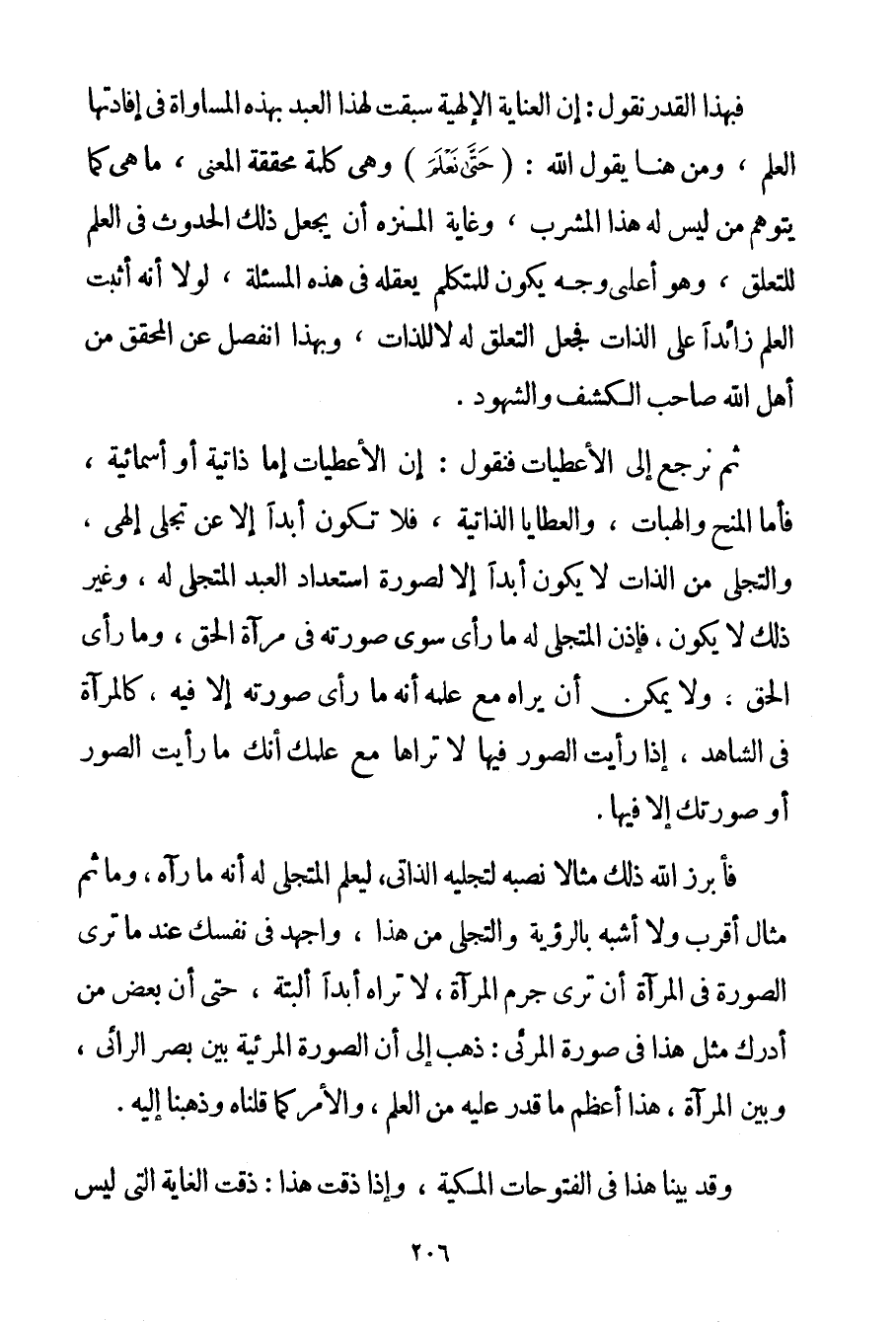 فَبِهَذَا الْقَدْرِ نَقُولُ: إنَّ الْعِنَايَةَ الْإِلَهِيَّةَ سَبَقَتْ لِهَذَا الْعَبْدِ بِهَذِهِ الْمُسَاوَاةِ فِي إفَادَتِهَا الْعِلْمَ وَمِنْ هُنَا يَقُولُ اللَّهُ: {حَتَّى نَعْلَمَ} وَهِيَ كَلِمَةٌ مُحَقِّقَةُ الْمَعْنَى مَا هِيَ كَمَا يَتَوَهَّمُ مَنْ لَيْسَ لَهُ هَذَا الْمَشْرَبُ وَغَايَةُ الْمُنَزِّهِ أَنْ يَجْعَلَ ذَلِكَ الْحُدُوثَ فِي الْعِلْمِ لِلتَّعَلُّقِ وَهُوَ أَعْلَى وَجْهٍ يَكُونُ لِلْمُتَكَلِّمِ يَعْقِلُهُ فِي هَذِهِ الْمَسْأَلَةِ لَوْلَا أَنَّهُ أَثْبَتَ الْعِلْمَ زَائِدًا عَلَى الذَّاتِ فَجَعَلَ التَّعَلُّقَ لَهُ لَا لِلذَّاتِ وَبِهَذَا انْفَصَلَ عَنْ الْمُحَقِّقِ مِنْ أَهْلِ اللَّهِ صَاحِبِ الْكَشْفِ وَالشُّهُودِ. ثُمَّ نَرْجِعُ إلَى الْأُعْطِيَّاتِ فَنَقُولُ: إنْ الْأُعْطِيَّاتِ إمَّا ذَاتِيَّةٌ أَوْ أسمائية فَأَمَّا الْمِنَحُ وَالْهِبَاتُ وَالْعَطَايَا الذَّاتِيَّةُ فَلَا تَكُونُ أَبَدًا إلَّا عَنْ تَجَلٍّ إلَهِيٍّ وَالتَّجَلِّي مِنْ الذَّاتِ لَا يَكُونُ أَبَدًا إلَّا لِصُورَةِ اسْتِعْدَادِ الْعَبْدِ الْمُتَجَلَّى لَهُ وَغَيْرُ ذَلِكَ لَا يَكُونُ فَإِذَنْ الْمُتَجَلَّى لَهُ مَا رَأَى سِوَى صُورَتِهِ فِي مِرْآةِ الْحَقِّ وَمَا رَأَى الْحَقَّ وَلَا يُمْكِنُ أَنْ يَرَاهُ مَعَ عِلْمِهِ أَنَّهُ مَا رَأَى صُورَتَهُ إلَّا فِيهِ كَالْمِرْآةِ فِي الشَّاهِدِ إذَا رَأَيْت الصُّوَرَ فِيهَا لَا تَرَاهَا مَعَ عِلْمِك أَنَّك مَا رَأَيْت الصُّوَرَ أَوْ صُورَتَك إلَّا فِيهَا. فَأَبْرَزَ اللَّهُ ذَلِكَ مِثَالًا نَصَبَهُ لِتَجَلِّيهِ الذَّاتِيِّ لِيَعْلَمَ الْمُتَجَلَّى لَهُ أَنَّهُ مَا رَآهُ وَمَا ثَمَّ مِثَالٌ أَقْرَبُ وَلَا أَشْبَهُ بِالرُّؤْيَةِ وَالتَّجَلِّي مِنْ هَذَا وَأَجْهِدْ فِي نَفْسِك عِنْدَ مَا تَرَى الصُّورَةَ فِي الْمِرْآةِ أَنْ تَرَى جِرْمَ الْمِرْآةِ لَا تَرَاهُ أَبَدًا أَلْبَتَّةَ حَتَّى أَنَّ بَعْضَ مَنْ أَدْرَكَ مِثْلَ هَذَا فِي صُورَةِ الْمَرْئِيِّ: ذَهَبَ إلَى أَنَّ الصُّورَةَ الْمَرْئِيَّةَ بَيْنَ بَصَرِ الرَّائِي وَبَيْنَ الْمِرْآةِ هَذَا أَعْظَمُ مَا قَدَرَ عَلَيْهِ مِنْ الْعِلْمِ وَالْأَمْرِ كَمَا قُلْنَاهُ وَذَهَبْنَا إلَيْهِ. وَقَدْ بَيَّنَّا هَذَا فِي الْفُتُوحَاتِ الْمَكِّيَّةِ وَإِذَا ذُقْت هَذَا: ذُقْت الْغَايَةَ الَّتِي لَيْسَ