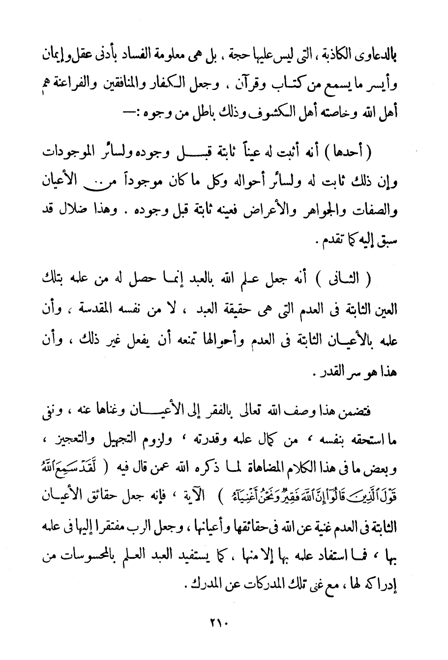 الثَّانِي: أَنَّهُ جَعَلَ عِلْمَ اللَّهِ بِالْعَبْدِ إنَّمَا حَصَلَ لَهُ مِنْ عِلْمِهِ بِتِلْكَ الْعَيْنِ الثَّابِتَةِ فِي الْعَدَمِ الَّتِي هِيَ حَقِيقَةُ الْعَبْدِ لَا مِنْ نَفْسِهِ الْمُقَدَّسَةِ وَأَنَّ عِلْمَهُ بِالْأَعْيَانِ الثَّابِتَةِ فِي الْعَدَمِ وَأَحْوَالِهَا تَمْنَعُهُ أَنْ يَفْعَلَ غَيْرَ ذَلِكَ وَأَنَّ هَذَا هُوَ سِرُّ الْقَدَرِ. فَتَضَمَّنَ هَذَا وَصْفَ اللَّهِ تَعَالَى بِالْفَقْرِ إلَى الْأَعْيَانِ وَغِنَاهَا عَنْهُ وَنَفْيَ مَا اسْتَحَقَّهُ بِنَفْسِهِ مِنْ كَمَالِ عِلْمِهِ وَقُدْرَتِهِ وَلُزُومِ التَّجْهِيلِ وَالتَّعْجِيزِ وَبَعْضِ مَا فِي هَذَا الْكَلَامِ الْمُضَاهَاةُ لِمَا ذَكَرَهُ اللَّهُ عَمَّنْ قَالَ فِيهِ {لَقَدْ سَمِعَ اللَّهُ قَوْلَ الَّذِينَ قَالُوا إنَّ اللَّهَ فَقِيرٌ وَنَحْنُ أَغْنِيَاءُ} الْآيَةَ فَإِنَّهُ جَعَلَ حَقَائِقَ الْأَعْيَانِ الثَّابِتَةِ فِي الْعَدَمِ غَنِيَّةً عَنْ اللَّهِ فِي حَقَائِقِهَا وَأَعْيَانِهَا وَجَعَلَ الرَّبَّ مُفْتَقِرًا إلَيْهَا فِي عِلْمِهِ بِهَا فَمَا اسْتَفَادَ عِلْمَهُ بِهَا إلَّا مِنْهَا يَسْتَفِيدُ الْعَبْدُ الْعِلْمَ بِالْمَحْسُوسَاتِ مِنْ إدْرَاكِهِ لَهَا مَعَ غِنَى تِلْكَ الْمُدْرَكَاتِ عَنْ الْمُدْرِكِ.