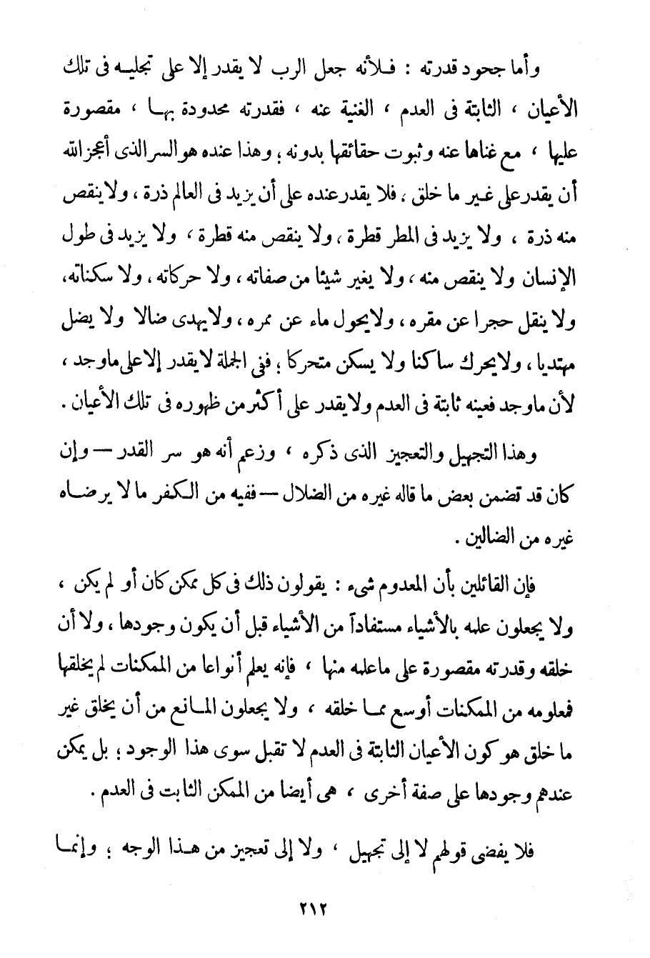 وَأَمَّا جُحُودُ قُدْرَتِهِ: فَلِأَنَّهُ جَعَلَ الرَّبَّ لَا يَقْدِرُ إلَّا عَلَى تَجَلِّيهِ فِي تِلْكَ الْأَعْيَانِ الثَّابِتَةِ فِي الْعَدَمِ الْغَنِيَّةِ عَنْهُ فَقُدْرَتُهُ مَحْدُودَةٌ بِهَا مَقْصُورَةٌ عَلَيْهَا مَعَ غِنَاهَا عَنْهُ وَثُبُوتُ حَقَائِقِهَا بِدُونِهِ؛ وَهَذَا عِنْدَهُ هُوَ السِّرُّ الَّذِي أَعْجَزَ اللَّهَ أَنْ يَقْدِرَ عَلَى غَيْرِ مَا خَلَقَ فَلَا يَقْدِرُ عِنْدَهُ عَلَى أَنْ يَزِيدَ فِي الْعَالَمِ ذَرَّةً وَلَا يُنْقِصُ مِنْهُ ذَرَّةً وَلَا يَزِيدُ فِي الْمَطَرِ قَطْرَةً وَلَا يُنْقِصُ مِنْهُ قَطْرَةً وَلَا يَزِيدُ فِي طُولِ الْإِنْسَانِ وَلَا يُنْقِصُ مِنْهُ وَلَا يُغَيِّرُ شَيْئًا مِنْ صِفَاتِهِ وَلَا حَرَكَاتِهِ وَلَا سَكَنَاتِهِ وَلَا يَنْقُلُ حَجَرًا عَنْ مَقَرِّهِ وَلَا يُحَوِّلُ مَاءً عَنْ مَمَرِّهِ وَلَا يَهْدِي ضَالًّا وَلَا يُضِلُّ مُهْتَدِيًا وَلَا يُحَرِّكُ سَاكِنًا وَلَا يُسَكِّنُ مُتَحَرِّكًا؛ فَفِي الْجُمْلَةِ لَا يَقْدِرُ إلَّا عَلَى مَا وُجِدَ لِأَنَّ مَا وُجِدَ فَعَيْنُهُ ثَابِتَةٌ فِي الْعَدَمِ وَلَا يَقْدِرُ عَلَى أَكْثَرَ مِنْ ظُهُورِهِ فِي تِلْكَ الْأَعْيَانِ. وَهَذَا التَّجْهِيلُ وَالتَّعْجِيزُ الَّذِي ذَكَرَهُ وَزَعَمَ أَنَّهُ هُوَ سِرُّ الْقَدَرِ - وَإِنْ كَانَ قَدْ تَضَمَّنَ بَعْضَ مَا قَالَهُ غَيْرُهُ مِنْ الضُّلَّالِ - فَفِيهِ مِنْ الْكُفْرِ مَا لَا يَرْضَاهُ غَيْرُهُ مِنْ الضَّالِّينَ. فَإِنَّ الْقَائِلِينَ بِأَنَّ الْمَعْدُومَ شَيْءٌ: يَقُولُونَ ذَلِكَ فِي كُلِّ مُمْكِنٍ كَانَ أَوْ لَمْ يَكُنْ وَلَا يَجْعَلُونَ عِلْمَهُ بِالْأَشْيَاءِ مُسْتَفَادًا مِنْ الْأَشْيَاءِ قَبْلَ أَنْ يَكُونَ وُجُودُهَا وَلَا أَنَّ خَلْقَهُ وَقُدْرَتَهُ مَقْصُورَةٌ عَلَى مَا عَلِمَهُ مِنْهَا فَإِنَّهُ يَعْلَمُ أَنْوَاعًا مِنْ الْمُمْكِنَاتِ لَمْ يَخْلُقْهَا فَمَعْلُومُهُ مِنْ الْمُمْكِنَاتِ أَوْسَعُ مِمَّا خَلَقَهُ وَلَا يَجْعَلُونَ الْمَانِعَ مِنْ أَنْ يَخْلُقَ غَيْرَ مَا خَلَقَ هُوَ كَوْنُ الْأَعْيَانِ الثَّابِتَةِ فِي الْعَدَمِ لَا تَقْبَلُ سِوَى هَذَا الْوُجُودِ؛ بَلْ يُمْكِنُ عِنْدَهُمْ وُجُودُهَا عَلَى صِفَةٍ أُخْرَى هِيَ أَيْضًا مِنْ الْمُمْكِنِ الثَّابِتِ فِي الْعَدَمِ. فَلَا يُفْضِي قَوْلُهُمْ لَا إلَى تَجْهِيلٍ وَلَا إلَى تَعْجِيزٍ مِنْ هَذَا الْوَجْهِ؛ وَإِنَّمَا قَدْ يَقُولُونَ