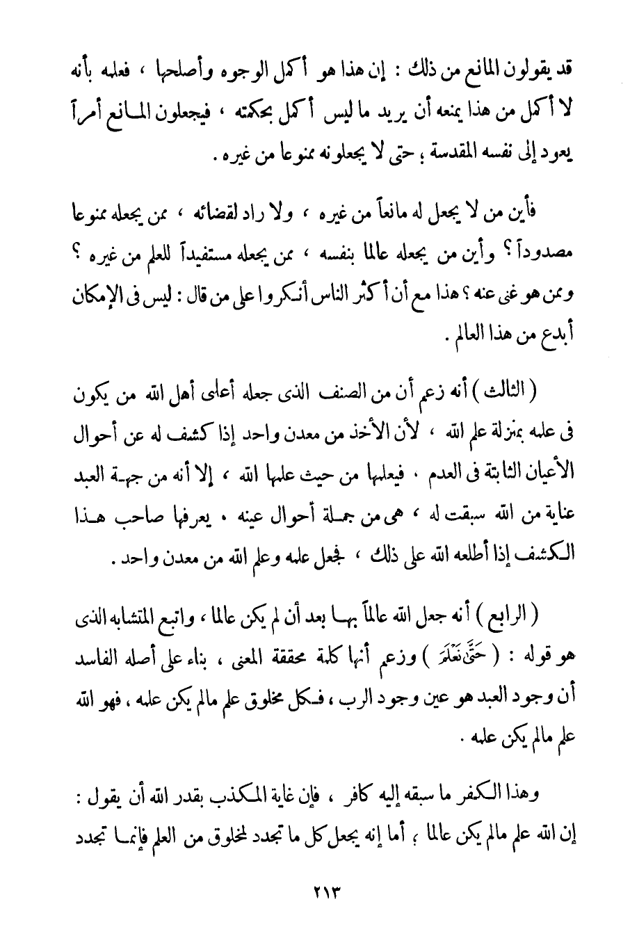 الْمَانِعُ مِنْ ذَلِكَ: أَنَّ هَذَا هُوَ أَكْمَلُ الْوُجُوهِ وَأَصْلَحُهَا فَعِلْمُهُ بِأَنَّهُ لَا أَكْمَلَ مِنْ هَذَا يَمْنَعُهُ أَنْ يُرِيدَ مَا لَيْسَ أَكْمَلَ بِحِكْمَتِهِ فَيَجْعَلُونَ الْمَانِعَ أَمْرًا يَعُودُ إلَى نَفْسِهِ الْمُقَدَّسَةِ؛ حَتَّى لَا يَجْعَلُونَهُ مَمْنُوعًا مِنْ غَيْرِهِ. فَأَيْنَ مَنْ لَا يَجْعَلُ لَهُ مَانِعًا مَنْ غَيْرِهِ وَلَا رَادَّ لِقَضَائِهِ مِمَّنْ يَجْعَلُهُ مَمْنُوعًا مَصْدُودًا؟ وَأَيْنَ مَنْ يَجْعَلُهُ عَالِمًا بِنَفْسِهِ مِمَّنْ يَجْعَلُهُ مُسْتَفِيدًا لِلْعِلْمِ مَنْ غَيْرِهِ؟ وَمِمَّنْ هُوَ غَنِيٌّ عَنْهُ؟ هَذَا مَعَ أَنَّ أَكْثَرَ النَّاسِ أَنْكَرُوا عَلَى مَنْ قَالَ: لَيْسَ فِي الْإِمْكَانِ أَبْدَعَ مِنْ هَذَا الْعَالَمِ.