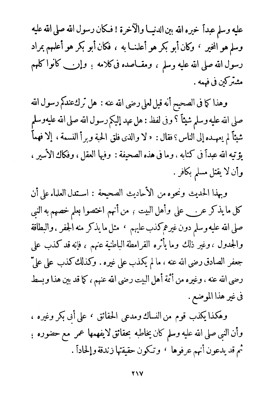 صَلَّى اللَّهُ عَلَيْهِ وَسَلَّمَ عَبْدًا خَيَّرَهُ اللَّهُ بَيْنَ الدُّنْيَا وَالْآخِرَةِ فَكَانَ رَسُولُ اللَّهِ صَلَّى اللَّهُ عَلَيْهِ وَسَلَّمَ هُوَ الْمُخَيَّرُ وَكَانَ أَبُو بَكْرٍ هُوَ أَعْلَمُنَا بِهِ فَكَانَ أَبُو بَكْرٍ هُوَ أَعْلَمُهُمْ بِمُرَادِ رَسُولِ اللَّهِ صَلَّى اللَّهُ عَلَيْهِ وَسَلَّمَ وَمَقَاصِدِهِ فِي كَلَامِهِ؛ وَإِنْ كَانُوا كُلُّهُمْ مُشْتَرِكِينَ فِي فَهْمِهِ. وَهَذَا كَمَا فِي الصَّحِيحِ أَنَّهُ {قِيلَ لِعَلِيِّ رَضِيَ اللَّهُ عَنْهُ هَلْ تَرَكَ عِنْدَكُمْ رَسُولُ اللَّهِ صَلَّى اللَّهُ عَلَيْهِ وَسَلَّمَ شَيْئًا؟ وَفِي لَفْظٍ: هَلْ عَهِدَ إلَيْكُمْ رَسُولُ اللَّهِ صَلَّى اللَّهُ عَلَيْهِ وَسَلَّمَ شَيْئًا لِمَا يَعْهَدُهُ إلَى النَّاسِ؟ فَقَالَ: لَا وَاَلَّذِي فَلَقَ الْحَبَّةَ وَبَرَأَ النَّسَمَةَ إلَّا فَهْمًا يُؤْتِيهِ اللَّهُ عَبْدًا فِي كِتَابِهِ وَمَا فِي هَذِهِ الصَّحِيفَةِ: وَفِيهَا الْعَقْلُ وَفِكَاكُ الْأَسِيرِ وَأَنْ لَا يُقْتَلَ مُسْلِمٌ بِكَافِرِ} . وَبِهَذَا الْحَدِيثِ وَنَحْوِهِ مِنْ الْأَحَادِيثِ الصَّحِيحَةِ: اسْتَدَلَّ الْعُلَمَاءُ عَلَى أَنَّ كُلَّ مَا يُذْكَرُ عَنْ عَلِيٍّ وَأَهْلِ الْبَيْتِ؛ مِنْ أَنَّهُمْ اُخْتُصُّوا بِعِلْمِ خَصَّهُمْ بِهِ النَّبِيُّ صَلَّى اللَّهُ عَلَيْهِ وَسَلَّمَ دُونَ غَيْرِهِمْ كَذِبٌ عَلَيْهِمْ مِثْلُ مَا يُذْكَرُ مِنْهُ الْجَفْرُ وَالْبِطَاقَةُ وَالْجَدْوَلُ وَغَيْرُ ذَلِكَ وَمَا يَأْثُرُهُ الْقَرَامِطَةُ الْبَاطِنِيَّةُ عَنْهُمْ فَإِنَّهُ قَدْ كُذِبَ عَلَى جَعْفَرٍ الصَّادِقِ رَضِيَ اللَّهُ عَنْهُ مَا لَمْ يُكْذَبْ عَلَى غَيْرِهِ. وَكَذَلِكَ كُذِبَ عَلَى عَلِيٍّ رَضِيَ اللَّهُ عَنْهُ وَغَيْرِهِ مِنْ أَئِمَّةِ أَهْلِ الْبَيْتِ رَضِيَ اللَّهُ عَنْهُمْ كَمَا قَدْ بُيِّنَ هَذَا وَبُسِطَ فِي غَيْرِ هَذَا الْمَوْضِعِ. وَهَكَذَا يَكْذِبُ قَوْمٌ مِنْ النُّسَّاكِ وَمُدَّعِي الْحَقَائِقِ عَلَى أَبِي بَكْرٍ وَغَيْرِهِ وَأَنَّ النَّبِيَّ صَلَّى اللَّهُ عَلَيْهِ وَسَلَّمَ كَانَ يُخَاطِبُهُ بِحَقَائِقَ يَفْهَمُهَا عُمَرُ مَعَ حُضُورِهِ؛ ثُمَّ قَدْ يَدَّعُونَ أَنَّهُمْ عَرَفُوهَا وَتَكُونُ حَقِيقَتُهَا زَنْدَقَةً وَإِلْحَادًا.