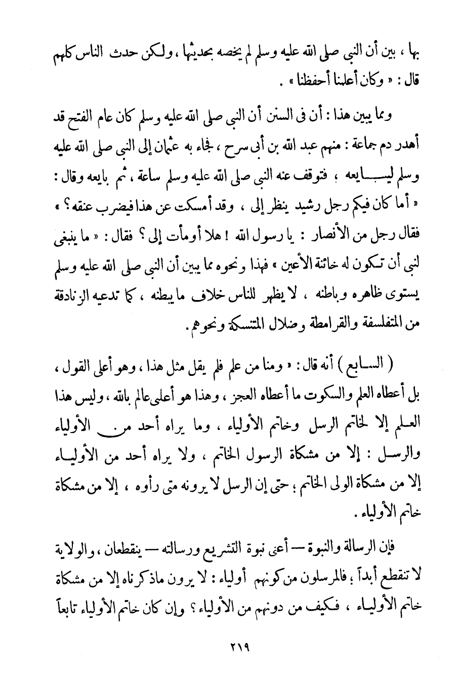 السَّابِعُ: أَنَّهُ قَالَ: " وَمِنَّا مَنْ عَلِمَ فَلَمْ يَقُلْ مِثْلَ هَذَا وَهُوَ أَعْلَى الْقَوْلِ بَلْ أَعْطَاهُ الْعِلْمَ وَالسُّكُوتَ مَا أَعْطَاهُ الْعَجْزَ وَهَذَا هُوَ أَعْلَى عَالِمٍ بِاَللَّهِ وَلَيْسَ هَذَا الْعِلْمُ إلَّا لِخَاتَمِ الرُّسُلِ وَخَاتَمِ الْأَوْلِيَاءِ وَمَا يَرَاهُ أَحَدٌ مِنْ الْأَوْلِيَاءِ وَالرُّسُلِ: إلَّا مِنْ مِشْكَاةِ الرَّسُولِ الْخَاتَمِ وَلَا يَرَاهُ أَحَدٌ مِنْ الْأَوْلِيَاءِ إلَّا مِنْ مِشْكَاةِ الْوَلِيِّ الْخَاتَمِ؛ حَتَّى إنَّ الرُّسُلَ لَا يَرَوْنَهُ مَتَى رَأَوْهُ إلَّا مِنْ مِشْكَاةِ خَاتَمِ الْأَوْلِيَاءِ. فَإِنَّ الرِّسَالَةَ وَالنُّبُوَّةَ - أَعْنِي نُبُوَّةَ التَّشْرِيعِ وَرِسَالَتِهِ - يَنْقَطِعَانِ وَالْوِلَايَةُ لَا تَنْقَطِعُ أَبَدًا؛ فَالْمُرْسَلُونَ مِنْ كَوْنِهِمْ أَوْلِيَاءَ: لَا يَرَوْنَ مَا ذَكَرْنَاهُ إلَّا مِنْ مِشْكَاةِ خَاتَمِ الْأَوْلِيَاءِ فَكَيْفَ مَنْ دُونَهُمْ مِنْ الْأَوْلِيَاءِ؟ وَإِنْ كَانَ خَاتَمُ الْأَوْلِيَاءِ تَابِعًا