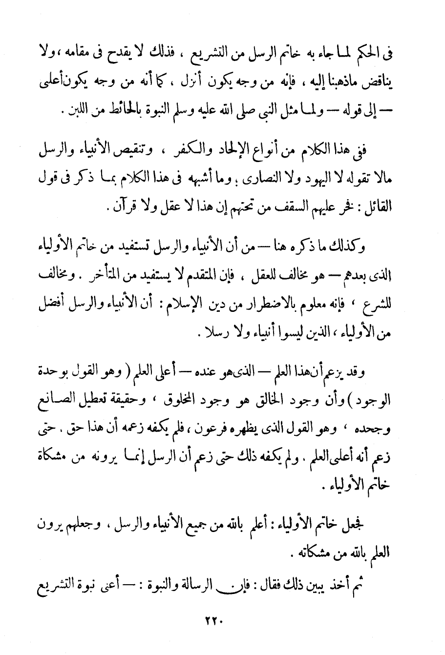 فِي الْحُكْمِ لِمَا جَاءَ بِهِ خَاتَمُ الرُّسُلِ مِنْ التَّشْرِيعِ فَذَلِكَ لَا يَقْدَحُ فِي مَقَامِهِ وَلَا يُنَاقِضُ مَا ذَهَبْنَا إلَيْهِ فَإِنَّهُ مِنْ وَجْهٍ يَكُونُ أَنْزَلَ كَمَا أَنَّهُ مِنْ وَجْهٍ يَكُونُ أَعْلَى - إلَى قَوْلِهِ - وَلَمَّا مَثَّلَ النَّبِيُّ صَلَّى اللَّهُ عَلَيْهِ وَسَلَّمَ النُّبُوَّةَ بِالْحَائِطِ مِنْ اللَّبِنِ. فَفِي هَذَا الْكَلَامِ مِنْ أَنْوَاعِ الْإِلْحَادِ وَالْكُفْرِ وَتَنْقِيصِ الْأَنْبِيَاءِ وَالرُّسُلِ مَا لَا تَقُولُهُ لَا الْيَهُودُ وَلَا النَّصَارَى؛ وَمَا أَشْبَهَهُ فِي هَذَا الْكَلَامِ بِمَا ذَكَرَ فِي قَوْلِ الْقَائِلِ: فَخَرَّ عَلَيْهِمْ السَّقْفُ مِنْ تَحْتِهِمْ أَنَّ هَذَا لَا عَقْلٌ وَلَا قُرْآنٌ. وَكَذَلِكَ مَا ذَكَرَهُ هُنَا - مِنْ أَنَّ الْأَنْبِيَاءَ وَالرُّسُلَ تَسْتَفِيدُ مِنْ خَاتَمِ الْأَوْلِيَاءِ الَّذِي بَعْدَهُمْ - هُوَ مُخَالِفٌ لِلْعَقْلِ فَإِنَّ الْمُتَقَدِّمَ لَا يَسْتَفِيدُ مِنْ الْمُتَأَخِّرِ. وَمُخَالِفٌ لِلشَّرْعِ فَإِنَّهُ مَعْلُومٌ بِالِاضْطِرَارِ مِنْ دِينِ الْإِسْلَامِ: أَنَّ الْأَنْبِيَاءَ وَالرُّسُلَ أَفْضَلُ مِنْ الْأَوْلِيَاءِ الَّذِينَ لَيْسُوا أَنْبِيَاءَ وَلَا رُسُلًا. وَقَدْ يَزْعُمُ أَنَّ الْعِلْمَ - الَّذِي هُوَ عِنْدَهُ - أَعْلَى الْعِلْمِ وَهُوَ الْقَوْلُ بِوَحْدَةِ الْوُجُودِ وَأَنَّ وُجُودَ الْخَالِقِ هُوَ وُجُودُ الْمَخْلُوقِ وَحَقِيقَةُ تَعْطِيلِ الصَّانِعِ وَجَحْدِهِ وَهُوَ الْقَوْلُ الَّذِي يُظْهِرُهُ فِرْعَوْنُ فَلَمْ يَكْفِهِ زَعْمُهُ أَنَّ هَذَا حَقٌّ حَتَّى زَعَمَ أَنَّهُ أَعْلَى الْعِلْمِ وَلَمْ يَكْفِهِ ذَلِكَ حَتَّى زَعَمَ أَنَّ الرُّسُلَ إنَّمَا يَرَوْنَهُ مِنْ مِشْكَاةِ خَاتَمِ الْأَوْلِيَاءِ. فَجَعَلَ خَاتَمَ الْأَوْلِيَاءِ أَعْلَمَ بِاَللَّهِ مِنْ جَمِيعِ الْأَنْبِيَاءِ وَالرُّسُلِ وَجَعَلَهُمْ يَرَوْنَ الْعِلْمَ بِاَللَّهِ مِنْ مِشْكَاتِهِ. ثُمَّ أَخَذَ يُبَيِّنُ ذَلِكَ فَقَالَ: فَإِنَّ الرِّسَالَةَ وَالنُّبُوَّةَ: - أَعْنِي نُبُوَّةَ التَّشْرِيعِ وَرِسَالَتَهُ -
