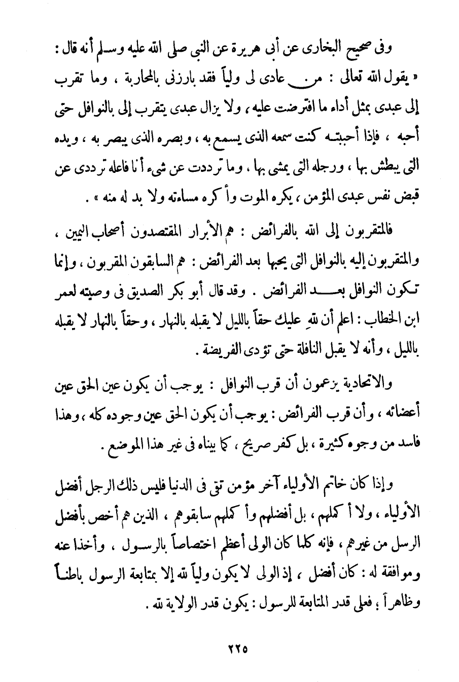 وَفِي صَحِيحِ الْبُخَارِيِّ عَنْ أَبِي هُرَيْرَةَ عَنْ النَّبِيِّ صَلَّى اللَّهُ عَلَيْهِ وَسَلَّمَ أَنَّهُ قَالَ: {يَقُولُ اللَّهُ تَعَالَى: مَنْ عَادَى لِي وَلِيًّا فَقَدْ بَارَزَنِي بِالْمُحَارَبَةِ وَمَا تَقَرَّبَ إلَيَّ عَبْدِي بِمِثْلِ أَدَاءِ مَا افْتَرَضْت عَلَيْهِ وَلَا يَزَالُ عَبْدِي يَتَقَرَّبُ إلَيَّ بِالنَّوَافِلِ حَتَّى أُحِبَّهُ فَإِذَا أَحْبَبْته كُنْت سَمْعَهُ الَّذِي يَسْمَعُ بِهِ وَبَصَرَهُ الَّذِي يُبْصِرُ بِهِ وَيَدَهُ الَّتِي يَبْطِشُ بِهَا وَرِجْلَهُ الَّتِي يَمْشِي بِهَا وَمَا تَرَدَّدْت عَنْ شَيْءٍ أَنَا فَاعِلُهُ تَرَدُّدِي عَنْ قَبْضِ نَفْسِ عَبْدِي الْمُؤْمِنِ يَكْرَهُ الْمَوْتَ وَأَكْرَهُ مَسَاءَتَهُ وَلَا بُدَّ لَهُ مِنْهُ} . فالمتقربون إلَى اللَّهِ بِالْفَرَائِضِ: هُمْ الْأَبْرَارُ الْمُقْتَصِدُونَ أَصْحَابُ الْيَمِينِ والمتقربون إلَيْهِ بِالنَّوَافِلِ الَّتِي يُحِبُّهَا بَعْدَ الْفَرَائِضِ. هُمْ السَّابِقُونَ الْمُقَرَّبُونَ وَإِنَّمَا تَكُونُ النَّوَافِلُ بَعْدَ الْفَرَائِضِ. وَقَدْ قَالَ أَبُو بَكْرٍ الصَّدِيقُ فِي وَصِيَّتِهِ لِعُمَرِ ابْنِ الْخَطَّابِ: اعْلَمْ أَنَّ لِلَّهِ عَلَيْك حَقًّا بِاللَّيْلِ لَا يَقْبَلُهُ بِالنَّهَارِ وَحَقًّا بِالنَّهَارِ لَا يَقْبَلُهُ بِاللَّيْلِ وَأَنَّهُ لَا يَقْبَلُ النَّافِلَةَ حَتَّى تُؤَدِّيَ الْفَرِيضَةَ. والاتحادية يَزْعُمُونَ أَنَّ قُرْبَ النَّوَافِلِ: يُوجِبُ أَنْ يَكُونَ عَيْنُ الْحَقِّ عَيْنَ أَعْضَائِهِ وَأَنَّ قُرْبَ الْفَرَائِضِ: يُوجِبُ أَنْ يَكُونَ الْحَقُّ عَيْنَ وُجُودِهِ كُلِّهِ وَهَذَا فَاسِدٌ مِنْ وُجُوهٍ كَثِيرَةٍ بَلْ كُفْرٌ صَرِيحٌ كَمَا بَيَّنَاهُ فِي غَيْرِ هَذَا الْمَوْضِعِ. وَإِذَا كَانَ خَاتَمُ الْأَوْلِيَاءِ آخِرُ مُؤْمِنٍ تَقِيٍّ فِي الدُّنْيَا فَلَيْسَ ذَلِكَ الرَّجُلُ أَفْضَلَ الْأَوْلِيَاءِ وَلَا أَكْمَلَهُمْ بَلْ أَفْضَلُهُمْ وَأَكْمَلُهُمْ سَابِقُوهُمْ الَّذِينَ هُمْ أَخَصُّ بِأَفْضَلِ الرُّسُلِ مِنْ غَيْرِهِمْ فَإِنَّهُ كُلَّمَا كَانَ الْوَلِيُّ أَعْظَمَ اخْتِصَاصًا بِالرَّسُولِ وَأَخْذًا عَنْهُ وَمُوَافَقَةً لَهُ: كَانَ أَفْضَلَ إذْ الْوَلِيُّ لَا يَكُونُ وَلِيًّا لِلَّهِ إلَّا بِمُتَابَعَةِ الرَّسُولِ بَاطِنًا وَظَاهِرًا؛ فَعَلَى قَدْرِ الْمُتَابَعَةِ لِلرَّسُولِ: يَكُونُ قَدْرُ الْوِلَايَةِ لِلَّهِ.