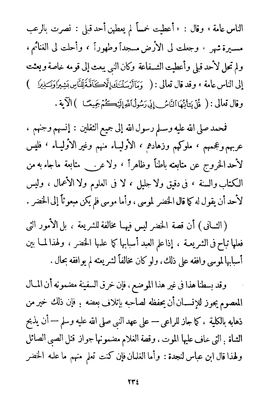 النَّاسِ عَامَّةً} وَقَالَ: {أُعْطِيت خَمْسًا لَمْ يُعْطَهُنَّ أَحَدٌ قَبْلِي: نُصِرْت بِالرُّعْبِ مَسِيرَةَ شَهْرٍ وَجُعِلَتْ لِي الْأَرْضُ مَسْجِدًا وَطَهُورًا وَأُحِلَّتْ لِي الْغَنَائِمُ وَلَمْ تَحِلّ لِأَحَدِ قَبْلِي وَأُعْطِيت الشَّفَاعَةَ وَكَانَ النَّبِيُّ يُبْعَثُ إلَى قَوْمِهِ خَاصَّةً وَبُعِثْت إلَى النَّاسِ عَامَّةً} وَقَدْ قَالَ تَعَالَى: {وَمَا أَرْسَلْنَاكَ إلَّا كَافَّةً لِلنَّاسِ بَشِيرًا وَنَذِيرًا} وَقَالَ تَعَالَى: {قُلْ يَا أَيُّهَا النَّاسُ إنِّي رَسُولُ اللَّهِ إلَيْكُمْ جَمِيعًا} الْآيَةَ. فَمُحَمَّدٌ صَلَّى اللَّهُ عَلَيْهِ وَسَلَّمَ رَسُولُ اللَّهِ إلَى جَمِيعِ الثَّقَلَيْنِ: إنْسِهِمْ وَجِنِّهِمْ عَرِبِهِمْ وَعَجَمِهِمْ مُلُوكِهِمْ وَزُهَّادِهِمْ الْأَوْلِيَاءِ مِنْهُمْ وَغَيْرِ الْأَوْلِيَاءِ فَلَيْسَ لِأَحَدِ الْخُرُوجُ عَنْ مُتَابَعَتِهِ بَاطِنًا وَظَاهِرًا وَلَا عَنْ مُتَابَعَةِ مَا جَاءَ بِهِ مِنْ الْكِتَابِ وَالسُّنَّةِ فِي دَقِيقٍ وَلَا جَلِيلٍ لَا فِي الْعُلُومِ وَلَا الْأَعْمَالِ وَلَيْسَ لِأَحَدِ أَنْ يَقُولَ لَهُ كَمَا قَالَ الْخَضِرُ لِمُوسَى وَأَمَّا مُوسَى فَلَمْ يَكُنْ مَبْعُوثًا إلَى الْخَضِرِ.